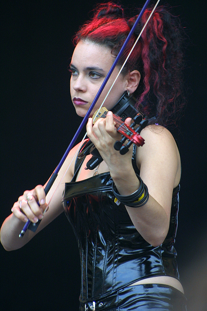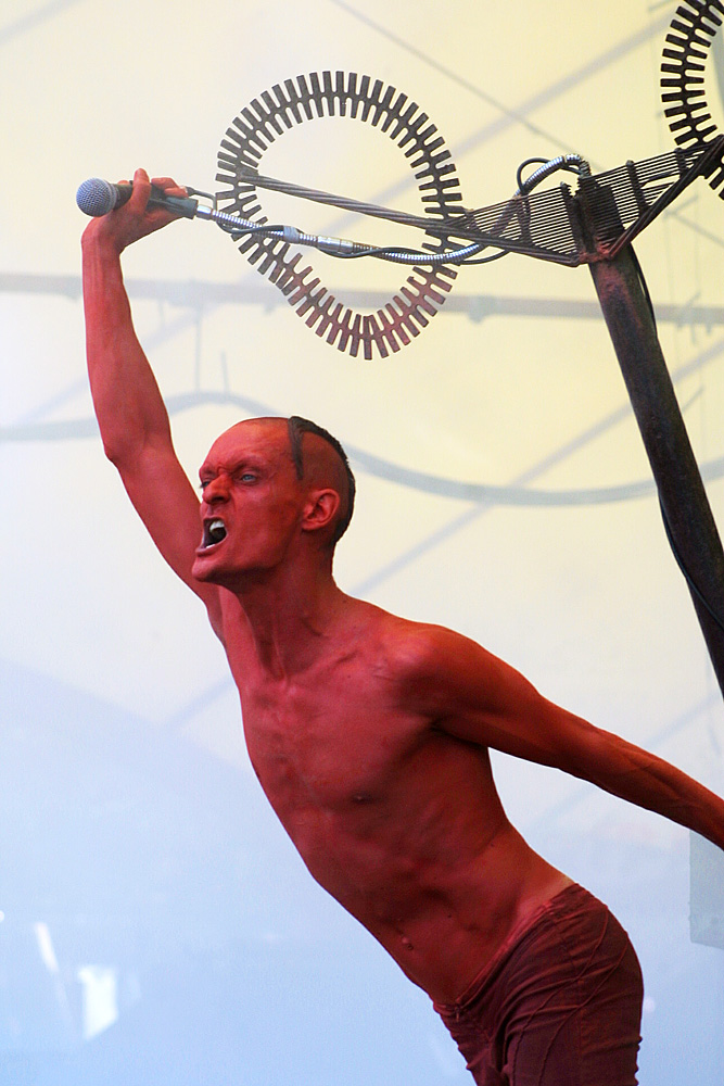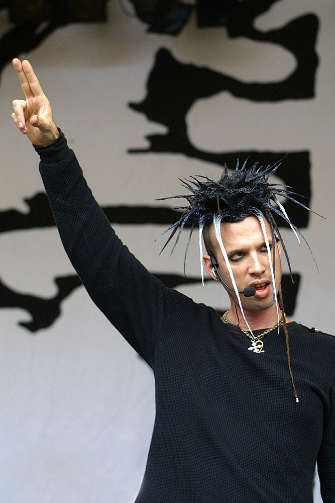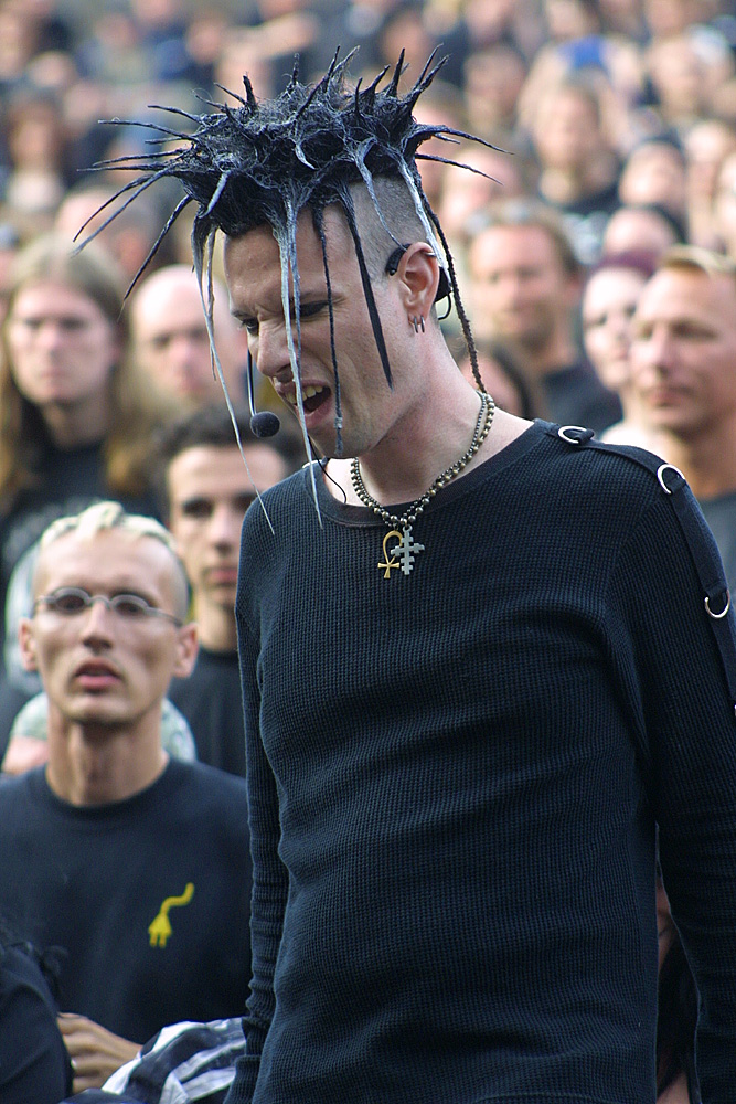 Stefan von „Das Ich“ nahm dämonisch rot geschminkt und wie immer in teuflisch anmutenden Verrenkungen die Bühne in Besitz. Kraftvoll und ausdrucksstark drängte sich seine Stimme in unsere Köpfe. Stefan nutzte den Auftritt für einen Appell an uns alle. Es waren drei Wünsche. Der Erste, dass die Rechten verschwänden. Neonazis brauche kein Mensch. Kann ich nur zustimmen. Wenn auch die Hintergründe und das „wem-nutzt-es“ ein weites Feld sind. Der zweite Wunsch bezog sich auf das Zillo, auf die 15 Jahre des Zillo, die Treue, und den wachsenden Mainstream. Ja, schon… aber wenn uns Musik gefällt, dann wollen wir sie auch hören. Zwangsläufig sind Produktion und Vermarktung von CDs letztendlich Kommerz. Und ohne die Bands, die man zum Mainstram zählt, wäre kein Festival realisierbar. Suchen und finden wir den Kompromiss – Zillo 2004 war eine sehr gute Mischung (meiner Meinung nach). Stefans dritter Wunsch war: „Auch die Tiere haben das Recht zu leben.“ Ja, man kann das für sich persönlich entscheiden. Um weltweit den Tieren das Recht zuzugestehen – da müsste die Menschheit sehr menschlich werden. Was nicht zu erwarten ist.