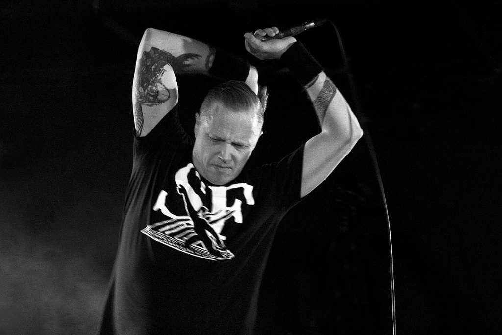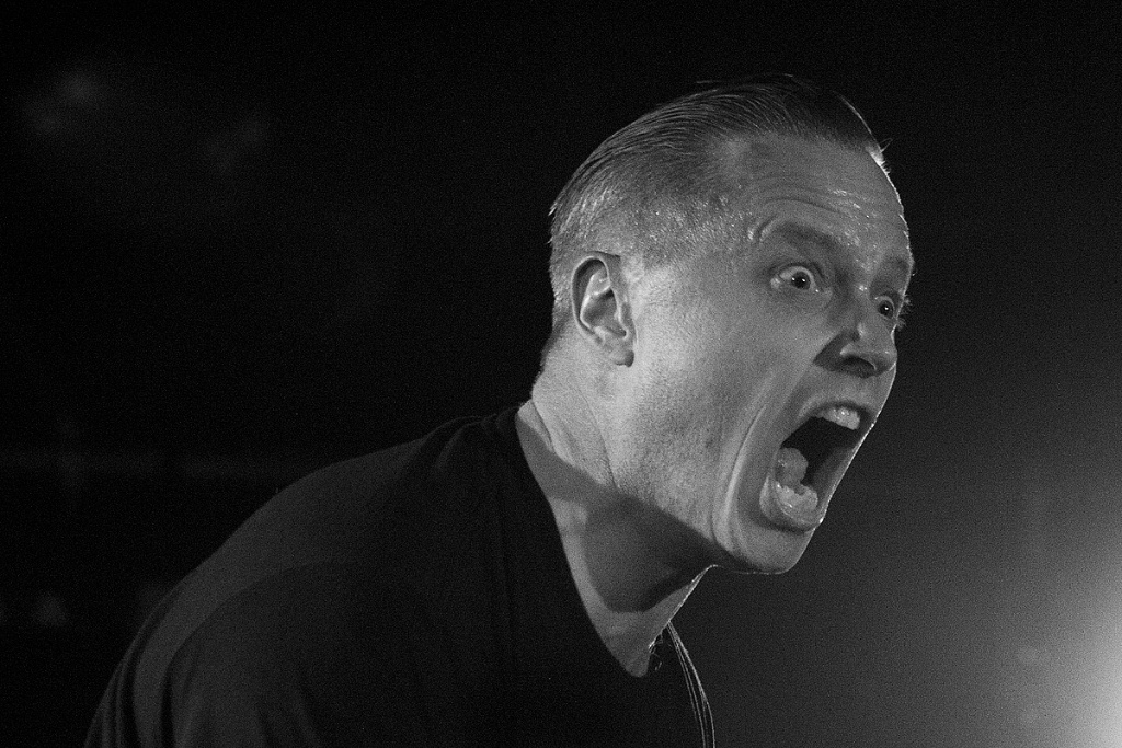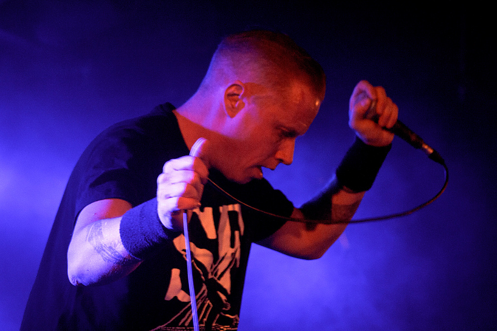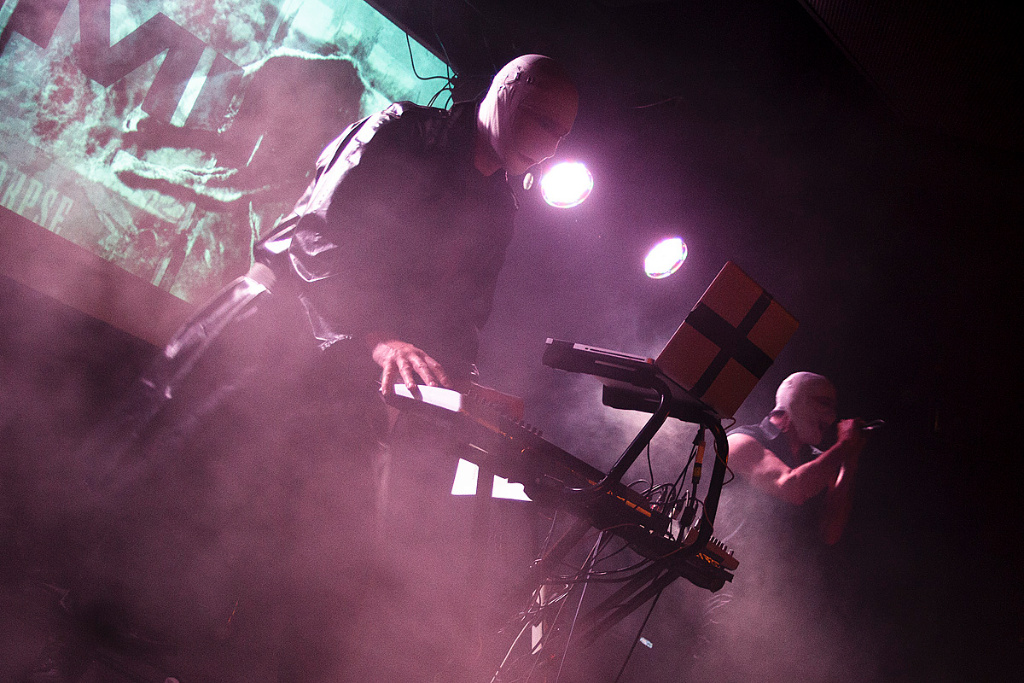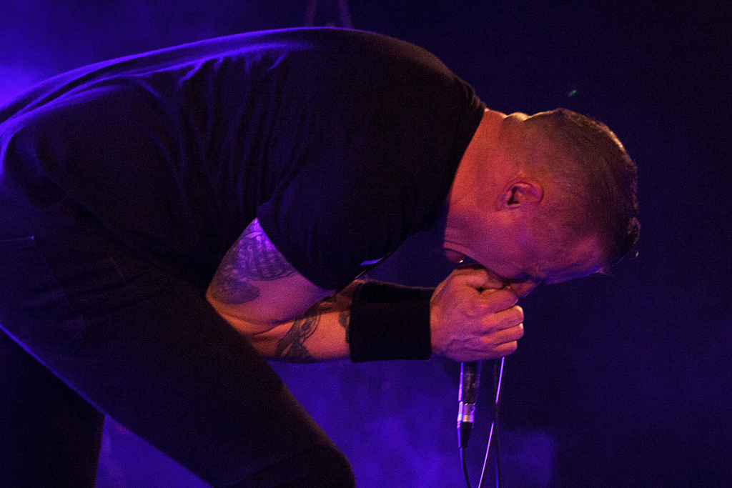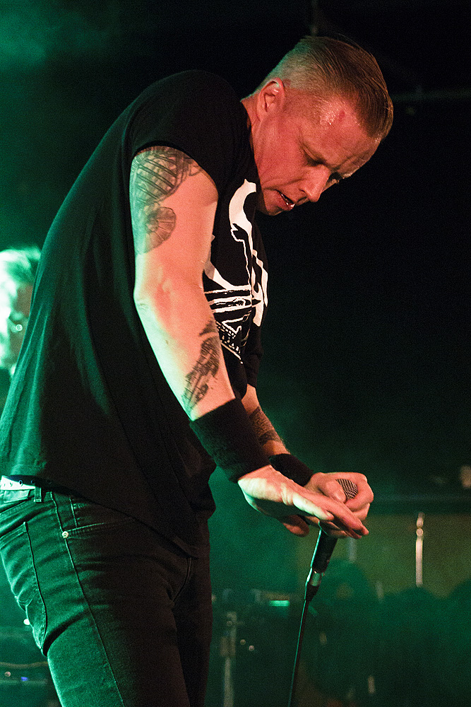 So war die Veranstaltung restlos ausverkauft und der Berliner Club „Bi Nuu“ bereits bei der Vorgruppe „No Sleep By The Machine“ sehr gut gefüllt. Und die skandinavische Band konnte sogleich viel Aufmerksamkeit auf sich ziehen. Zu Recht. Verstanden es die drei Schweden doch, eine musikalische Spannung aufzubauen. Kein einfallsloses Gestampfe, sondern Rhythmik mit Atmosphäre und Detailreichtum, was für den intensiven Hörer so manche Entdeckung bereithielt und -hält. Interessant beispielsweise die rau klingenden Percussions bei dem Titel „Yellow mica“. Dazu eine eingängige Melodieführung, die sich im Kopf festsetzt. „No Sleep By The Machine“ stehen für einen differenzierten Sound, ganz in der Tradition solch wegweisender Bands wie „Skinny Puppy“ und „The Klinik“. Im Mittelpunkt Sänger TB, der voller Leidenschaft und gestenreich das Dargebotene unterstrich. Mit intensivem, durchdringendem Blick musterte er jeden Einzelnen in der ersten Reihe. Überaus energisch vorgetragen konnten die mal direkteren, mal komplexeren Strukturen begeistern. Ein grandioses Konzert, das schon vor dem Höhepunkt des Abends für viel Freude sorgte.