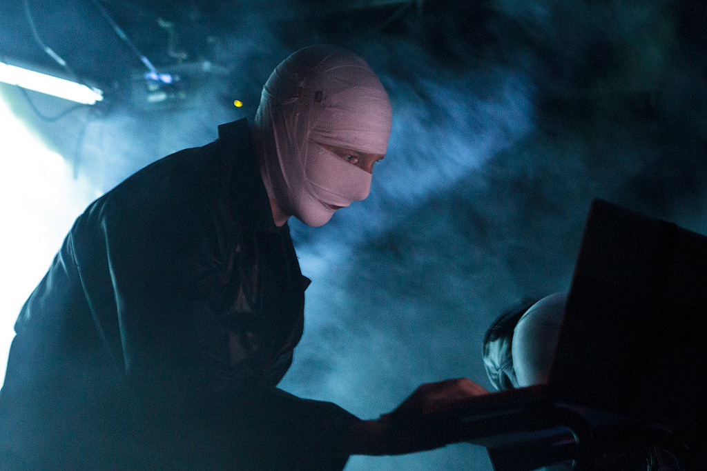 Nachdem alles für den Auftritt von „The Klinik“ bereit stand, vergingen endlose 30 Minuten, in denen eine Augenoperation auf die Hintergrundwand projiziert wurde (Bilder, die wohl nur wenige mit großer Begeisterung betrachteten), ehe endlich Dirk Ivens und Peter Mastbooms – traditionell in schwarze, lange Mäntel gekleidet und die Köpfe mit Mullbinden bandagiert – die Bühne betraten. Durch die Verhüllung wirkten die beiden Protagonisten alterslos. Als wäre seit dem ersten Auftritt von „The Klinik“ nicht über ein Vierteljahrhundert vergangen.