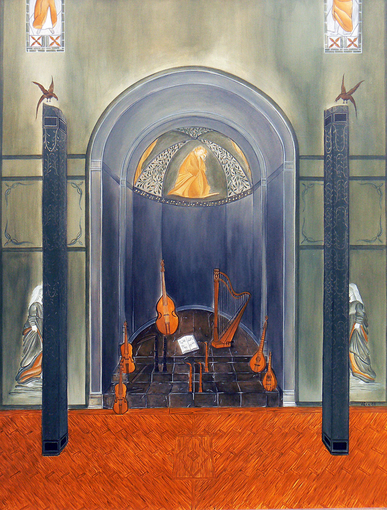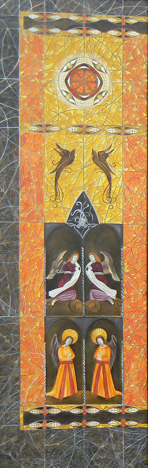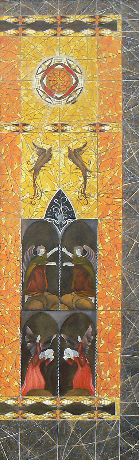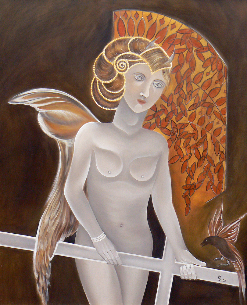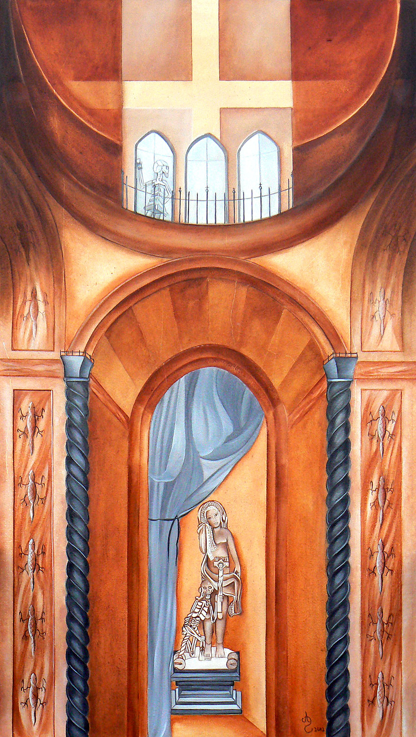 „Die heutige Thematik ist religiösen Ursprungs, gepaart mit Symbolik und Realismus. Im Laufe der Zeit habe ich mich auf sakrale Gemälde spezialisiert. Als leidenschaftliche Sammlerin von Kuriositäten und Antiquitäten verbringe ich gerne Zeit auf dem Flohmarkt. So manch erstandene Figur oder Gegenständliches aus dem Flohmarktfundus findet sich in meinen Bildern wieder. Auch bediene ich mich gerne der Natur und ihrer Vielfältigkeit, oder einem Gang durch den Garten. Wandmalerei, Ornamente, sowie dekorative Gestaltung gehören auch zu meinen Arbeiten.“