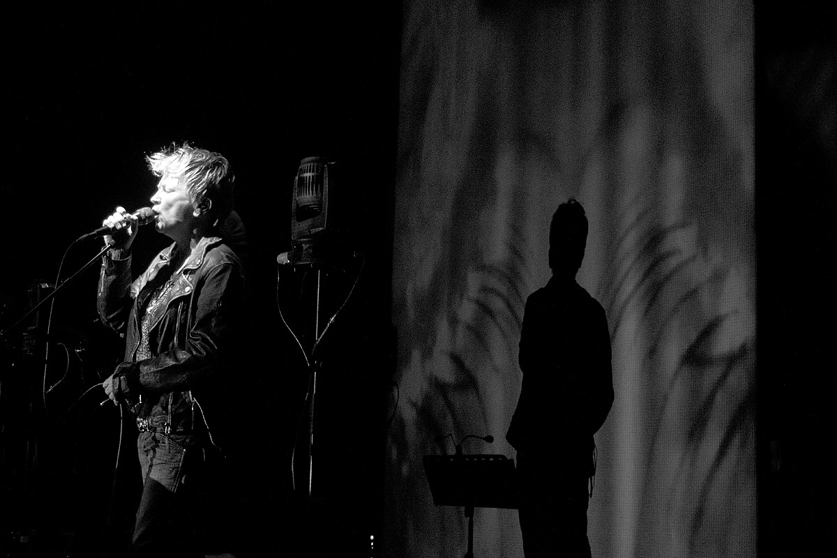 Bevor die Saalbeleuchtung ausging, überwog indes die Vorfreude auf ein mitreißendes Konzert. Trat Anne Clark vor einigen Monaten noch mit kompletter Band auf, präsentierte sich die Bühne diesmal deutlich spartanischer. Einzig zwei Podeste – auf einem stand die elektronische Ausstattung von herrB – und drei Mikrophone füllten die geräumige Bühne. Zurück zu den elektronischen Wurzeln? In gewisser Weise. Wobei Anne Clark in ihrer langen Karriere nach Ausflügen in den Bereich der „handgemachten“ Musik immer wieder zur elektronischen Klangerzeugnis zurückfand. Diesmal wurden die Stücke in ein relativ „modernes“ Gewand gehüllt. Die Skepsis, ob dies beim Publikum ankommen möge, zerstreute sich schnell, nachdem ein instrumentales Intro einsetzte, die Licht- und Videoshow von Lichtdesigner Rick Kay startete und die beiden Musiker als Schattenrisse auftauchten.