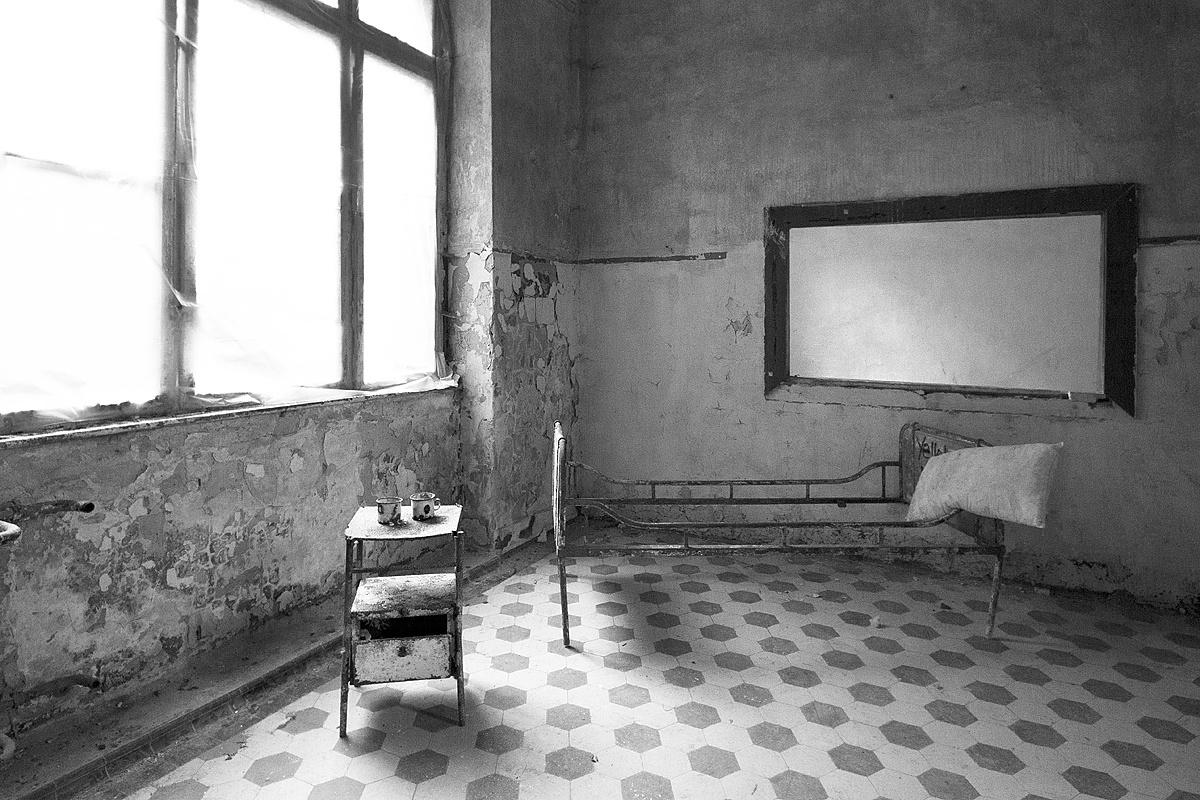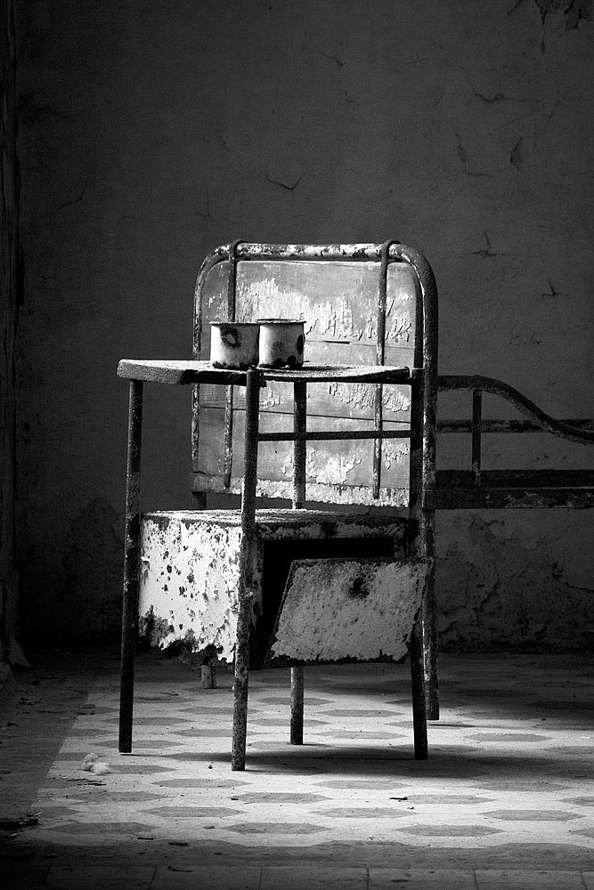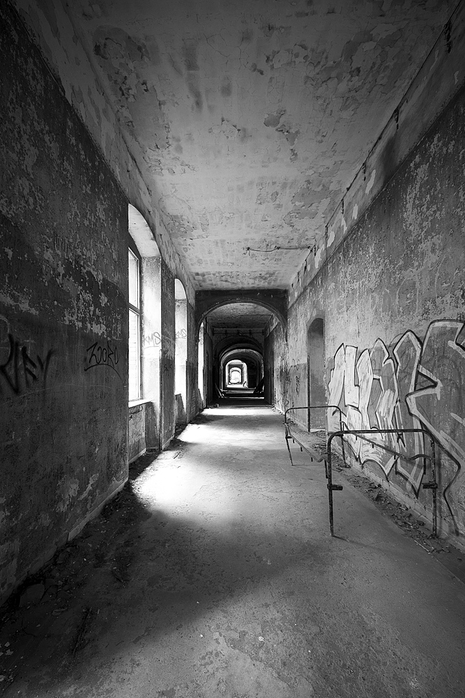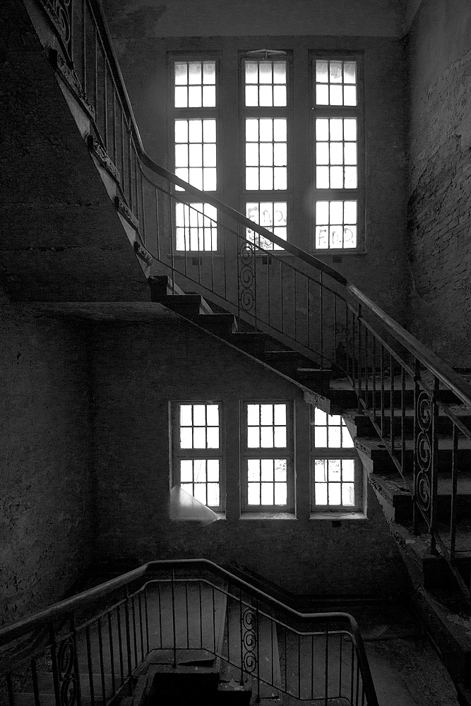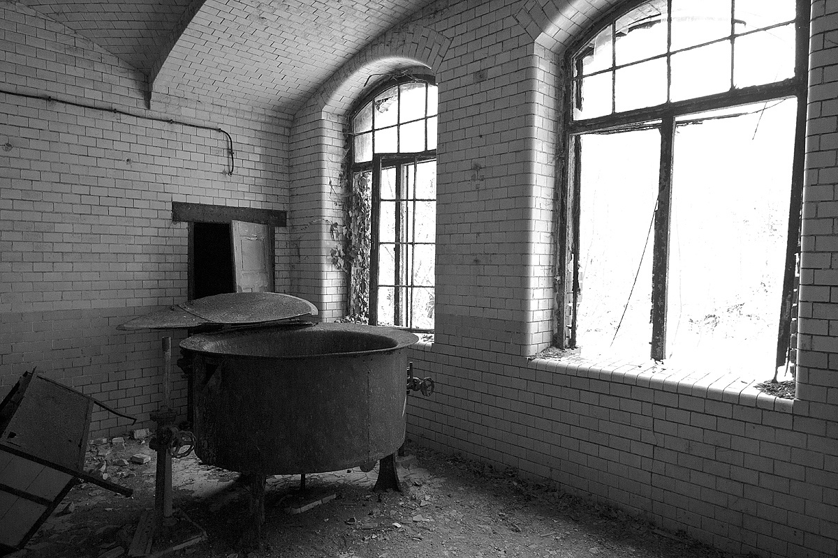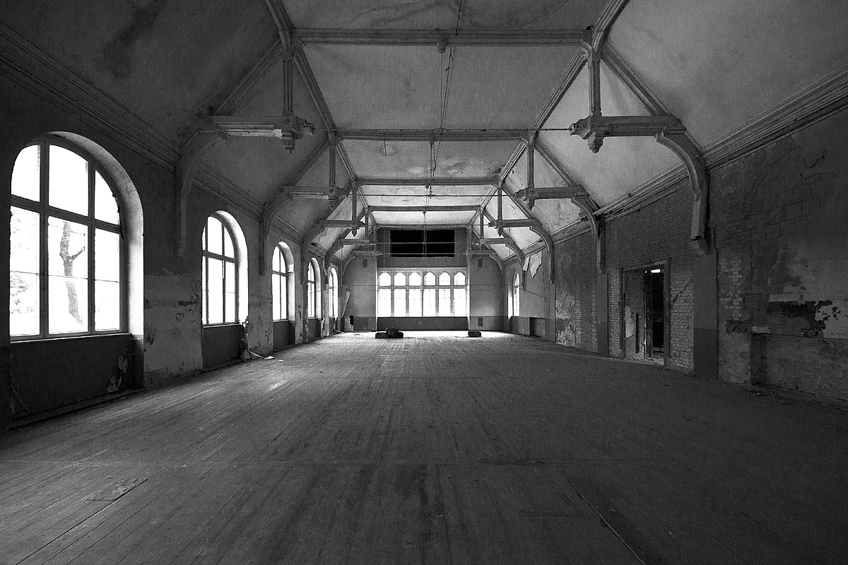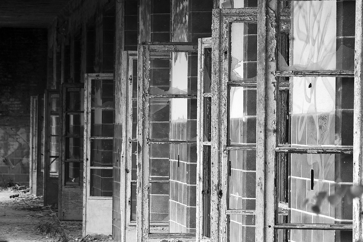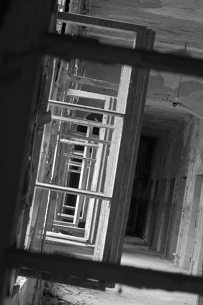 Aber auch an anderen Orten wird die Kraft der Natur sichtbar: In einem riesigen Saal steht im Erker ein dickstämmiger Baum. Ebenso ist die Deckenkonstruktion mit groß dimensionierten Trägern ein Blickfang. Beachtlich! Hier und da findet man in den Fluren und Räumen noch Spuren der russischen Nutzung: das Gerippe eines eisernen Bettgestells, verbogene Beistelltische, verrottete Holzklappsitze sind willkommene Fotomotive und erinnern an eine „vergessene“ Zeit. Raum reiht sich an Raum. Obere Etagen sind nicht immer begehbar. Ein Zimmer mit gelb lasierten Klinkern diente wahrscheinlich als Baderaum. Ein anderer Saal mit halbrund angeordneten flachen Stufen dürfte man als kleines Theater genutzt haben. Eine Miniaturbühne und Klappstuhlreihen lassen Phantasien keimen: was mag an jener Stelle aufgeführt worden sein? Ein weiteres Gebäude wurde später – etwa 1930 – errichtet. Endlos lange Terrassen für die Sommerkuren liegen still im matten Sonnenlicht. Inklusive grüner Aussicht. Denn auch hier haben sich kleine Birken angesiedelt. Gruselig wirkt der große leere Fahrstuhlschacht. Imponierend hingegen ist die durchgehende Fensterfront.