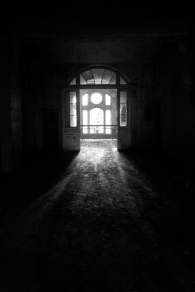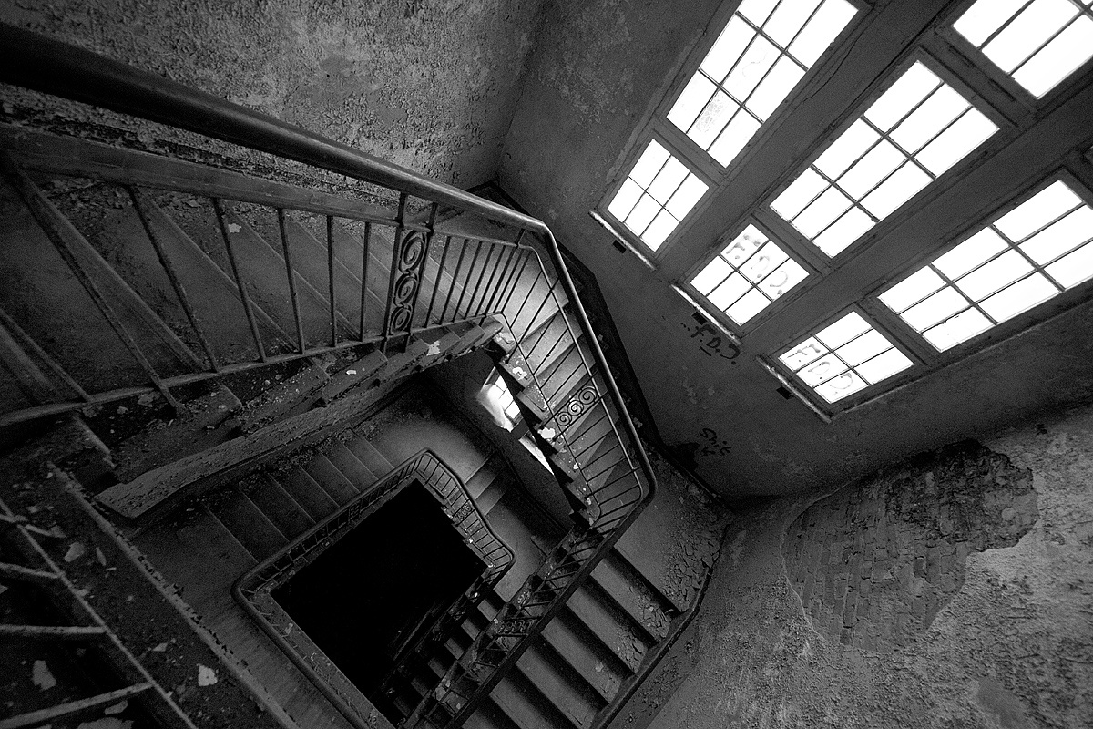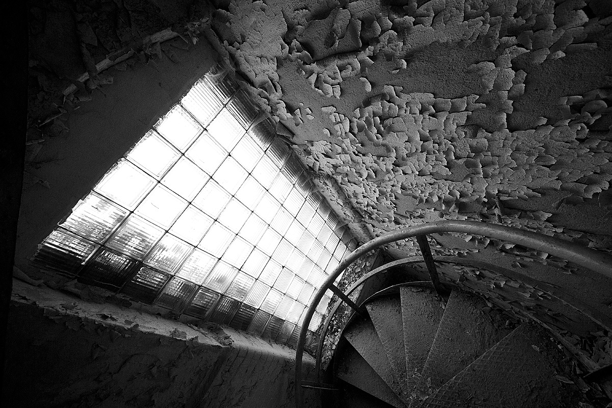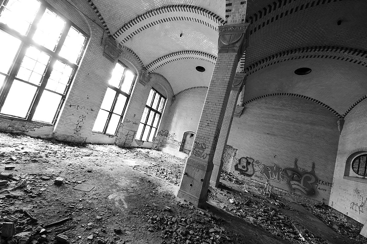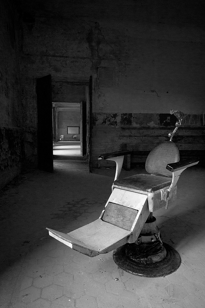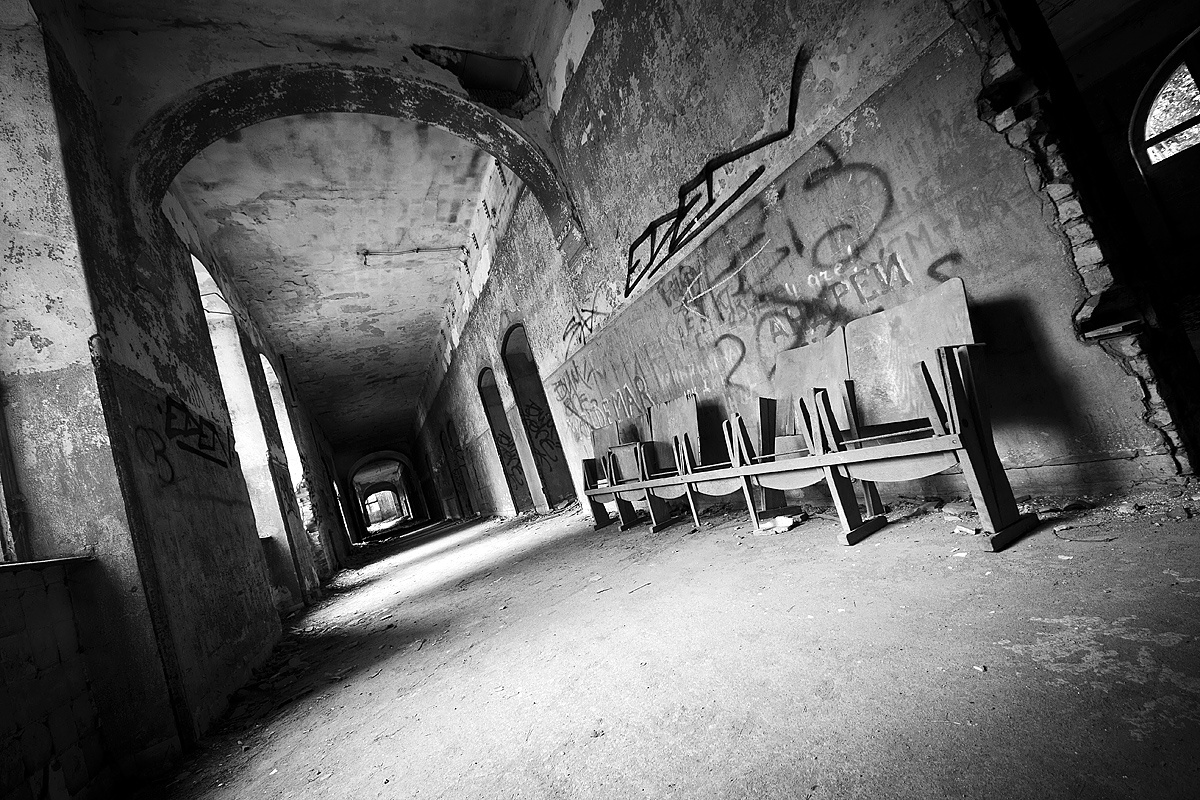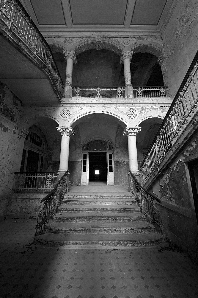 Aber auch an anderen Orten wird die Kraft der Natur sichtbar: In einem riesigen Saal steht im Erker ein dickstämmiger Baum. Ebenso ist die Deckenkonstruktion mit groß dimensionierten Trägern ein Blickfang. Beachtlich! Hier und da findet man in den Fluren und Räumen noch Spuren der russischen Nutzung: das Gerippe eines eisernen Bettgestells, verbogene Beistelltische, verrottete Holzklappsitze sind willkommene Fotomotive und erinnern an eine „vergessene“ Zeit. Raum reiht sich an Raum. Obere Etagen sind nicht immer begehbar. Ein Zimmer mit gelb lasierten Klinkern diente wahrscheinlich als Baderaum. Ein anderer Saal mit halbrund angeordneten flachen Stufen dürfte man als kleines Theater genutzt haben. Eine Miniaturbühne und Klappstuhlreihen lassen Phantasien keimen: was mag an jener Stelle aufgeführt worden sein? Ein weiteres Gebäude wurde später – etwa 1930 – errichtet. Endlos lange Terrassen für die Sommerkuren liegen still im matten Sonnenlicht. Inklusive grüner Aussicht. Denn auch hier haben sich kleine Birken angesiedelt. Gruselig wirkt der große leere Fahrstuhlschacht. Imponierend hingegen ist die durchgehende Fensterfront.