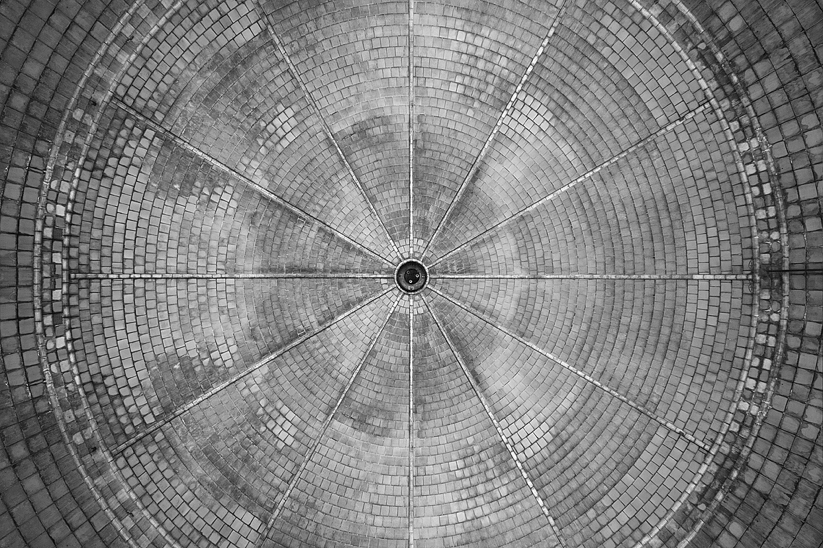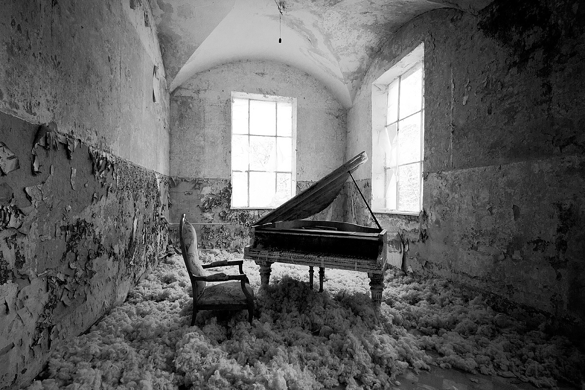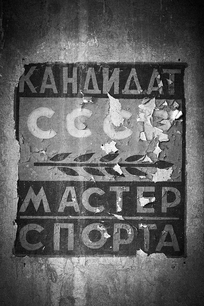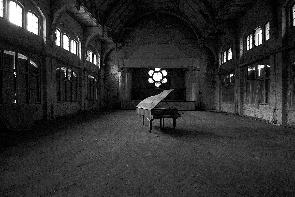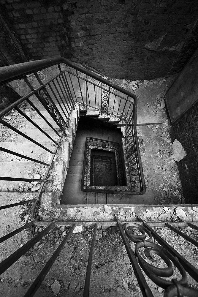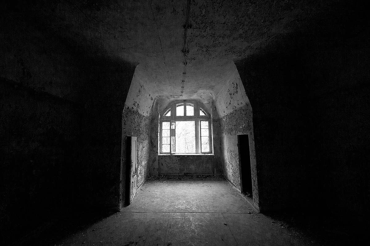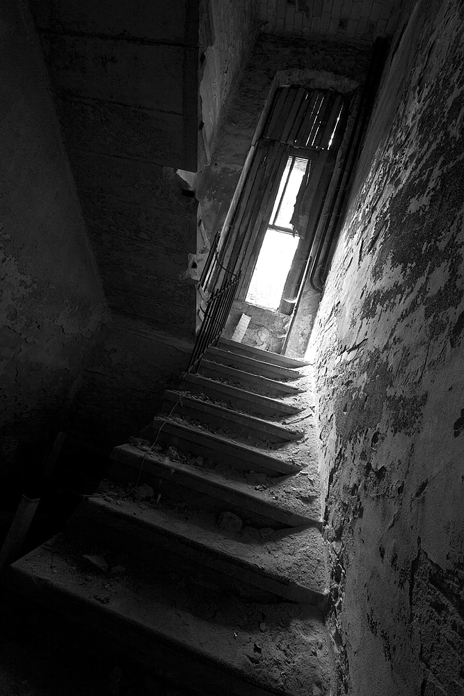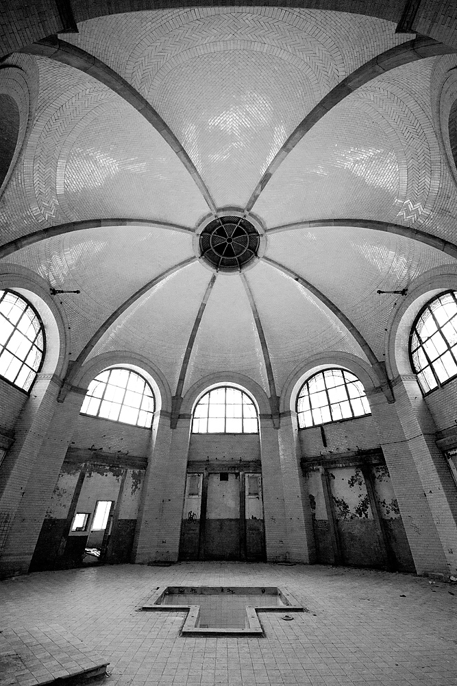 Aber auch an anderen Orten wird die Kraft der Natur sichtbar: In einem riesigen Saal steht im Erker ein dickstämmiger Baum. Ebenso ist die Deckenkonstruktion mit groß dimensionierten Trägern ein Blickfang. Beachtlich! Hier und da findet man in den Fluren und Räumen noch Spuren der russischen Nutzung: das Gerippe eines eisernen Bettgestells, verbogene Beistelltische, verrottete Holzklappsitze sind willkommene Fotomotive und erinnern an eine „vergessene“ Zeit. Raum reiht sich an Raum. Obere Etagen sind nicht immer begehbar. Ein Zimmer mit gelb lasierten Klinkern diente wahrscheinlich als Baderaum. Ein anderer Saal mit halbrund angeordneten flachen Stufen dürfte man als kleines Theater genutzt haben. Eine Miniaturbühne und Klappstuhlreihen lassen Phantasien keimen: was mag an jener Stelle aufgeführt worden sein? Ein weiteres Gebäude wurde später – etwa 1930 – errichtet. Endlos lange Terrassen für die Sommerkuren liegen still im matten Sonnenlicht. Inklusive grüner Aussicht. Denn auch hier haben sich kleine Birken angesiedelt. Gruselig wirkt der große leere Fahrstuhlschacht. Imponierend hingegen ist die durchgehende Fensterfront.
