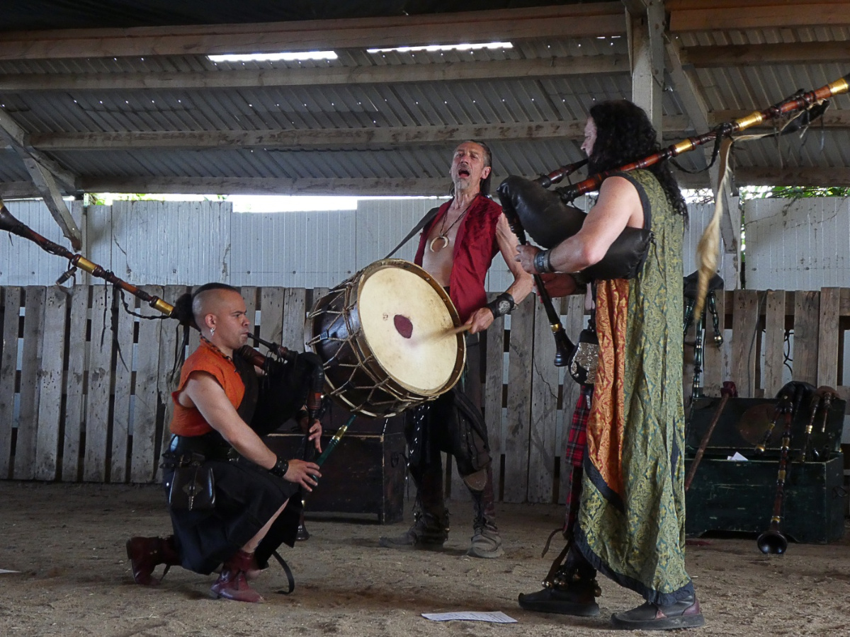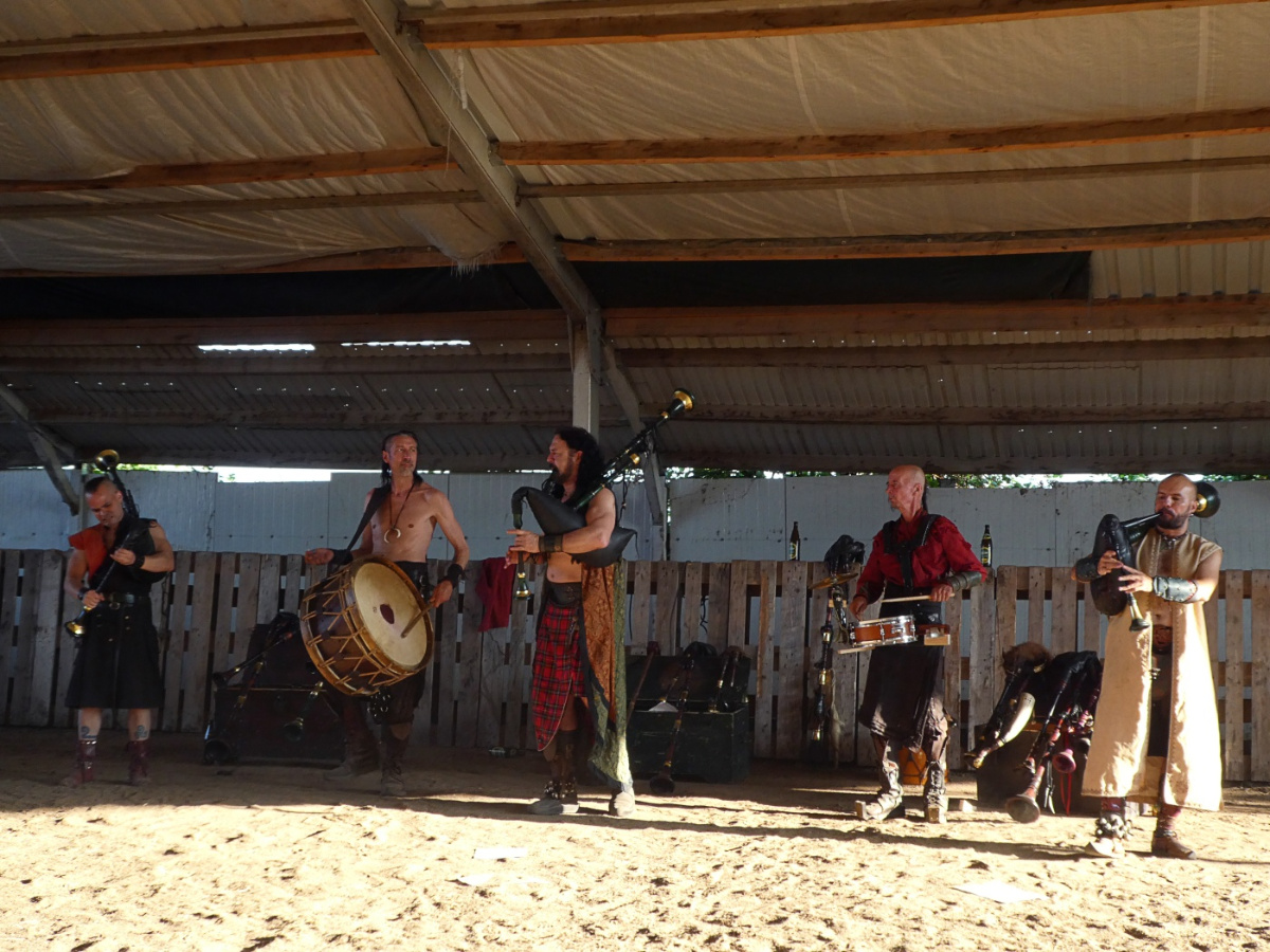 Bereits nach dem ersten Lied gab Castus Rabensang bekannt, dass der sommerliche Konzertabend eine Reise durch über 2000 Jahre Musikgeschichte und somit ein Best-of-Set der Band werden sollte. Die großen Pauken und Kessel wurden im heimischen Proberaum gelassen, dafür reisten die Spielleute mit Sackpfeifen, Schalmeien, Hörnern, kleinen Pauken und anderem Schlagwerk an. Sie gaben Lieder wie „Chou Chou Sheng“, „Sverker“, „Mille Anni Passi Sunt“, „Itenka“ und „Urmawi“ mit gewohnter Spielfreude zum Besten. Die derben und doppeldeutigen Ansagen, wie sie bei jedem Mittelaltermarkt auf den Burgen und Schlössern des Landes zu hören sind, durften nicht fehlen. Und trotz der Hygienevorgaben und dem hauptsächlich auf mit Abstand platzierten Bierbänken sitzendem Publikum kam eine ausgelassene Stimmung auf. Alle klatschten energisch mit, huldigten Soli und besonders beliebte Stücke mit lauten Freudenrufen. Und es wurde mitgesungen. So zum Beispiel beim mächtigen und treibenden „Venus Vina Musica“, beim süffigen „Herr Wirt“ und ebenso beim „La la la la la la“-Refrain von „In Taberna“. Neben bekanntem Material wurden neue Stücke gespielt. Wie das bisher unveröffentlichte „In Taberna Secundus“ oder die beiden Stücke „Die Veitztänzer von Corvus Corax“ und „Hymnus des Roten Todes“ vom zuletzt erschienenen Album „Die Maske des Roten Todes“. Auch „Cheiron“, die Hymne an den Gott der Centauren, durfte in diesem ländlichen Ambiente nicht fehlen.