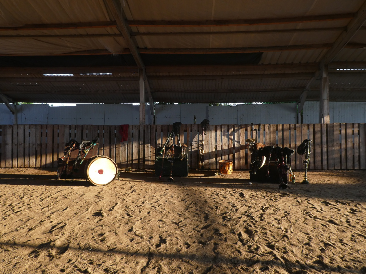 Bereits die Anreise gestaltete sich abenteuerlich, war doch der vorgelagerte Betriebshof, der als Parkplatz fungierte, nur mit dem Navi auffindbar. Vom Auto zum eigentlichen Veranstaltungsort führte ein eher unscheinbarer Weg. Doch als das Holzschild mit dem Schriftzug „Kuschelfarm“ zu sehen war, wussten wir, dass wir am richtigen Ort angekommen waren. Wir wurden warmherzig und freundlich am Einlass empfangen und auch für das leibliche Wohl wurde gesorgt. Hervorzuheben sind die selbstgemachten Crêpes, die Limonaden aus eigener Herstellung und die Lockerheit der Helfenden. Frisch gestärkt und in Begleitung des Geschnatters von Gänsen und dem Duft der Pferdewiese ging es zur Scheune. Dort standen bereits die Instrumentenkisten von „Corvus Corax“, den „Königen der Spielleute“ bereit.
