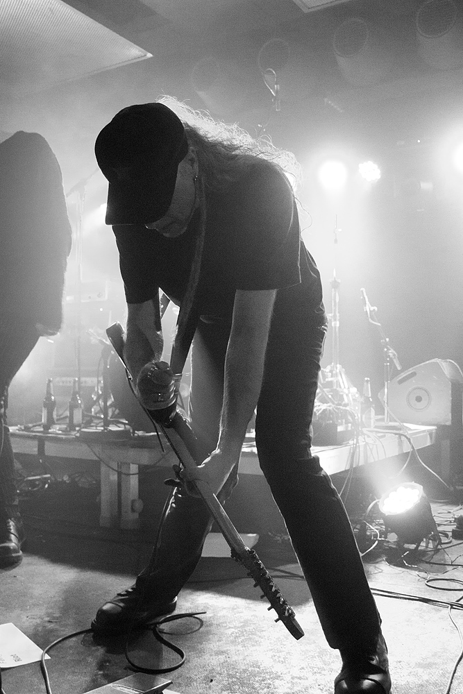 Setlisten mit recht groß gedruckten Buchstaben wurden auf der Bühne verstreut. Es sollte wohl eine etwas „ältere“ Band folgen. Die Mannen von „Golden Apes“ nahmen ihre Positionen ein. Christian Lebrecht mit seinem Bass, verziert mit einem mächtigen roten Abbild eines Revolvers unübersehbar. Sänger Peer Lebrecht, noch abgewandt, wirkte abwesend und beinahe schüchtern. Symbol und Halt zugleich Zigarette und Flasche. In kurzen Gesangspausen hockte er auf dem Podest des Schlagzeugs – in sich ruhend. Als gäbe es nur ihn allein. Düster-melancholisch sind die Texte und die Musik. Und Peer bringt diese eindringlich mit seiner warmen sonoren Stimme herüber, wodurch die Zuhörer zwangsläufig in diesen faszinierenden Strudel voller Traurigkeit hineingezogen werden. Trotz aller Dunkelheit haben wir das Konzert genossen und unseren Bewegungsdrang ausgelebt.