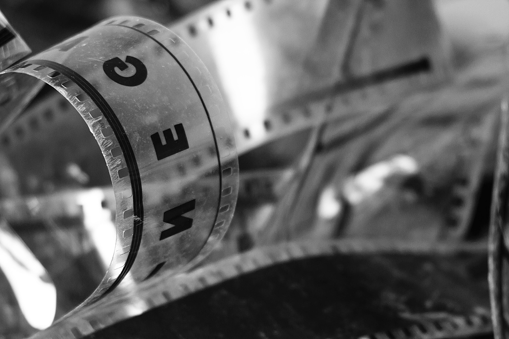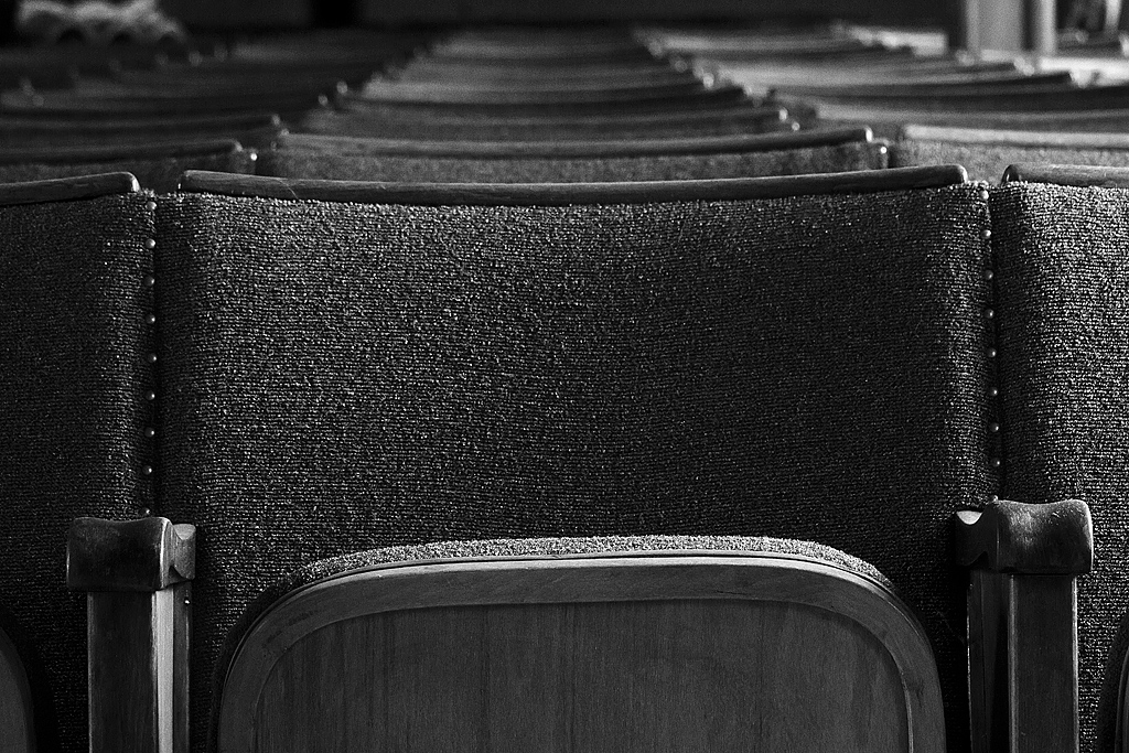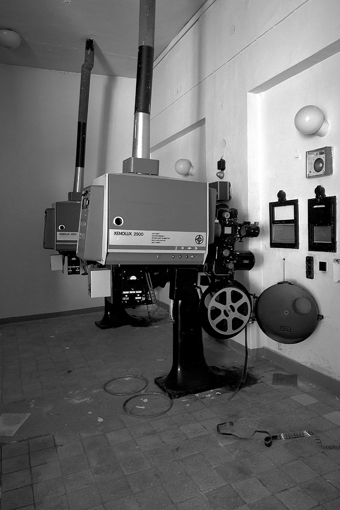 Am hinteren Ende des Saals – über einer Galerie, auf der weitere Reihen mit Klappstühlen angeordnet sind – erkennt man die Öffnungen für die Projektion von Filmen. Im zweiten Geschoss finden wir den Zugang zum Projektionsraum. Die gewaltigen Projektoren stehen ungerührt da. Protzig verharren sie in der Dunkelheit und trotzen der Zeit. Im Vorraum liegen einige Meter Filmmaterial als wildes Knäuel. Flaschen mit Resten von Chemikalien stehen daneben. Ein wenig aufräumen und putzen und schon könnten hier wieder Bilder das Laufen lernen.
