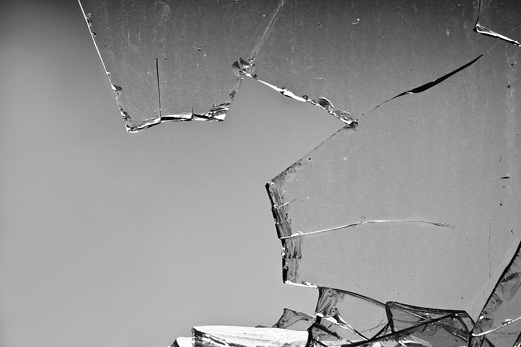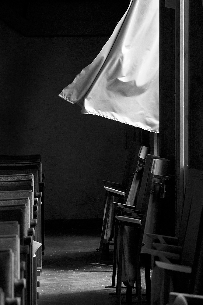 Nachdem wir die Marmorstufen emporgeschritten sind, erahnen wir noch nicht die Weitläufigkeit des Gebäudes. Der Weg führt uns durch ein Foyer, rechts und links breiten sich lange Gänge aus. Vor uns liegt nun der Vorraum zu einem großen Saal. An beiden Seiten führen Treppen in die oberen Stockwerke. Unter den Schuhen knirschen tausende Glasscherben. Wiederholt wurden die Fensterscheiben systematisch eingeworfen. Filigrane Risse zieren die Glastüren wie Spinnennetze. Wand- und Deckenleuchten aus Glas – zerschlagen. Im Saal zieht eine große Bühne unsere Blicke auf sich. An den Seiten flattern lange Vorhänge wie Gespenster im stürmischen Wind – mal weit hinein in den Raum, mal durch die zertrümmerten Scheiben ins Freie. Die Bühne hat auch gelitten. Zugdrähte für Vorhänge – unbrauchbar. Die Stellräder arbeitslos. Seitlich ein eher unscheinbarer Zugang zum Turm, dessen Treppenaufgang kahl und schmucklos erscheint. Die vielen gepolsterten Klappstuhlreihen sind noch vorhanden und laden zum Verweilen ein, um die Atmosphäre wirken zu lassen. Schreibplatten teils nach oben, teils nach unten geklappt. Vorsichtig bahnen wir uns den Weg über Glasscherben und Holzbretter. Blendet man die Zerstörungen aus, ist dieser Schulungssaal überaus beeindruckend. Man wundert sich fast ein wenig, dass hierfür keine Nachnutzung gefunden wurde.
