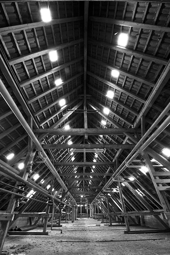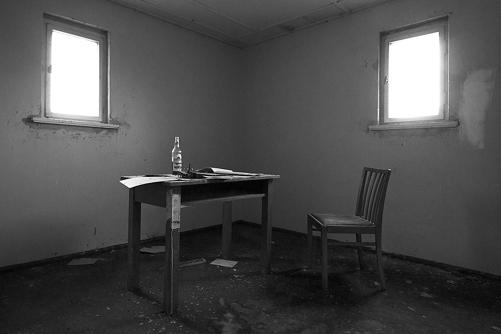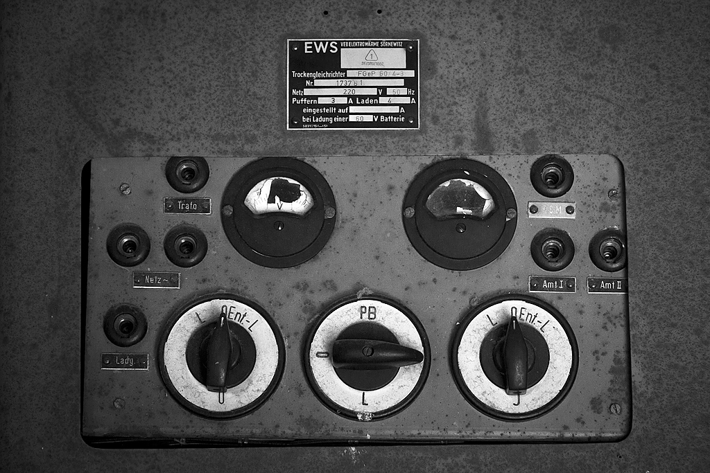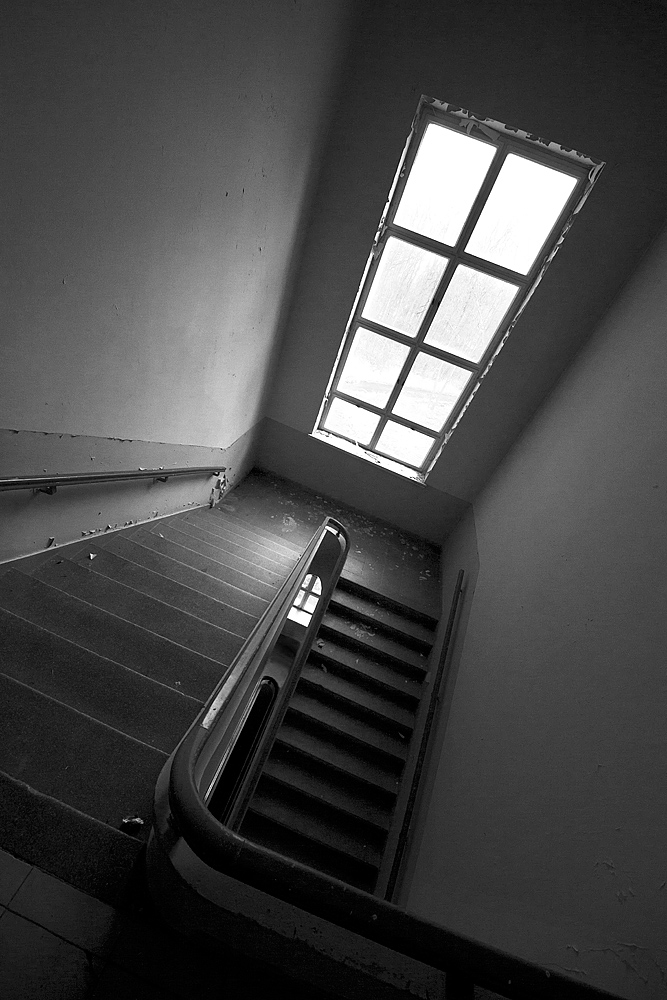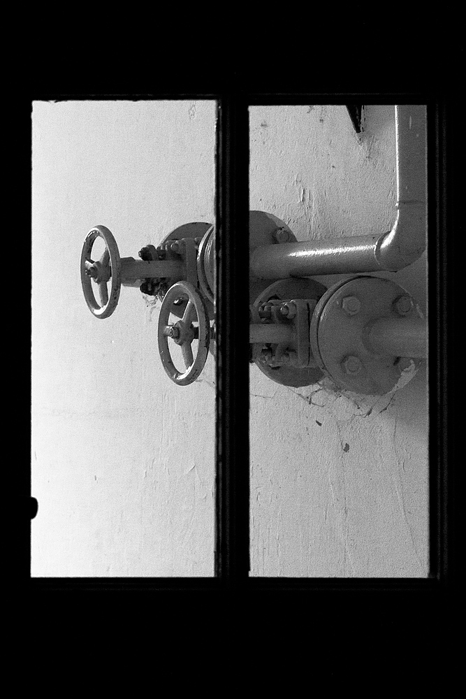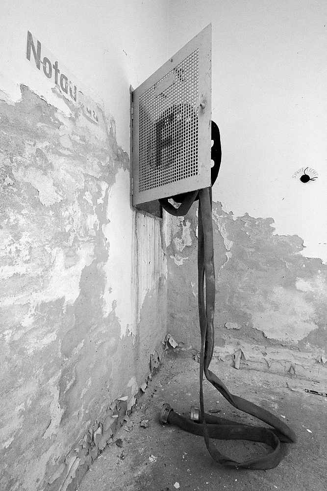 Beim Streifzug durch die Gänge und Räume sehen wir aufgerissene Schaltkästen, herausgerissene Kabel und abgerollte Feuerwehrschläuche. Wie rote Schlangen kommen sie aus den Kästen in den Wänden oder liegen auf dem Boden. Ihrer Funktion beraubt. Früher Lebensschutz, heute nutzlos. Durch die vielen Fenster fällt reichlich Tageslicht in die großzügigen Gänge und lädt zum Fotografieren ein.