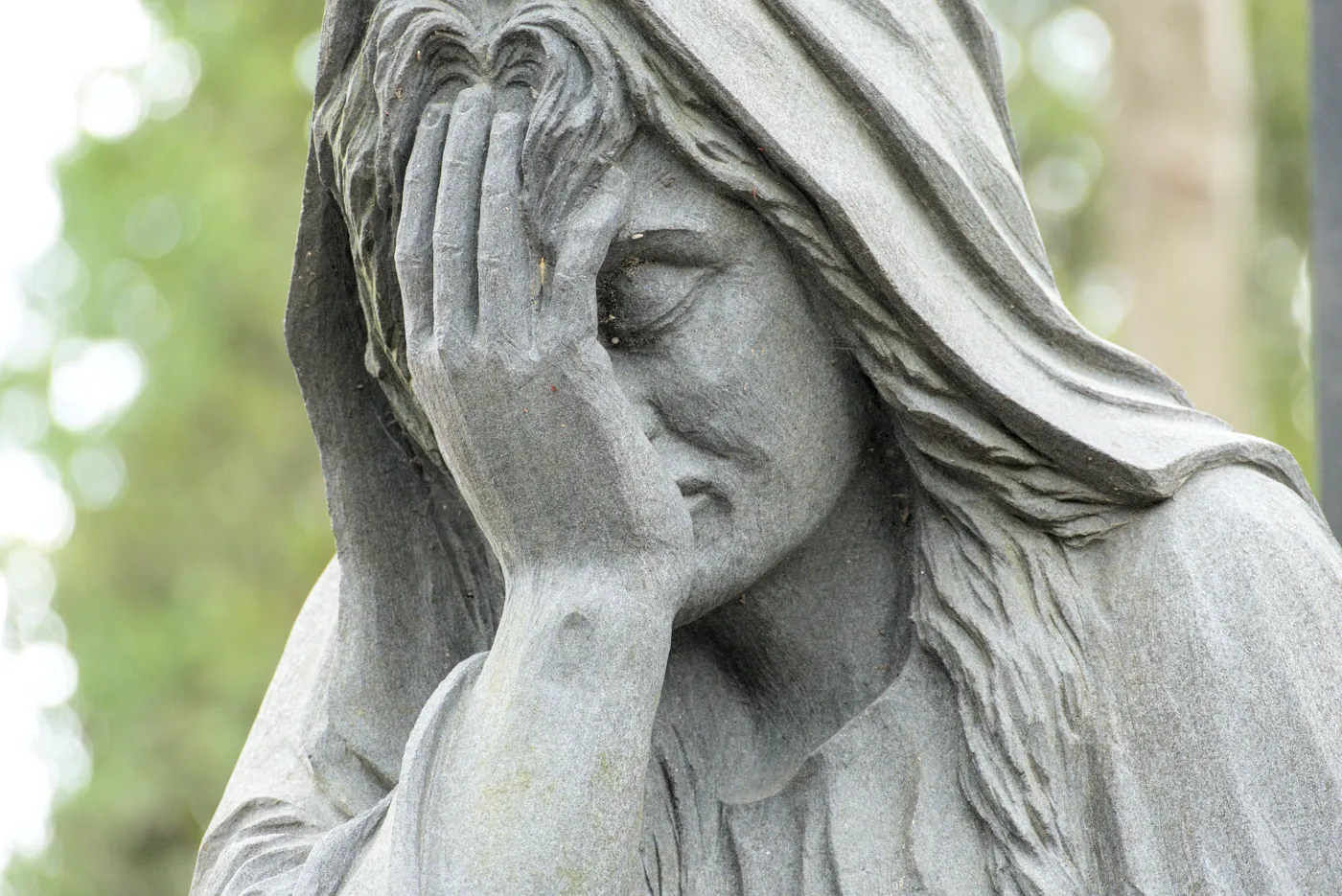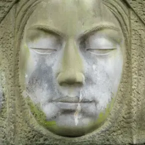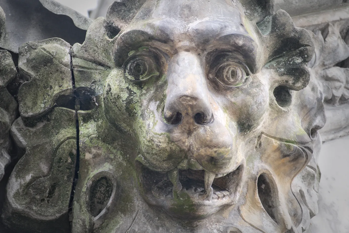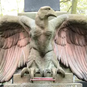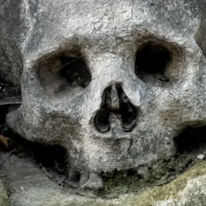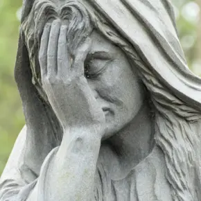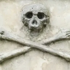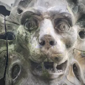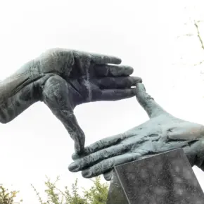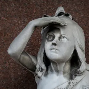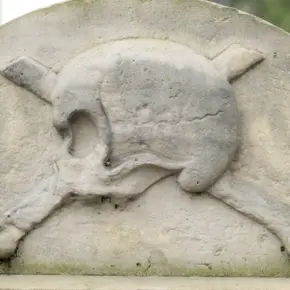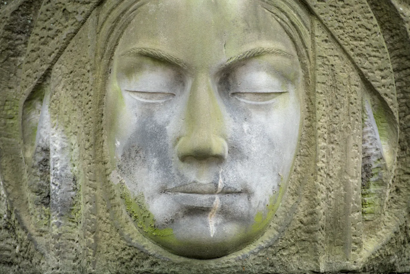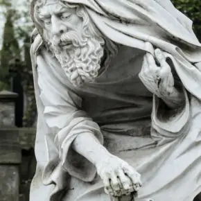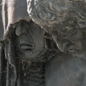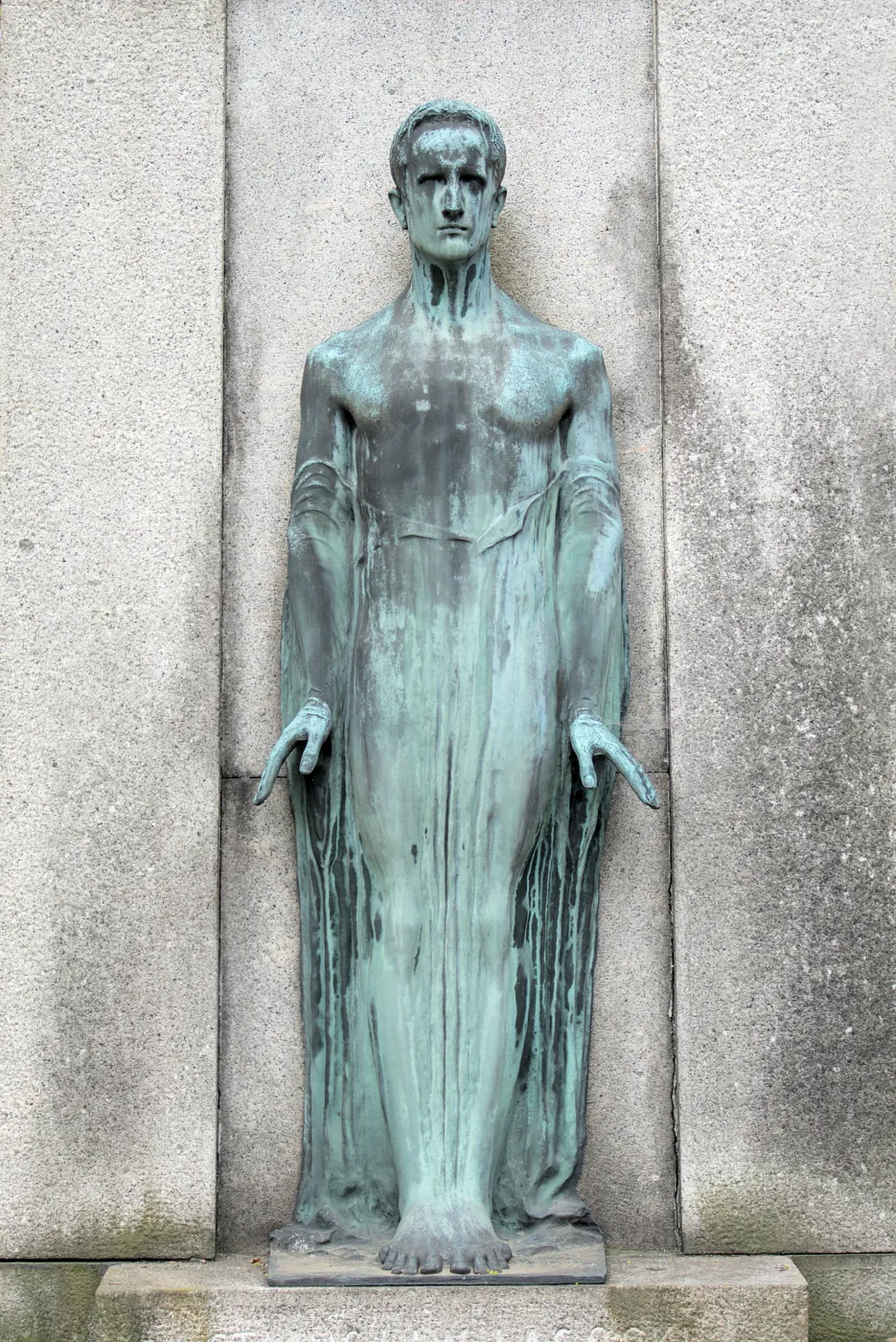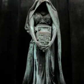 Nach dem Durchschreiten bleibt mein Blick an der Skulptur eines alten bärtigen Mannes hängen. Er kniend am Boden. In einer Hand hält er ein Stundenglas. Symbol für die Endlichkeit der Zeit. Die Adern treten deutlich hervor. Es wirkt beinahe so, als wäre der Mann nur für einen kurzen Moment erstarrt. Auch wenn sich hier und da etwas Patina gebildet hat, leuchtet die weiße Oberfläche ungewöhnlich hell. „Sic transit gloria mundi“ (lateinisch: So vergeht der Ruhm der Welt) lautet die Inschrift auf der Grabplatte. Eine nüchterne Feststellung.