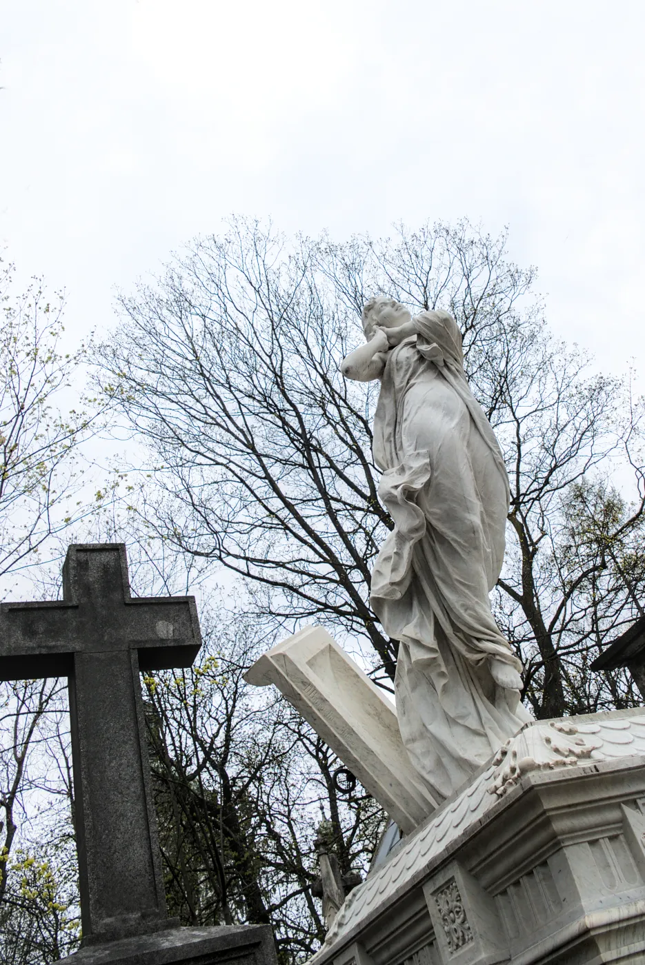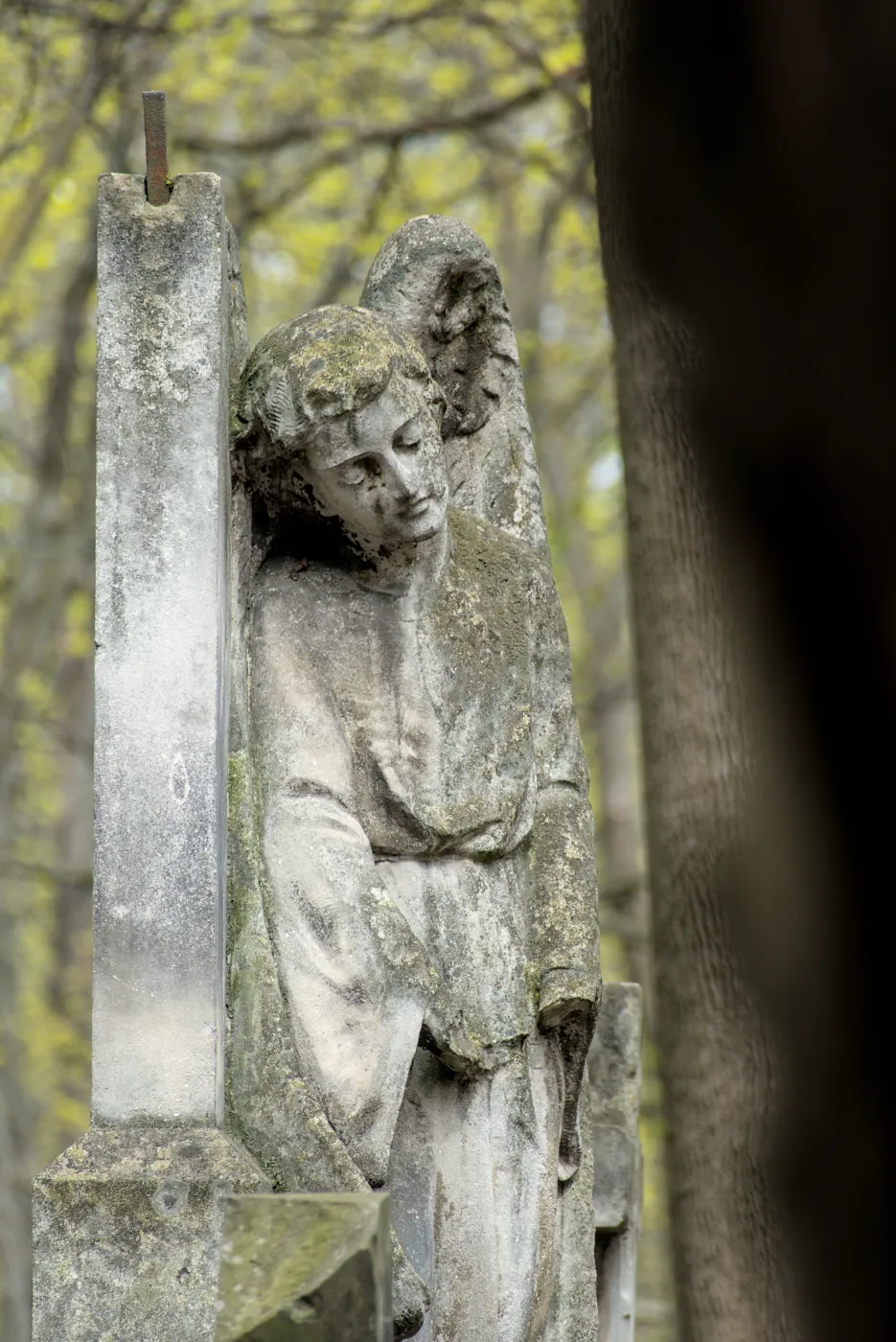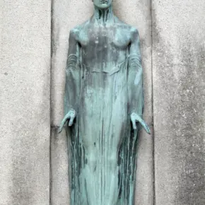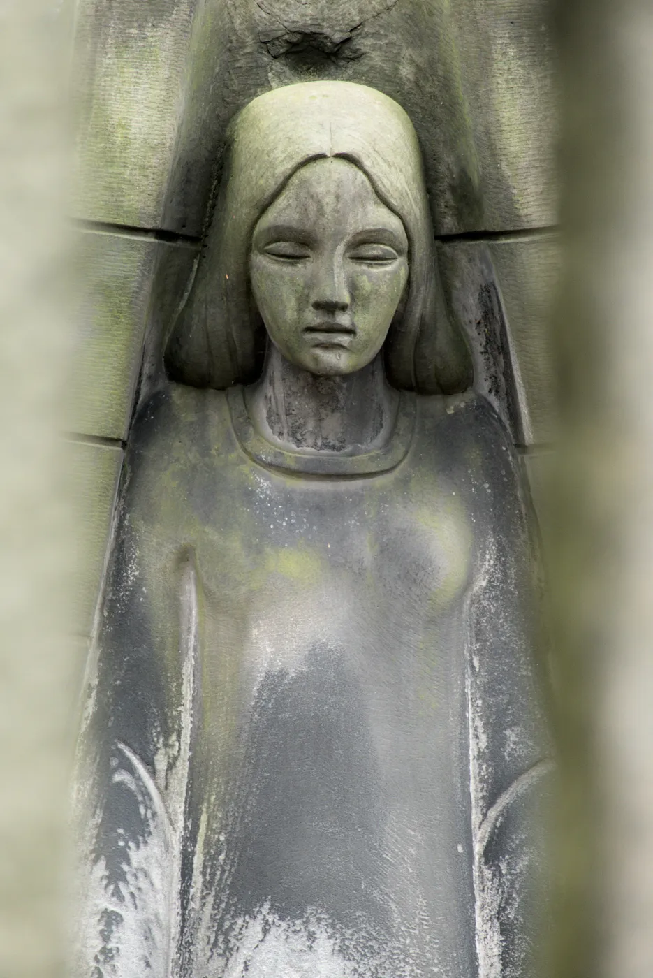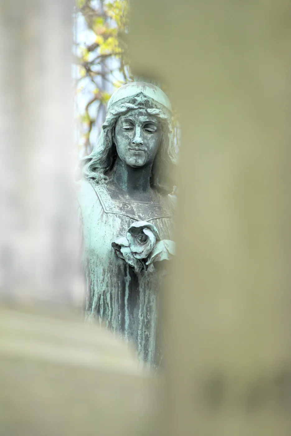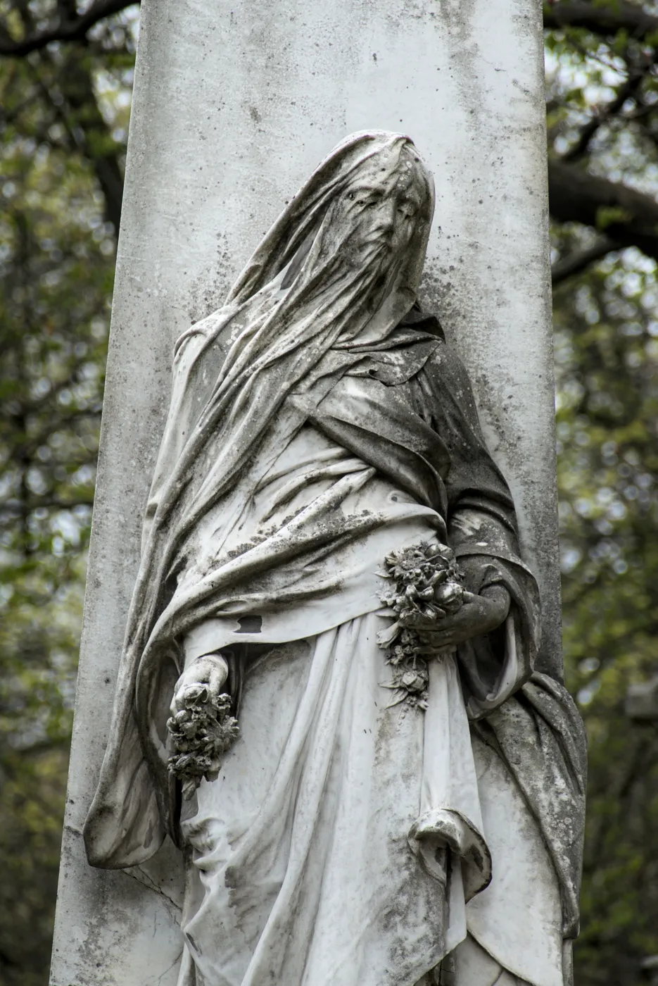Dieser Ort wird von der Fülle an eindrucksvollen Skulpturen bestimmt. Ohne sie wäre er wohl kaum bemerkenswert, vielleicht sogar monoton. Keine inszenierten Ruhepunkte. Keine offenen Flächen. Kein Gras bricht die Strenge auf. Stattdessen: Grab an Grab, Stein an Stein. Dazwischen lange, gerade Wege, die ein nüchternes Raster bilden. Parallel, wiederholt, fast endlos. Über vierzig Achsen in Nord-Süd-Richtung. Alte Bäume säumen diese Wege. Mächtige Wurzeln brechen den Boden auf. Die Gräber sind selten bepflanzt, Blumen erscheinen eher als temporäre Geste denn als ein Element der langfristigen Gestaltung. Erst durch die kunstvollen Statuen verwandelt sich der Friedhof in eine Galerie unter freiem Himmel.