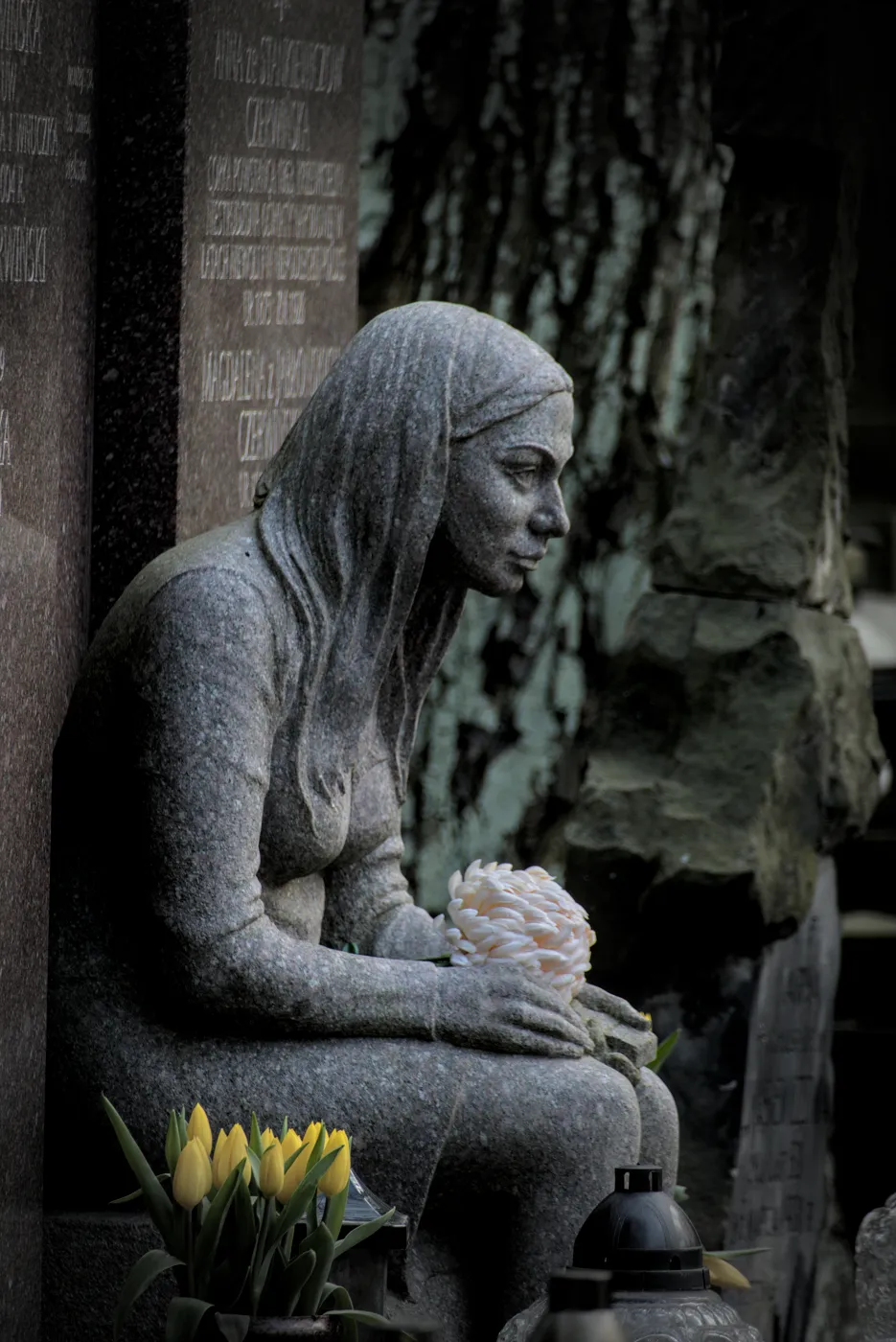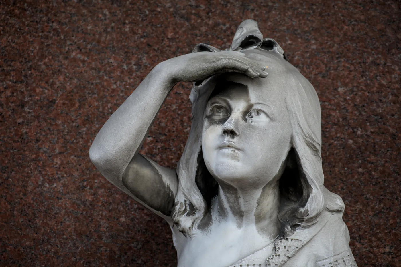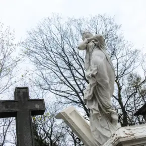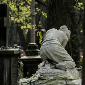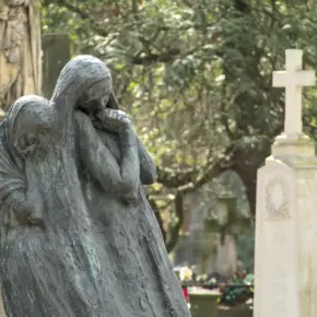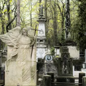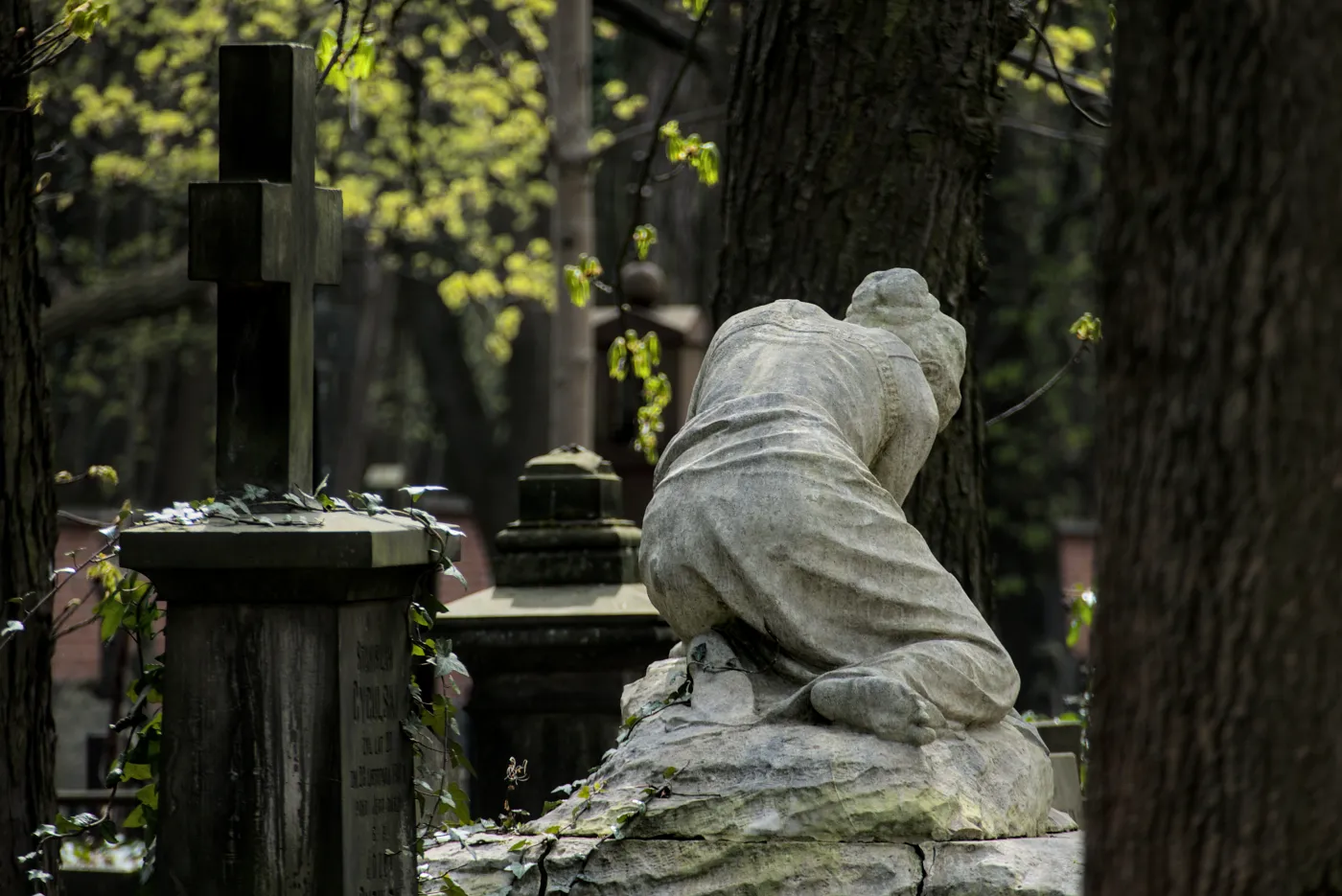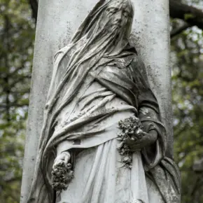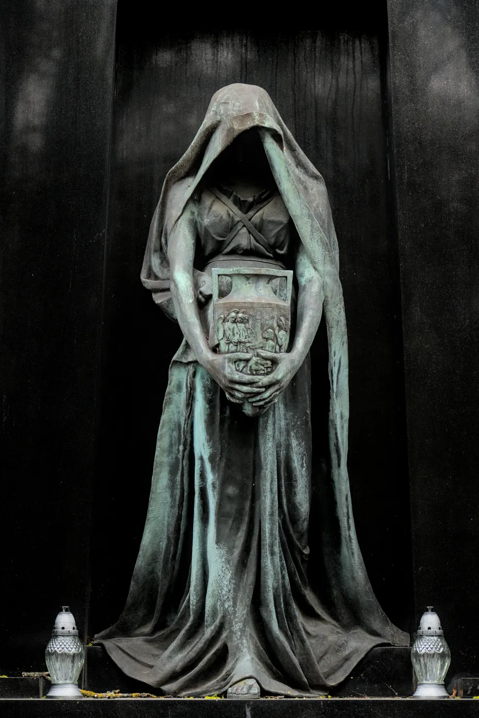Dieser Ort wird von der Fülle an eindrucksvollen Skulpturen bestimmt. Ohne sie wäre er wohl kaum bemerkenswert, vielleicht sogar monoton. Keine inszenierten Ruhepunkte. Keine offenen Flächen. Kein Gras bricht die Strenge auf. Stattdessen: Grab an Grab, Stein an Stein. Dazwischen lange, gerade Wege, die ein nüchternes Raster bilden. Parallel, wiederholt, fast endlos. Über vierzig Achsen in Nord-Süd-Richtung. Alte Bäume säumen diese Wege. Mächtige Wurzeln brechen den Boden auf. Die Gräber sind selten bepflanzt, Blumen erscheinen eher als temporäre Geste denn als ein Element der langfristigen Gestaltung. Erst durch die kunstvollen Statuen verwandelt sich der Friedhof in eine Galerie unter freiem Himmel.
