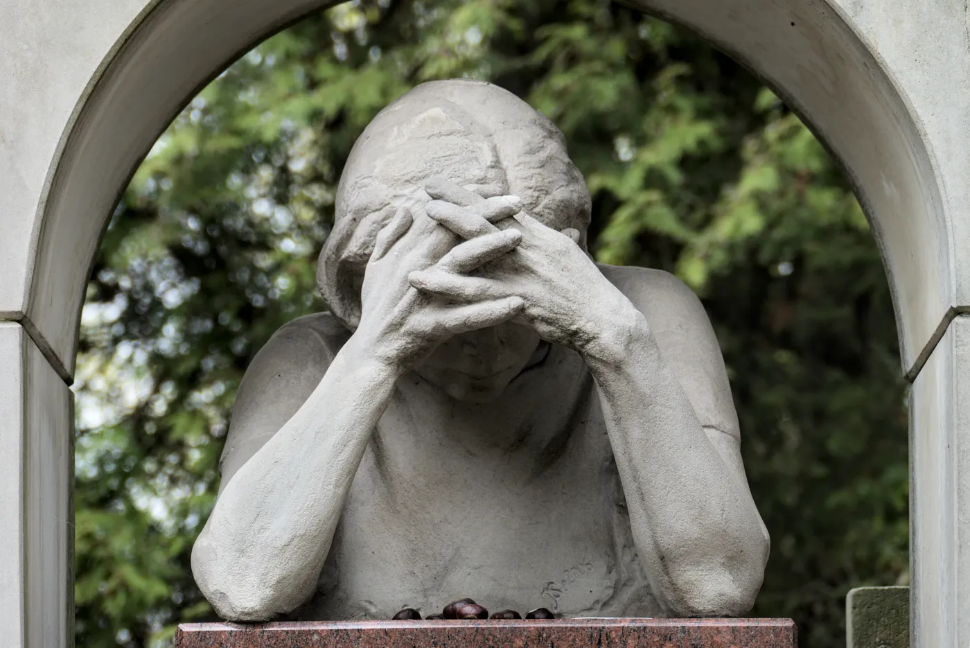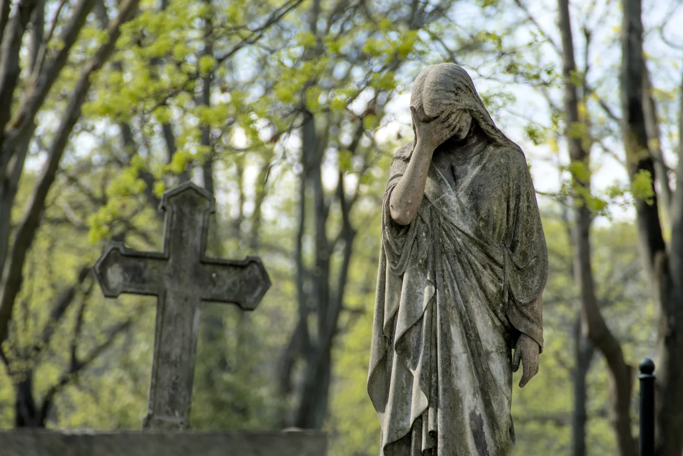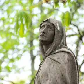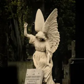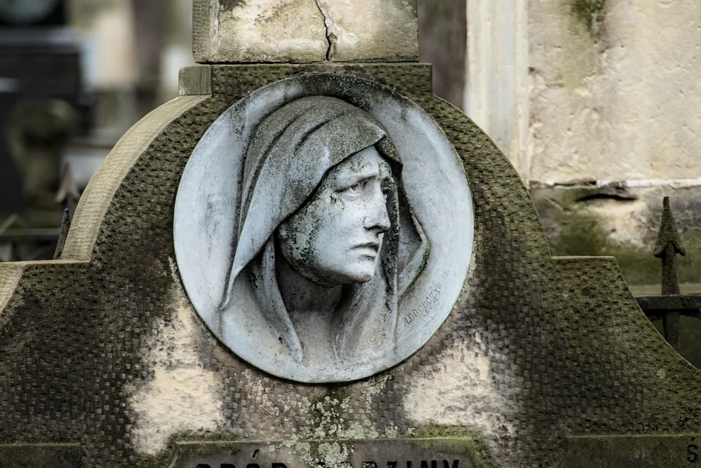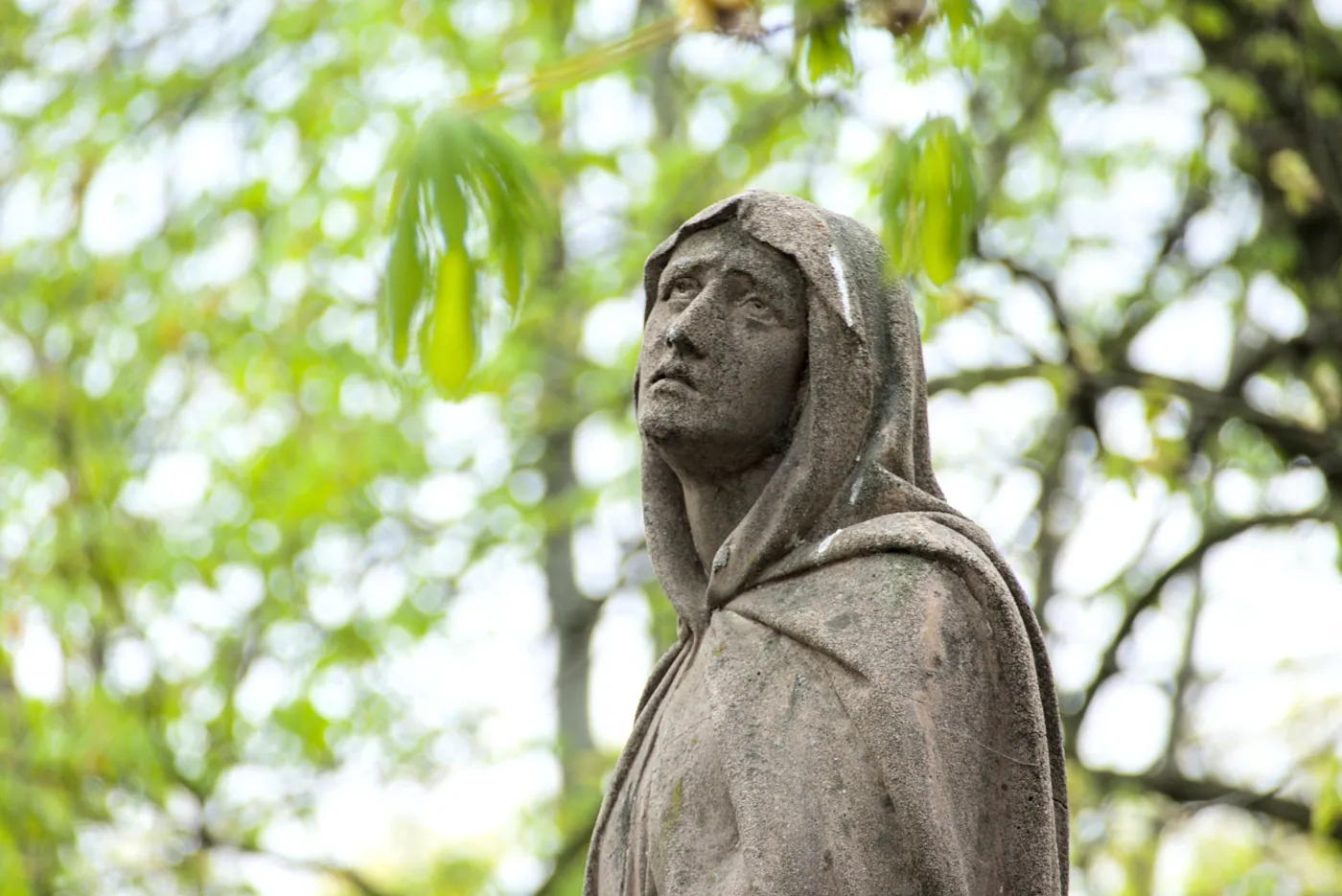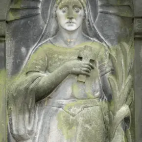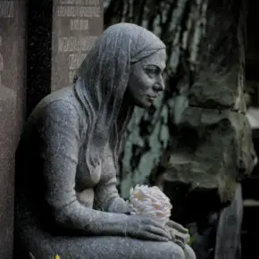 Dieser Ort wird von der Fülle an eindrucksvollen Skulpturen bestimmt. Ohne sie wäre er wohl kaum bemerkenswert, vielleicht sogar monoton. Keine inszenierten Ruhepunkte. Keine offenen Flächen. Kein Gras bricht die Strenge auf. Stattdessen: Grab an Grab, Stein an Stein. Dazwischen lange, gerade Wege, die ein nüchternes Raster bilden. Parallel, wiederholt, fast endlos. Über vierzig Achsen in Nord-Süd-Richtung. Alte Bäume säumen diese Wege. Mächtige Wurzeln brechen den Boden auf. Die Gräber sind selten bepflanzt, Blumen erscheinen eher als temporäre Geste denn als ein Element der langfristigen Gestaltung. Erst durch die kunstvollen Statuen verwandelt sich der Friedhof in eine Galerie unter freiem Himmel.