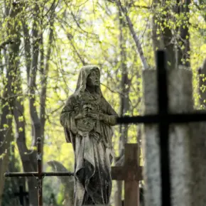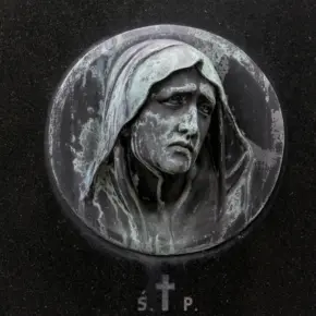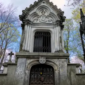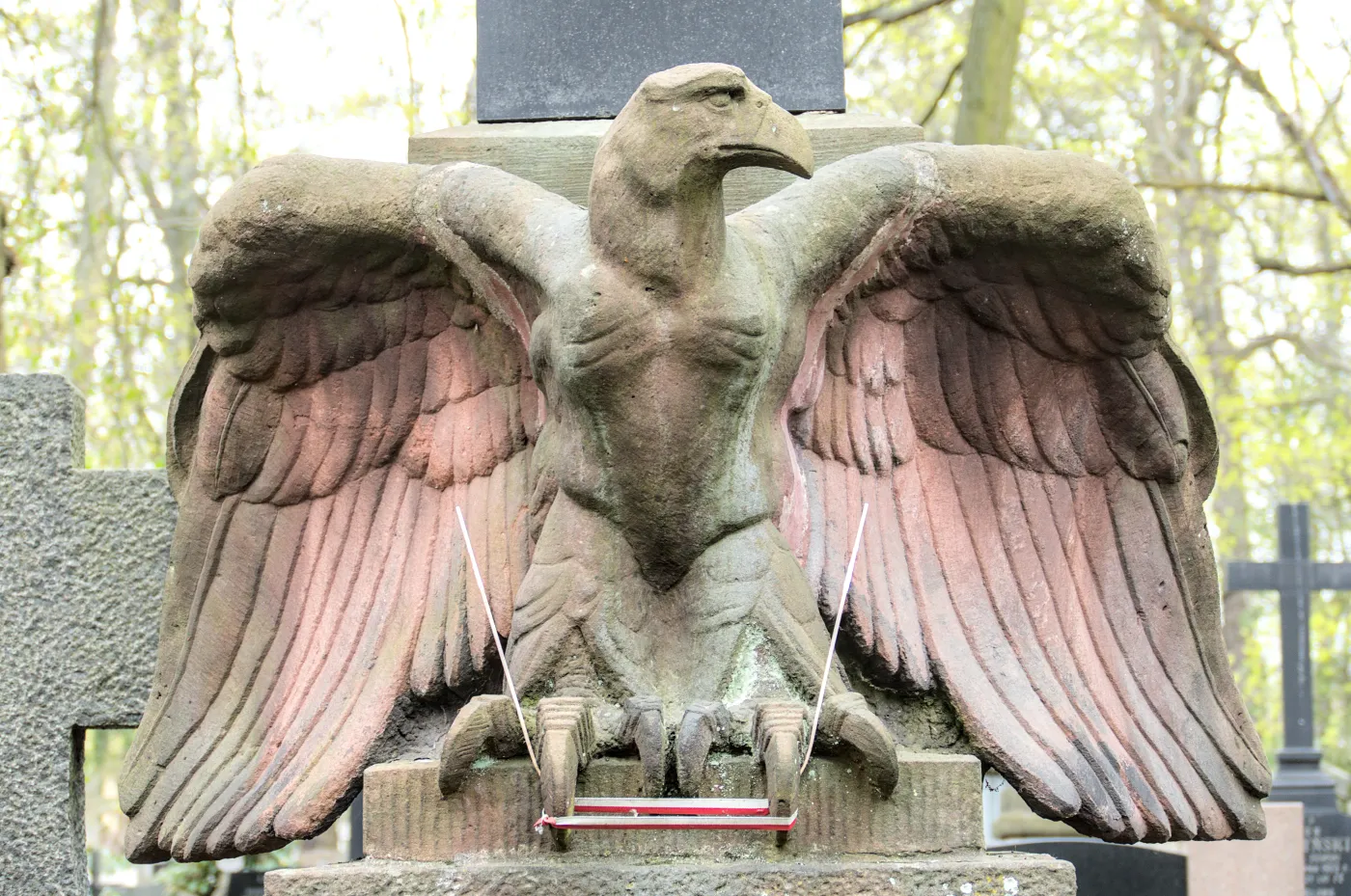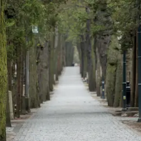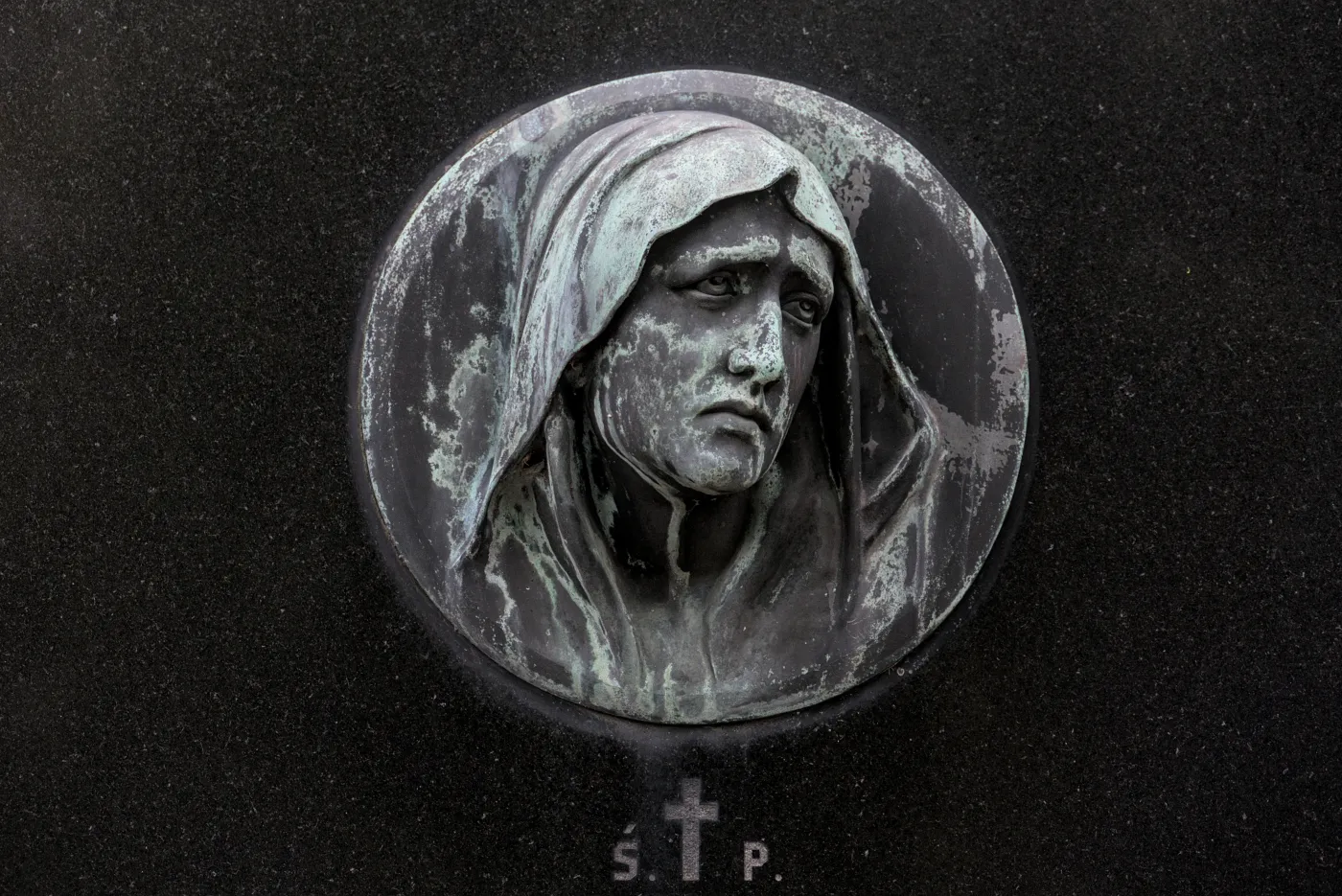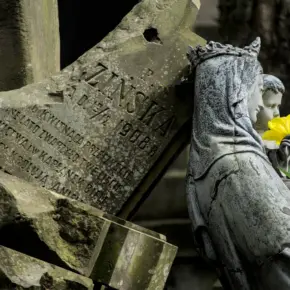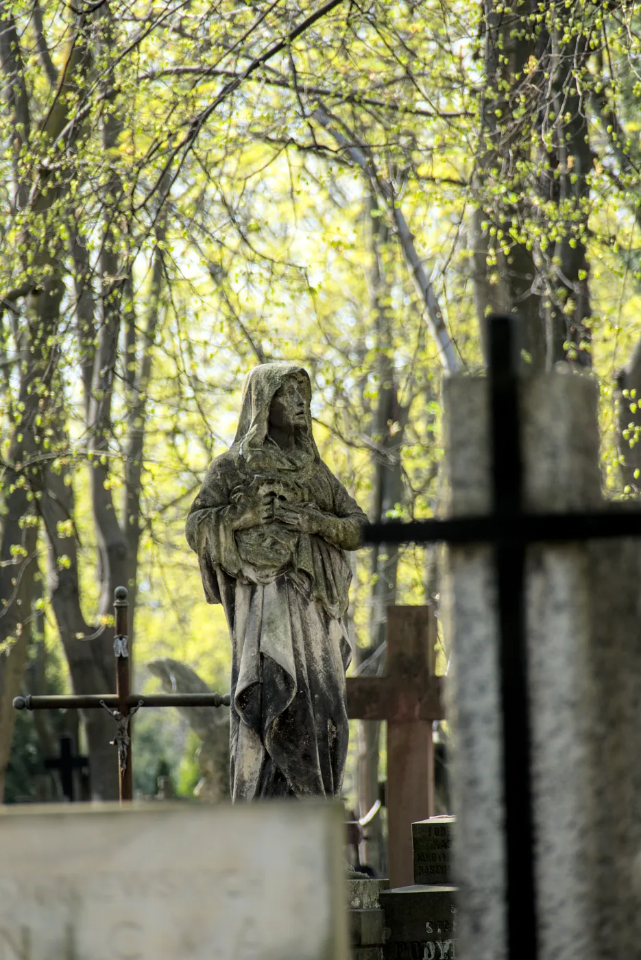 Ich betrete den vor über 230 Jahren angelegten Warschauer Powązki-Friedhof durch das steinerne Tor der Heiligen Honorata. Links steht die Statue eines römischen Kriegers. Schwert und Schild tragen christliche Zeichen – Dornenkrone, Auge der Vorsehung, Friedenstaube. Die Ikonografie ist eindeutig: Kampf, Erlösung, Sieg des Guten über das Böse. Rechts befindet sich ein Trauerkranz mit dem Monogramm Chi (X) und Rho (P) – die griechischen Anfangsbuchstaben für Christus.