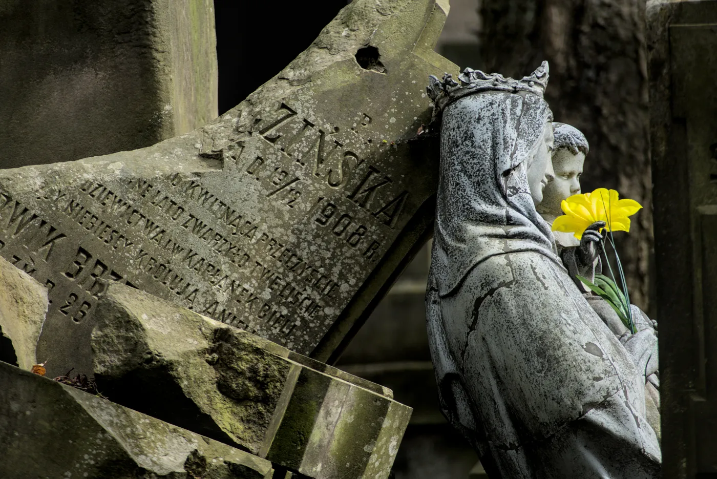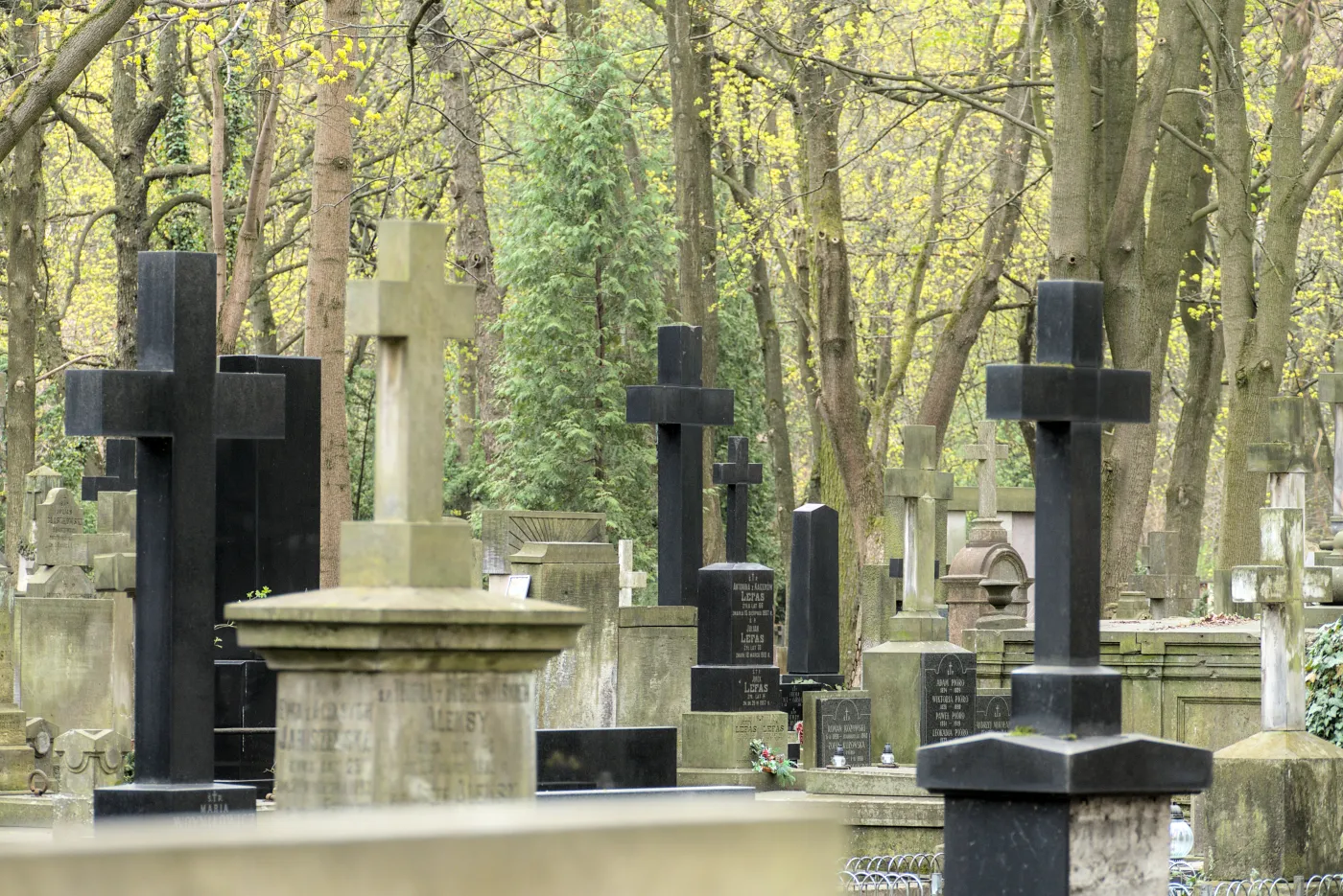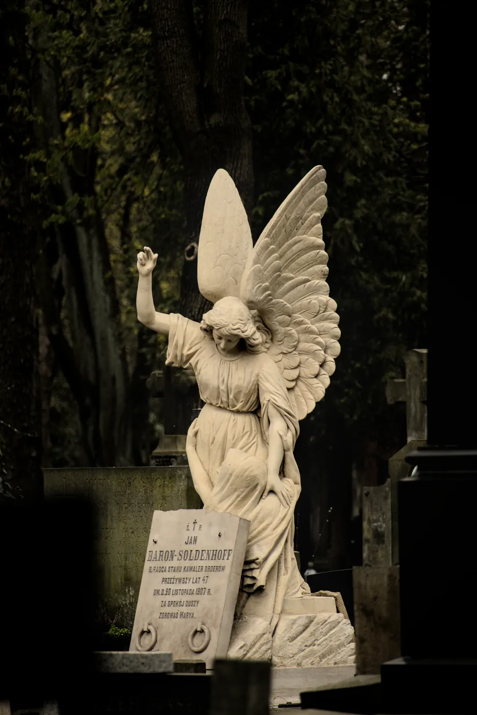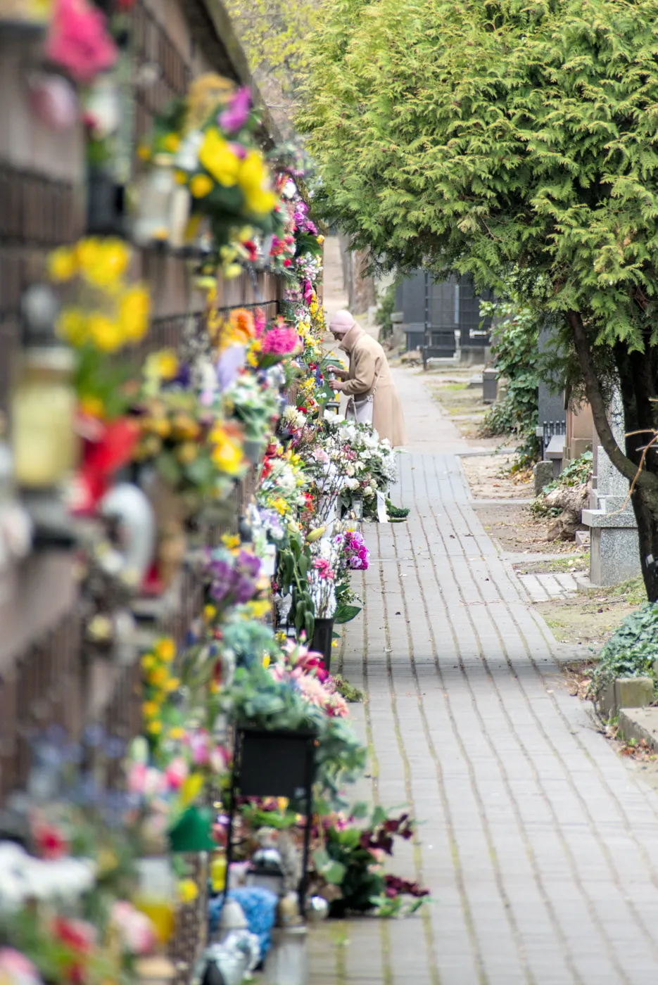 Ich betrete den vor über 230 Jahren angelegten Warschauer Powązki-Friedhof durch das steinerne Tor der Heiligen Honorata. Links steht die Statue eines römischen Kriegers. Schwert und Schild tragen christliche Zeichen – Dornenkrone, Auge der Vorsehung, Friedenstaube. Die Ikonografie ist eindeutig: Kampf, Erlösung, Sieg des Guten über das Böse. Rechts befindet sich ein Trauerkranz mit dem Monogramm Chi (X) und Rho (P) – die griechischen Anfangsbuchstaben für Christus.