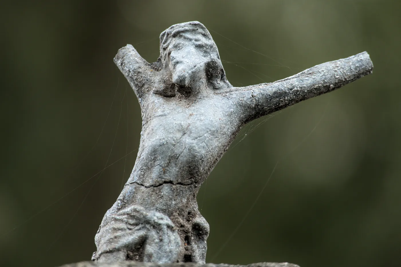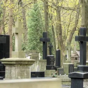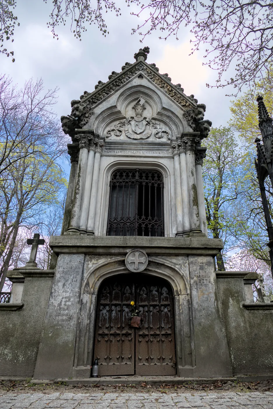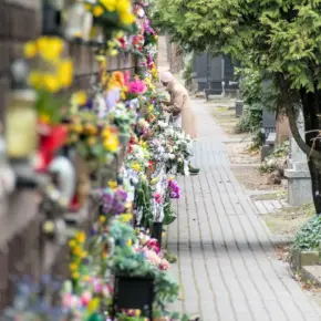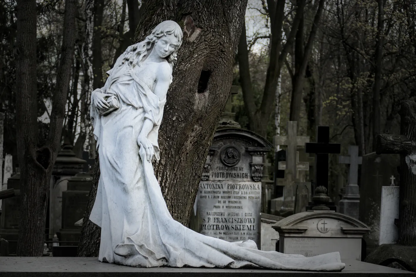 Ich betrete den vor über 230 Jahren angelegten Warschauer Powązki-Friedhof durch das steinerne Tor der Heiligen Honorata. Links steht die Statue eines römischen Kriegers. Schwert und Schild tragen christliche Zeichen – Dornenkrone, Auge der Vorsehung, Friedenstaube. Die Ikonografie ist eindeutig: Kampf, Erlösung, Sieg des Guten über das Böse. Rechts befindet sich ein Trauerkranz mit dem Monogramm Chi (X) und Rho (P) – die griechischen Anfangsbuchstaben für Christus.