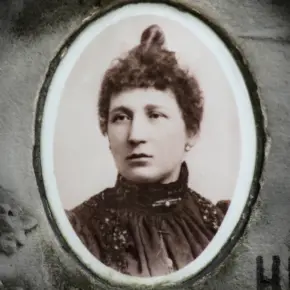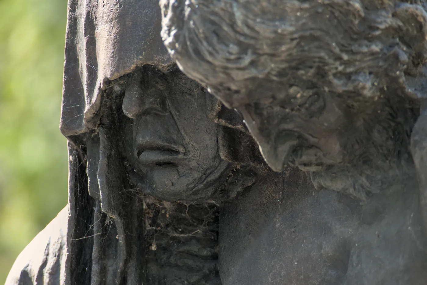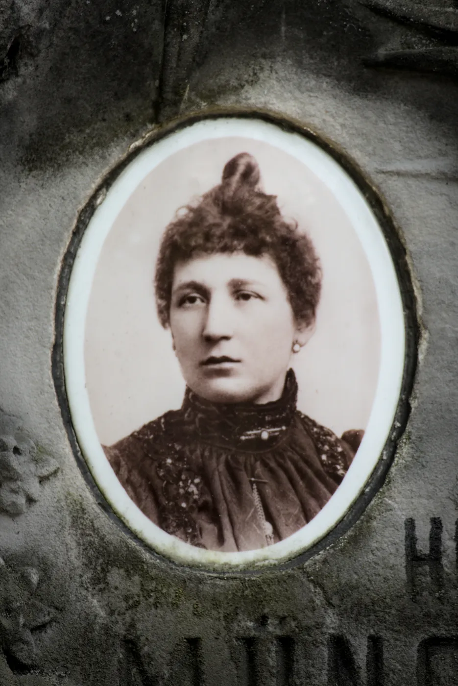 Zwischen diesen Motiven tritt die Skulptur einer junge Frau aus hellem Stein hervor. Kein Engel, keine allegorische Trauernde im üblichen Sinn. Ihr Kleid fällt schwer und weit, wird nach unten hin breiter, fast gleitend die breite Grabplatte entlang. Eine Schulter ist entblößt. Das Haar lang und leicht gewellt. Beinahe beiläufig hält sie ein Stundenglas. Ihr Blick ist nach unten gerichtet, doch in der Haltung liegt keine Schwere.