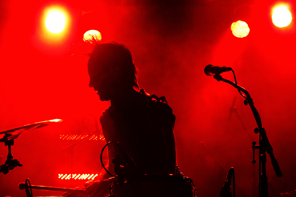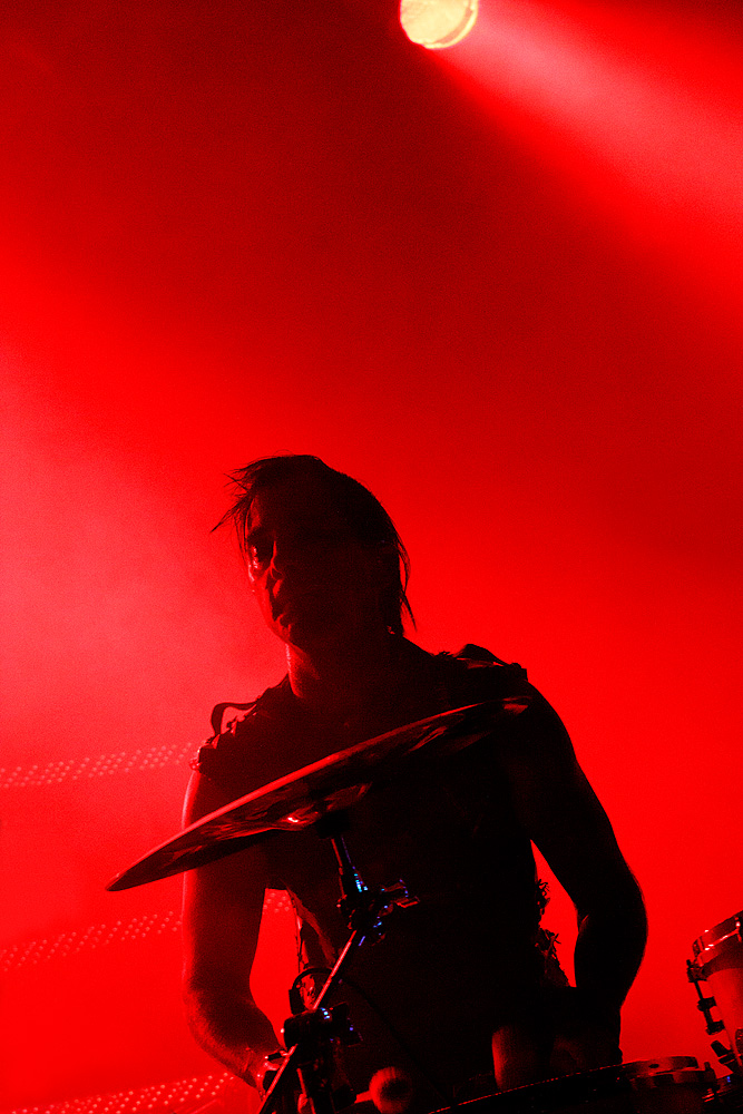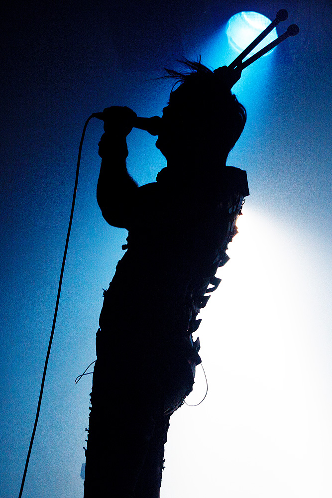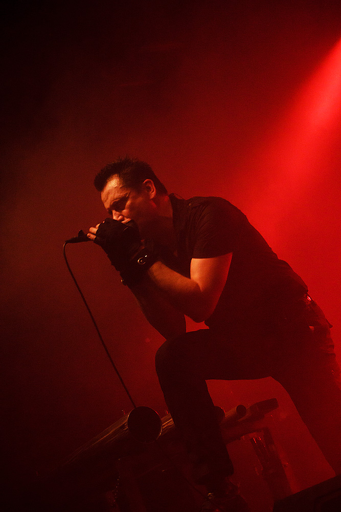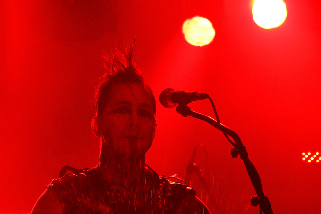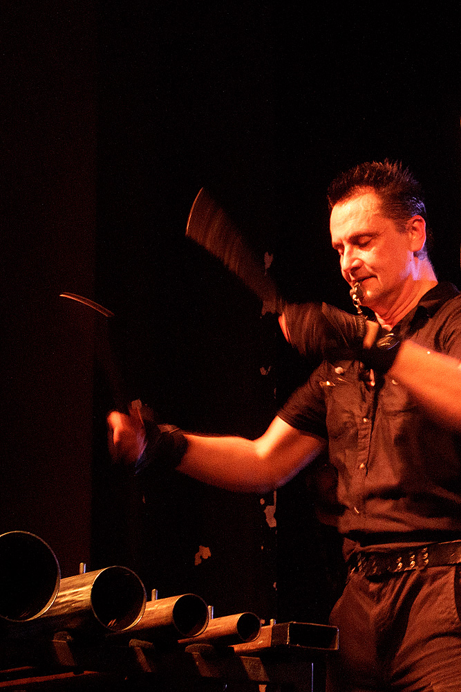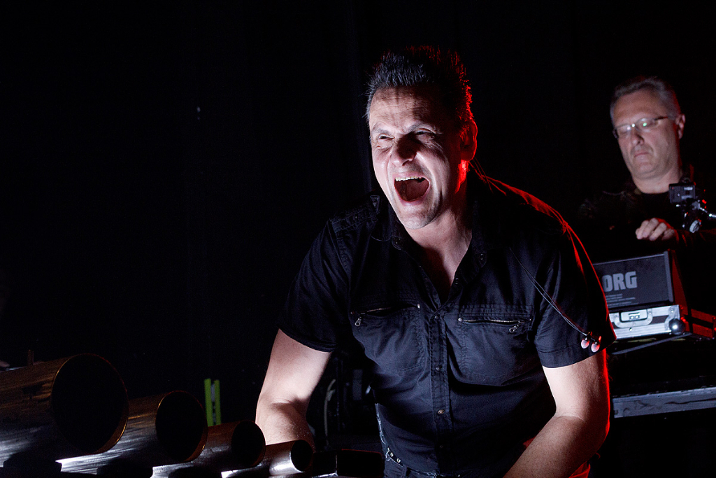 Was folgte, war eine viel zu lange Pause. Als würden „Die Krupps“ nur auf das Schreien, Johlen und Pfeifen warten. Die Anspannung stieg beinahe ins Unermessliche. Doch endlich hatten die „Urgesteine“ – Jürgen Engler, Ralf Dörper und Rüdiger Esch – ein Einsehen. Der Begrüßungs-Applaus brandete den Musikern umgehend entgegen. Hinter dem Schlagzeug nahm übrigens der bereits erwähnte Bradley Bills von „Chant“ Platz – eine durchaus auch körperlich bemerkenswerte Leistung. Am Bühnenrand stand das obligatorische Stahlophon – bestehend aus verschiedenen Stahlrohren, die Jürgen Engler mit aller Wucht u.a. bei Klassikern wie „Metal Machine Music“ und „Wahre Arbeit wahrer Lohn“ bearbeitete. Und auch sonst stand Jürgen Engler im Mittelpunkt des Geschehens – dynamisch, kraftvoll und laut.