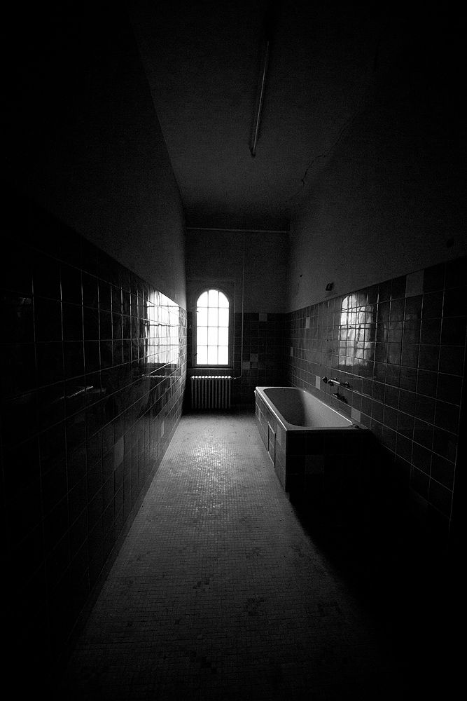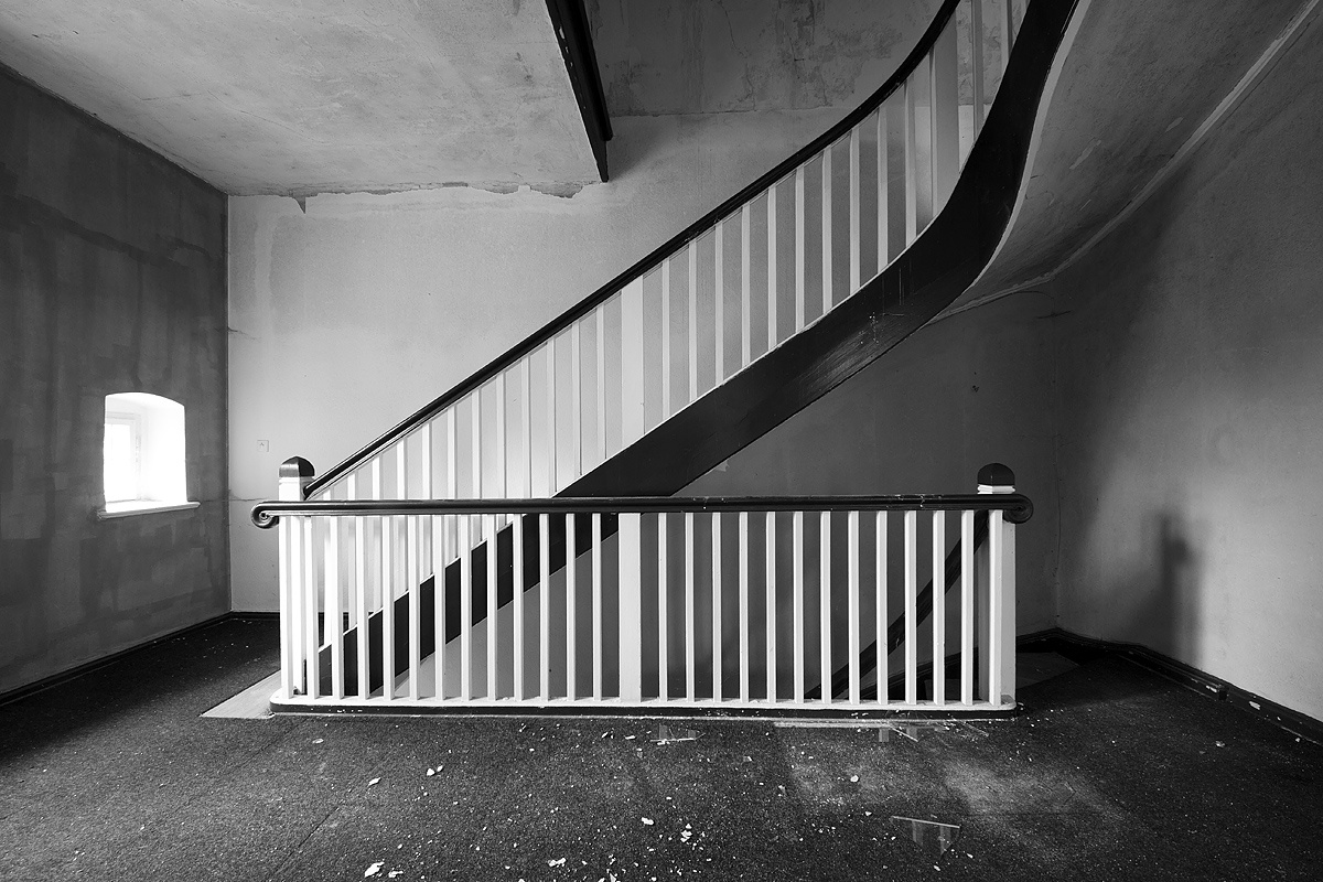 Das große Foyer, welches uns empfing, wirkte beeindruckend hell. Die Räumlichkeiten im Erdgeschoss ließen wir vorerst unbeachtet und eroberten die nach oben führenden Treppenstufen bis wir unter hohem Dachgebälk standen. An jener Stelle weilt noch die Löschsandkiste aus dem Krieg. Einige der kleinen Fenster sind aufgrund sich direkt davor befindlicher senkrechter Balken (wahrscheinlich später eingebaut) nicht mehr zu öffnen. Eine mehr als unglückliche Lösung. Was mag sich der Planer dabei gedacht haben? Grübeln und Schulterzucken. Einige Räume zeigen noch den DDR-typischen Fußbodenbelag Debolon. In einem anderen Geschoss stoßen wir auf Bäder und Zimmer, deren Gestaltung eindeutig der Nachwendezeit zu verdanken sind.