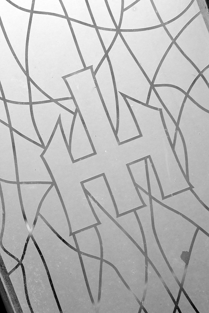 Das Foyer führte uns in einen großen Saal, in dem verloren zwei Sessel auf Ruhebedürftige warteten. Von dort aus gelangten wir in ein Kaminzimmer. Ja doch, so mag man wohnen. Auf einer Seite des Foyers befinden sich ein kleiner Durchgang mit hübschen Malereien an der Decke, eingelassenen Fayencen in den Wänden und eine metallbeschlagene Tür zum kleinen Treppenhaus. Das Metall scheint die Milchstraße und einige Sterne abzubilden. Plastisch heben sich die Ornamente ab. Ein Schatz. Nach Durchquerung eines länglichen Raumes betraten wir den sogenannten Wintergarten. Ein ehemals wohl sehr gemütlicher Ort. Der Blick fiel auf im Boden befindliche Löcher. Wofür mögen diese einst gedient haben. Es galt den Zweck herauszufinden!
