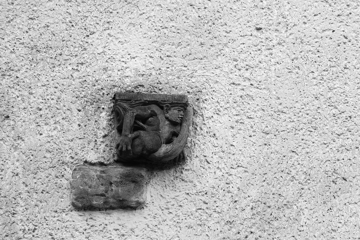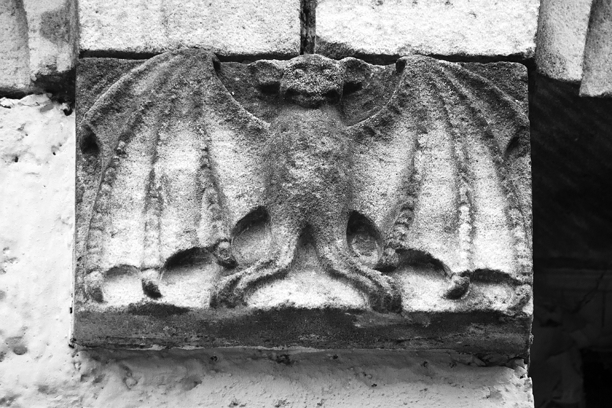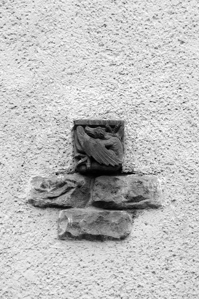 Ein weiteres Tor ließ uns auf den Burghof treten. Auf einer Seite entdeckten wir ein Nebengelass. Gegenüber führte eine kleine Freitreppe zum Eingang. Doch zunächst nutzten wir die Zeit, um die Hakeburg zu umrunden. Trutzige torlose Mauern „sichern“ die Rückseite. Stille lag über dem 62 Meter unterhalb liegenden Machnower See. Diverse kleine Reliefs – wie das einer Fledermaus oder eines Pelikanwesens mit Brüsten und Drachenflügeln – erfreuten uns, ehe wir wieder vor der Eingangstreppe ankamen und uns die von innen mit Sperrholzplatten und spitzige Schraubenenden (eine Sicherung gegen Fußtritte) gesicherte Tür Einlass gewährte.