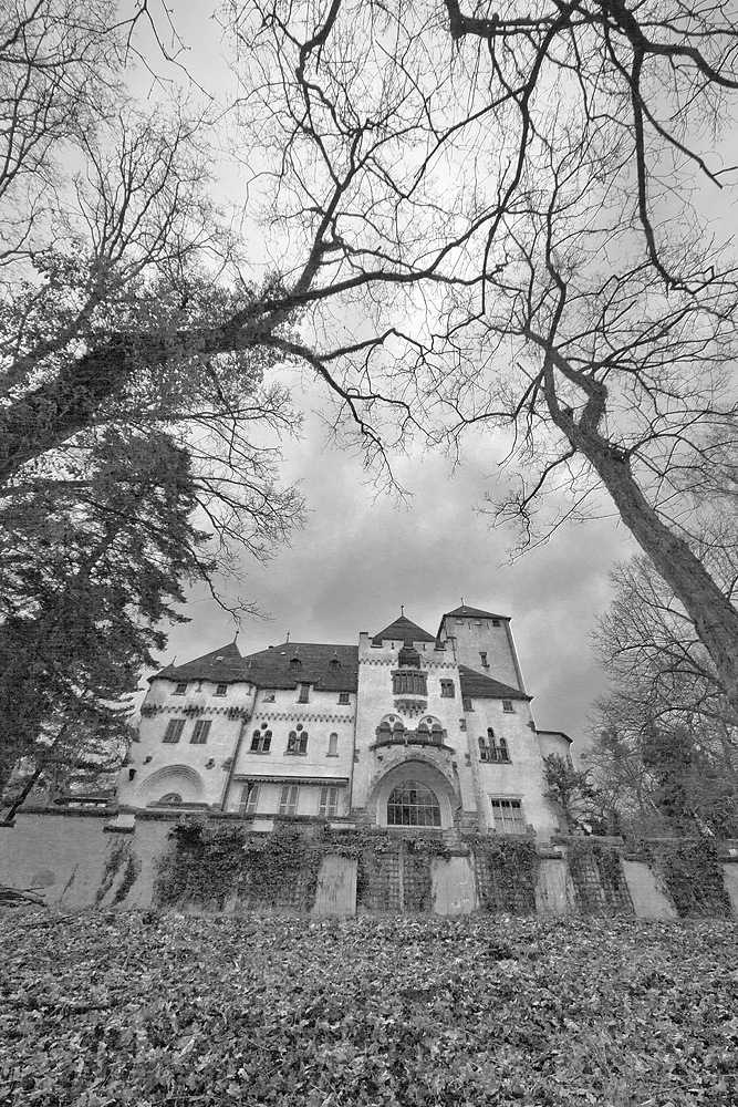 Ein nasskühler Morgen hing feucht zwischen blattlosen Zweigen, als wir durch einen Torbogen kommend auf die in der Gemeinde Kleinmachnow nahe Potsdam stehende Neue Hakeburg zustrebten. Eingebettet in einen verwilderten Park ergab sich eine neu-romantische Atmosphäre.