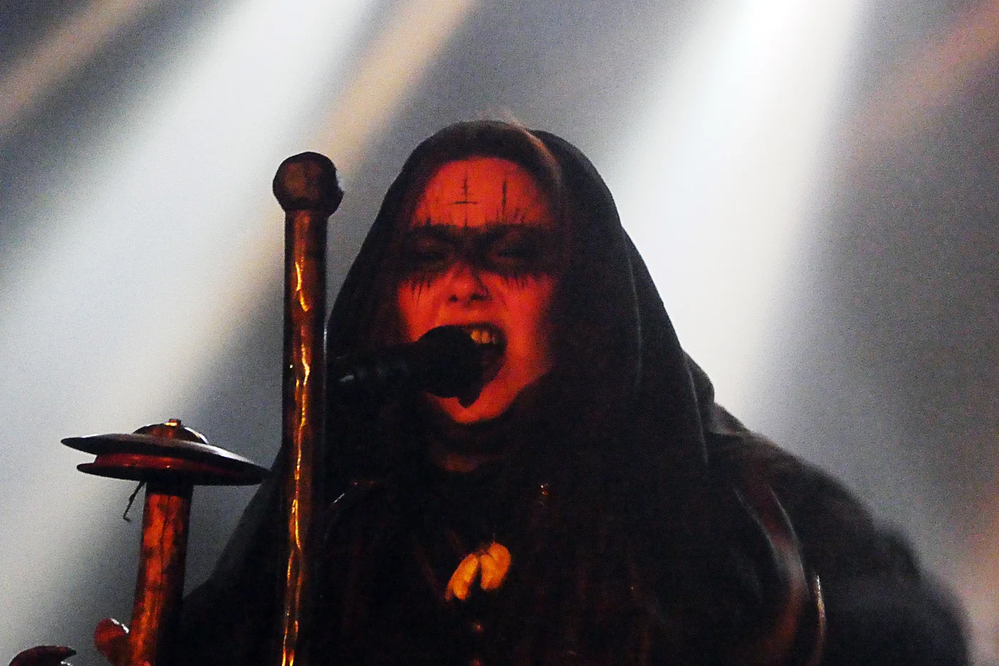 Als erste Band des Abends betrat Perchta die Bühne. Ebenfalls wie Dornenreich stammt diese Musikgruppe aus Tirol. Sie wurde 2017 um die mysteriöse Sängerin „Frau Perchta“ gegründet und veröffentlichte im April 2020 ihr Debütalbum namens „Ufång“. Dieses sorgte für einiges Aufsehen in der Presse und unter Verehrer*innen der urigen Musik härterer Gangart. Denn auf dem Debüt bietet die Band eine Mischung aus alpiner Folklore und rauen Black Metal. Die in Mundart verfassten Texte werden dabei von einer Sängerin vorgetragen, die sowohl clean als auch schreiend intonieren kann und das so, dass einen der eine oder andere Gänsehautmoment heimsucht. Textlich dreht sich alles um den Perchtenkult sowie die Natur. Und eben jenes Flair schaffte die Band in Jena auf die Bühne zu bringen. Der Mikrofonständer der Sängerin sieht aus wie ein Besen, an ihm ist eine bemalte Rahmentrommel befestigt. Daneben steht ein naturbelassener Holzstab mit Schellen und Schnitzereien. Am rechten Bühnenrand stand ein Hackbrett bereit. Nach dem atmosphärischen Intro enterte die Band die Bühne. Zwei Gitarristen, ein Schlagzeuger, ein Hackbrettspieler und dann die Sängerin. Jene war in ein schwarzes Trachtenkleid inklusive besticktem Gürtel und schwarzem Schleier gehüllt. Das Gesicht war mit Bemalungen verziert, die Augen durch Kontaktlinsen schwarz. Im Grunde genommen spielten Perchta das komplette Debütalbum. Als erstes rumpelte das brachiale Lied „Erdn“ durch den gut gefüllten Club. Dann folgte das folkige Stück „Långs“, bei dem die Sängerin mehr rezitiert als singt. Bevor es mit dem eingängigen und nicht weniger hartem Lied „Åtem“ härter und auch ein wenig eingängig weiterging. Ein großer Moment war der Titel „Wåssa“. Dieser geht circa neun Minuten und vereint alle stilistischen Elemente der Band. Vor allem gesanglich wurde hier gezeigt, wie genial klarer und schreiender Frauengesang miteinander harmonieren. Frau Perchta zog durch ihr Gebaren, ihr wütendes Holzstabstampfen, ihr versunkenes Trommelspiel und ihre Gänsehaut bescherende Stimme während des Auftrittes alle Anwesenden in den Bann. Und auch ihre Bandkollegen wussten ihre Energie auf der Bühne zu entfalten, sodass diese auf das Publikum überging. Dieses schenkte zwischen den Stücken und gerade am Ende des Auftritts reichlich Applaus.