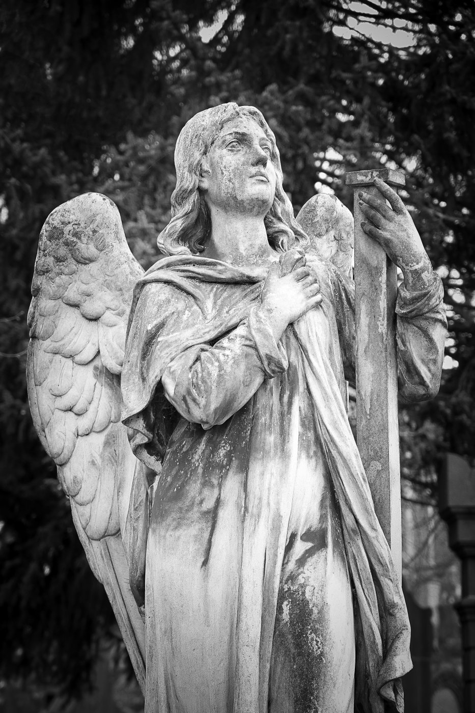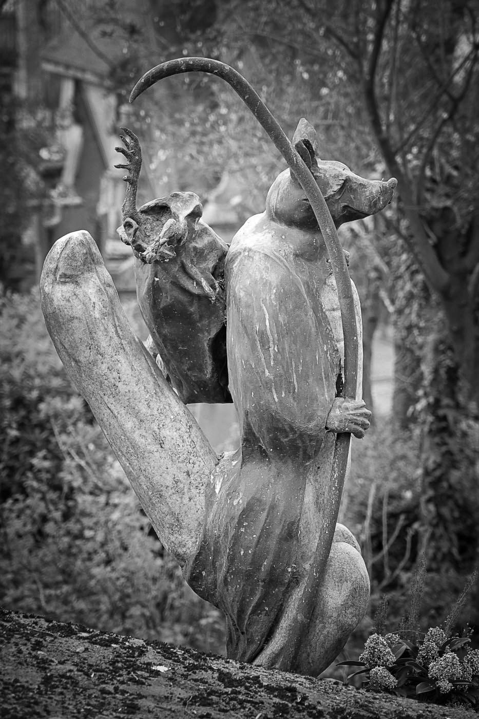 Neben den klassischen Motiven wie Engel und Trauernde findet man auf dem Friedhof auch ungewöhnliche und moderne Darstellungen mit rätselhafter Bedeutung. Unbedingt erwähnt werden muss hierbei die Skulptur eines hundeähnlichen Wesens, das in aufrechter Haltung einen Bogen hält und auf dem Rücken einen Sack trägt, aus dem Vogelbeine herausragen. Weitere Beispiele sind die Darstellung einer Hand, die fünf betende Kinder in sich hält – ein Symbol für göttlichen Schutz und Fürsorge – sowie die auf einem Bücherstapel stehende, lächelnde Gestalt mit einem Tierkopf, vermutlich einem Fuchs.