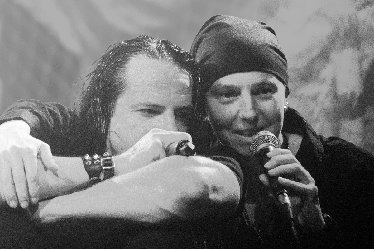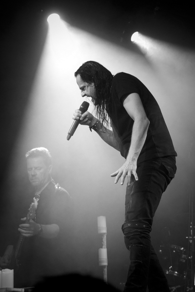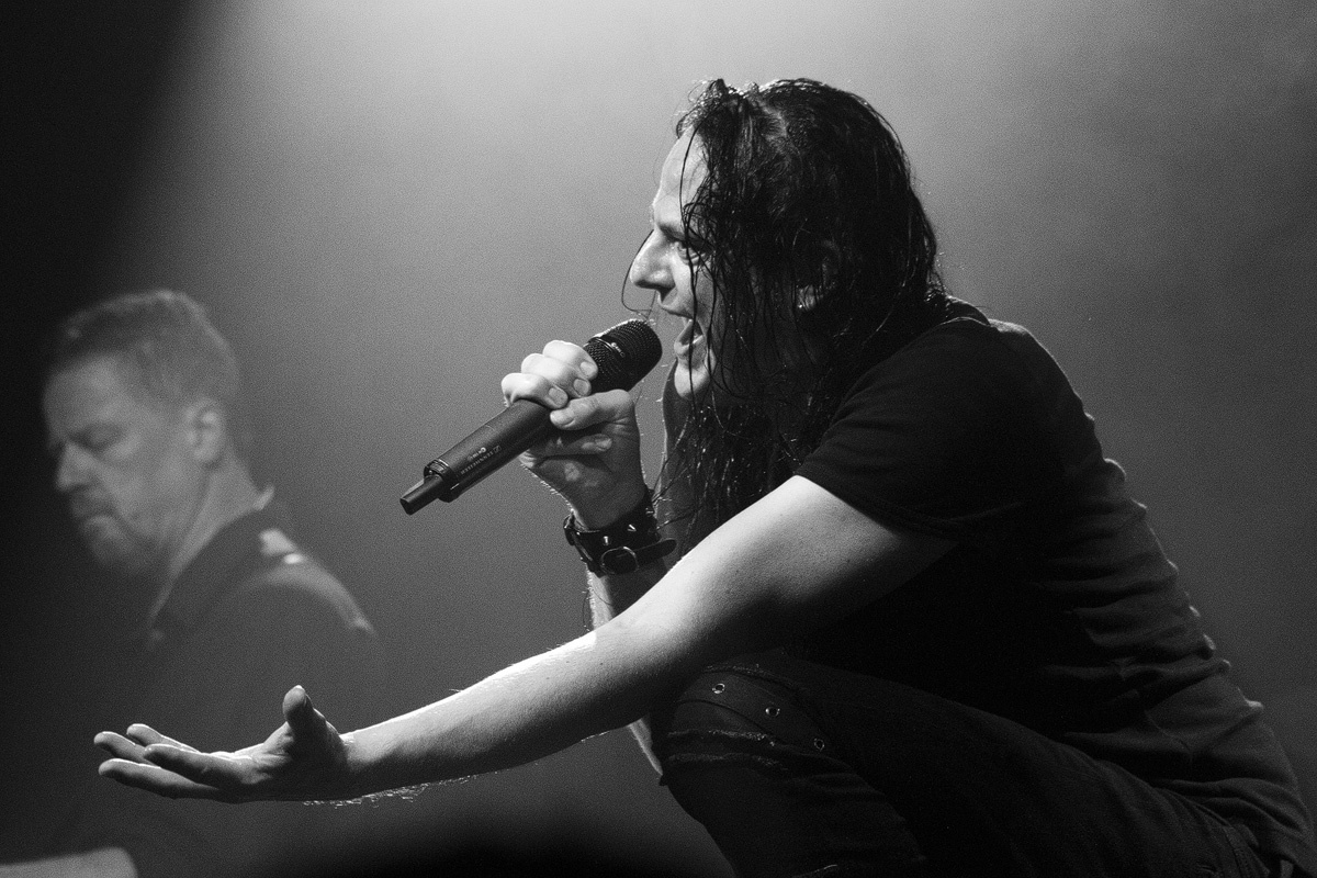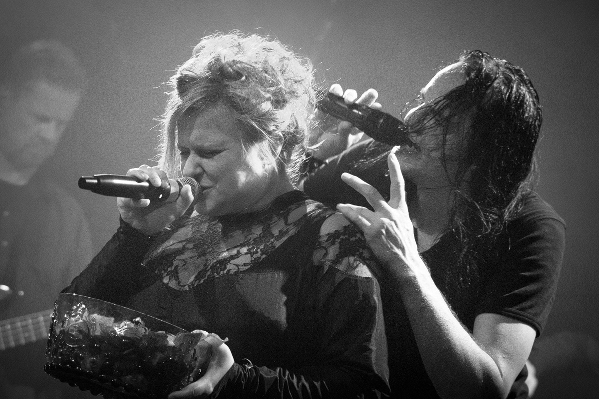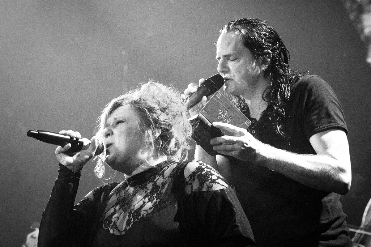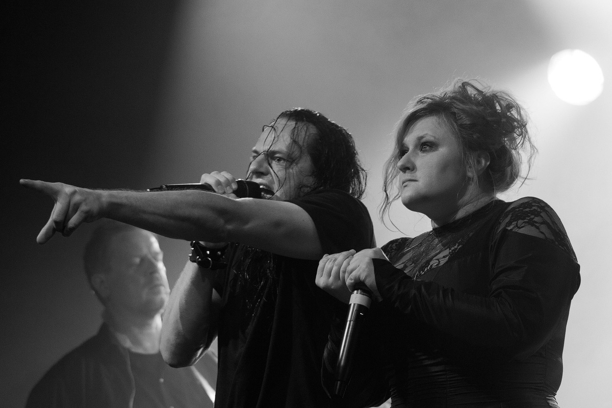 Ein wahrlich ungewöhnlicher Konzertauftakt. Ruhig und zurückhaltend. Doch voller Nachdenklichkeit. Und auch der zweite Titel „Traumsuche“ zeigten „Goethes Erben“ von ihrer stilleren Seite. Sanftes Cellospiel begleitete das Duett von Oswald Henke und Sonja Kraushofer, die auch im weiteren Verlauf des Abends durch ihre Stimmgewalt und ihre theatralische Körpersprache brillierte. Aufregend ihre wie wahnsinnig wirkende Mimik. Eine starke Frau mit einer Ausstrahlung, die den Zuhörer bzw. Zuschauer in den Bann zog und deren Stärke im Zusammenspiel mit Oswald Henke unbedingt nötig ist.