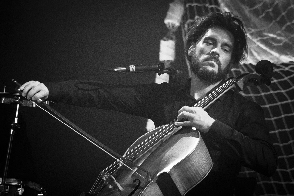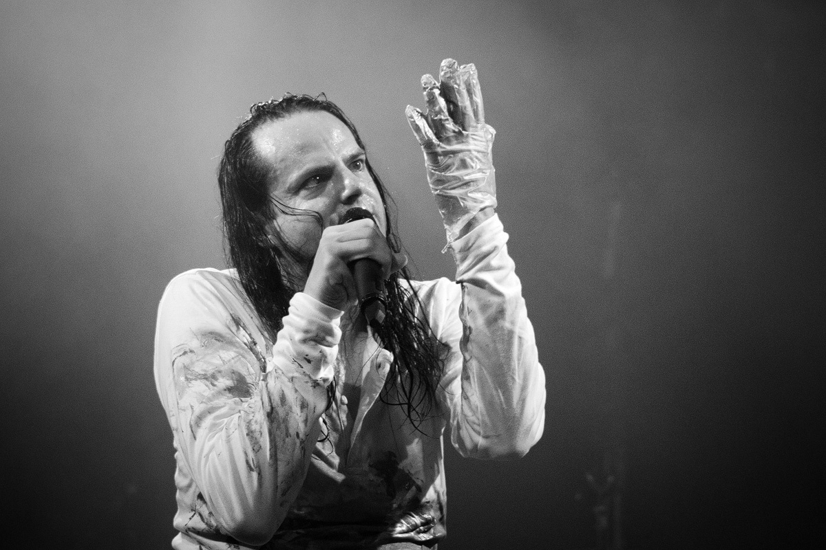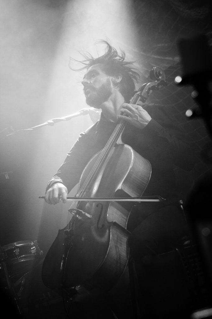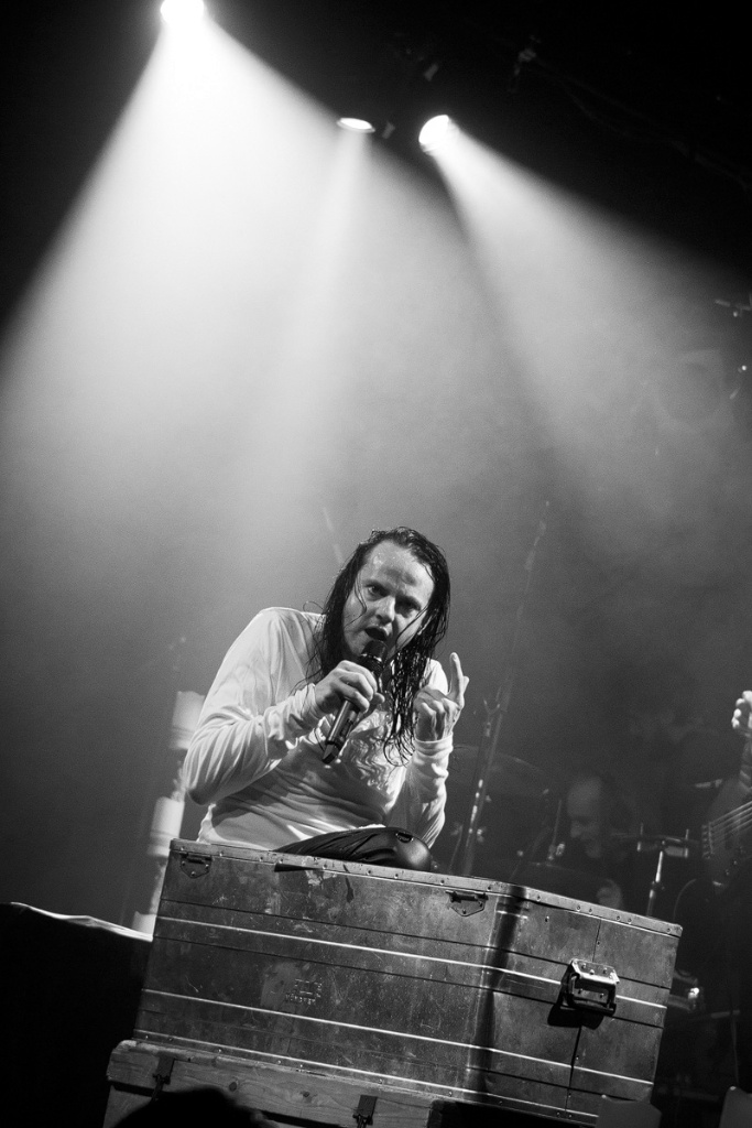 Und ehe man sich versah, war der dritte Zugabenblock erreicht, welcher noch einmal Außergewöhnliches bereithielt. Bassist Cornelius Sturm entlockte seinem Instrument mittels eines Schlagzeugbesens ungewöhnliche Klänge. Doch nicht nur die Musik von „Die Sonne schmilzt“ (aus „Menschenstille“) wirkte in ihrer monotonen Art bedrohlich – ebenso der nun mit einem weißen Hemd bekleidete, in einer Blechkiste sitzende und mit schrecklich bunten Farben herumpanschende Oswald Henke machte einen beunruhigenden Eindruck. Zu unserem Entsetzen mischte er sich gar unters Volk und verteilte Farbklekse. Dieser Kelch ging jedoch erfreulicherweise an uns vorüber.