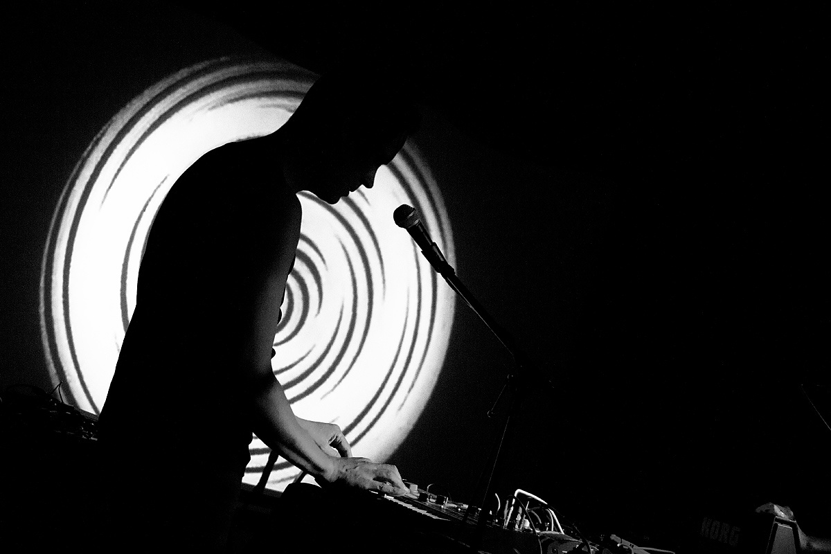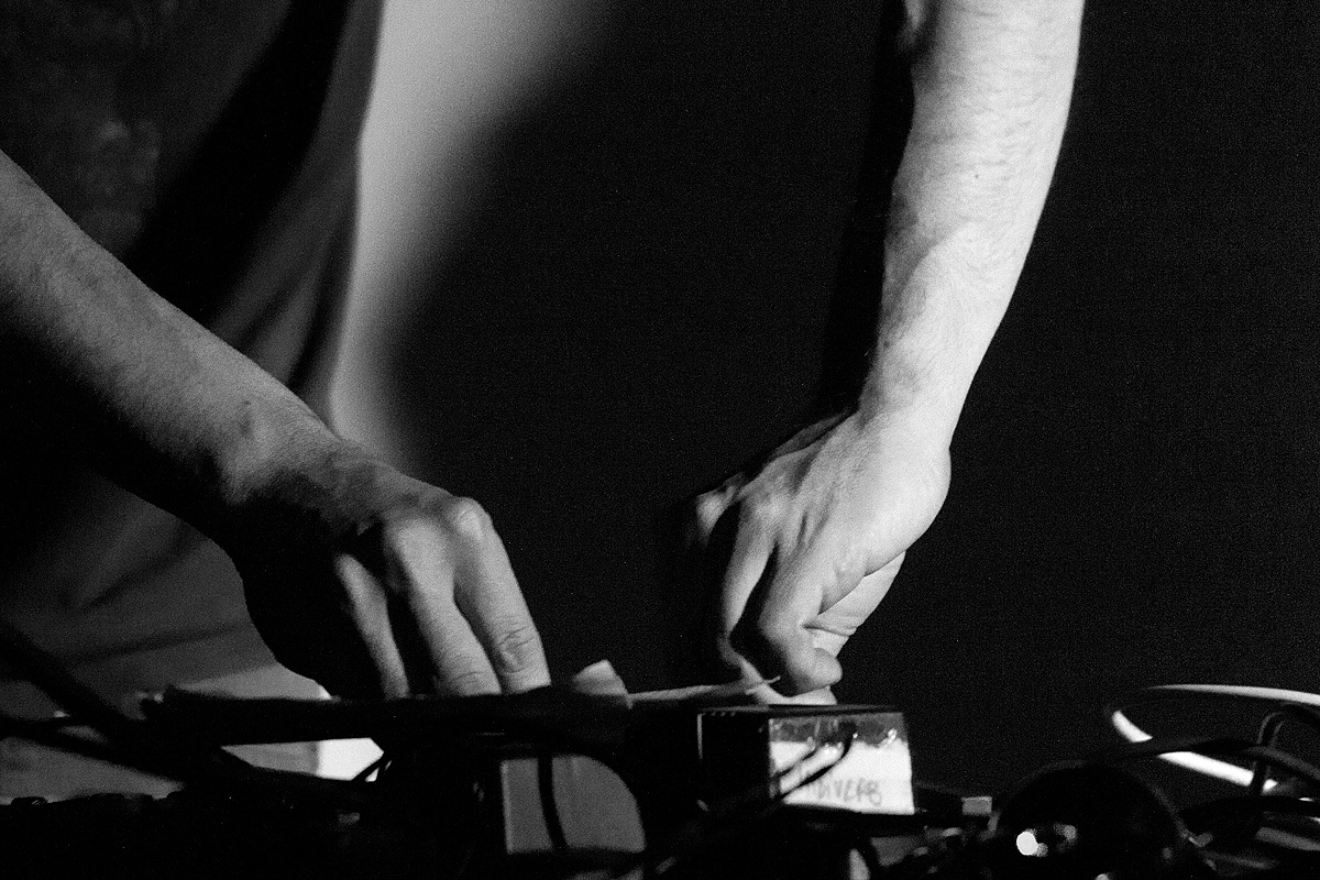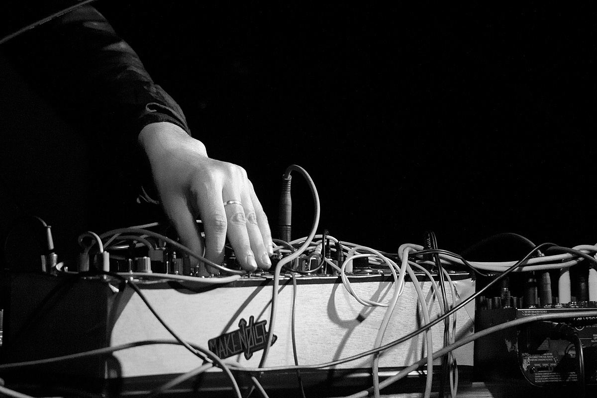 Die spärlich beleuchtete Bühne offenbarte sofort den alternativen Charme des Clubs bzw. der Veranstaltung. Lautsprecher wurden zum Teil von Bierkästen gestützt. Holzböcke mit Leimplatten trugen eine Vielzahl kleiner und mittlerer Gerätschaften mit Drehknöpfen und Steckern. Darüber „lagerte“ ein unüberschaubares Knäuel dünner Kabel. Auf dem Boden liegend wartete eine Gitarre auf ihren Einsatz. Ein verwirrender Eindruck.