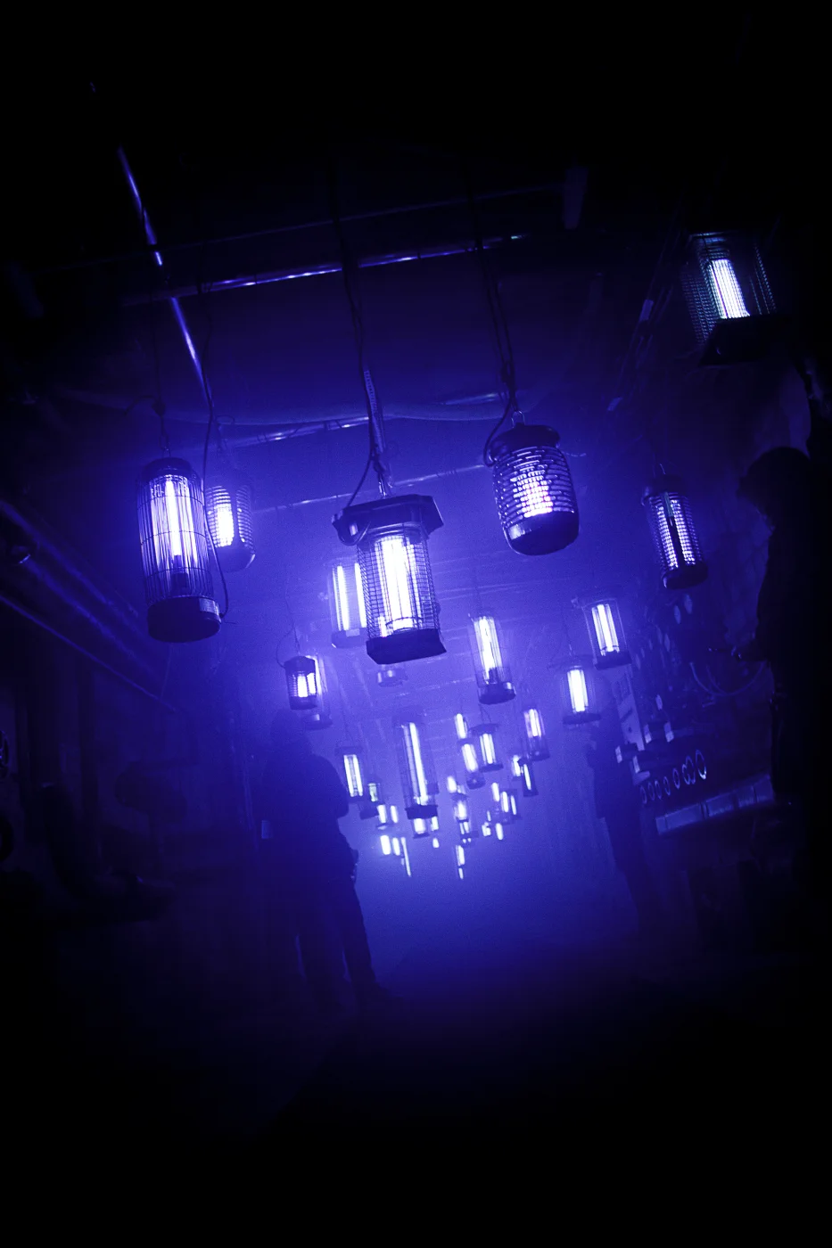 Wie bei Sven Sauers begehbarer Arbeit „Exponentiell“, die das Artensterben thematisiert: Unheilvolles Aufblitzen und Surren von Duzenden elektrischer Moskitolampen in unregelmäßiger Häufung und Folge sorgen zunehmend für eine bedrohliche Atmosphäre.