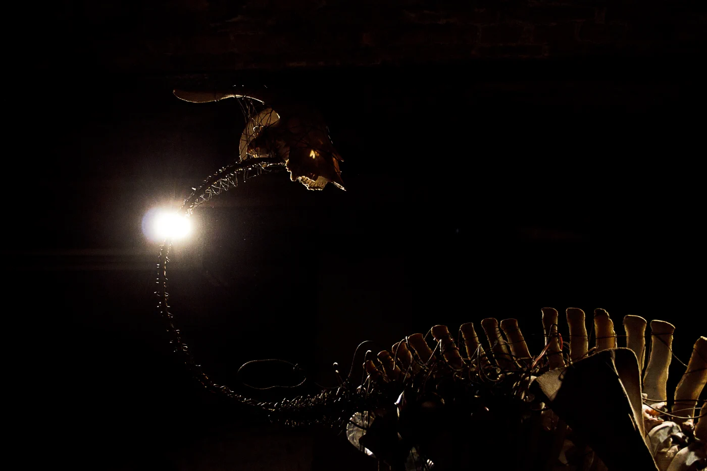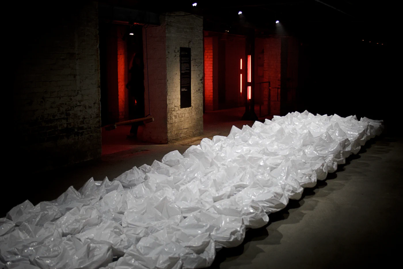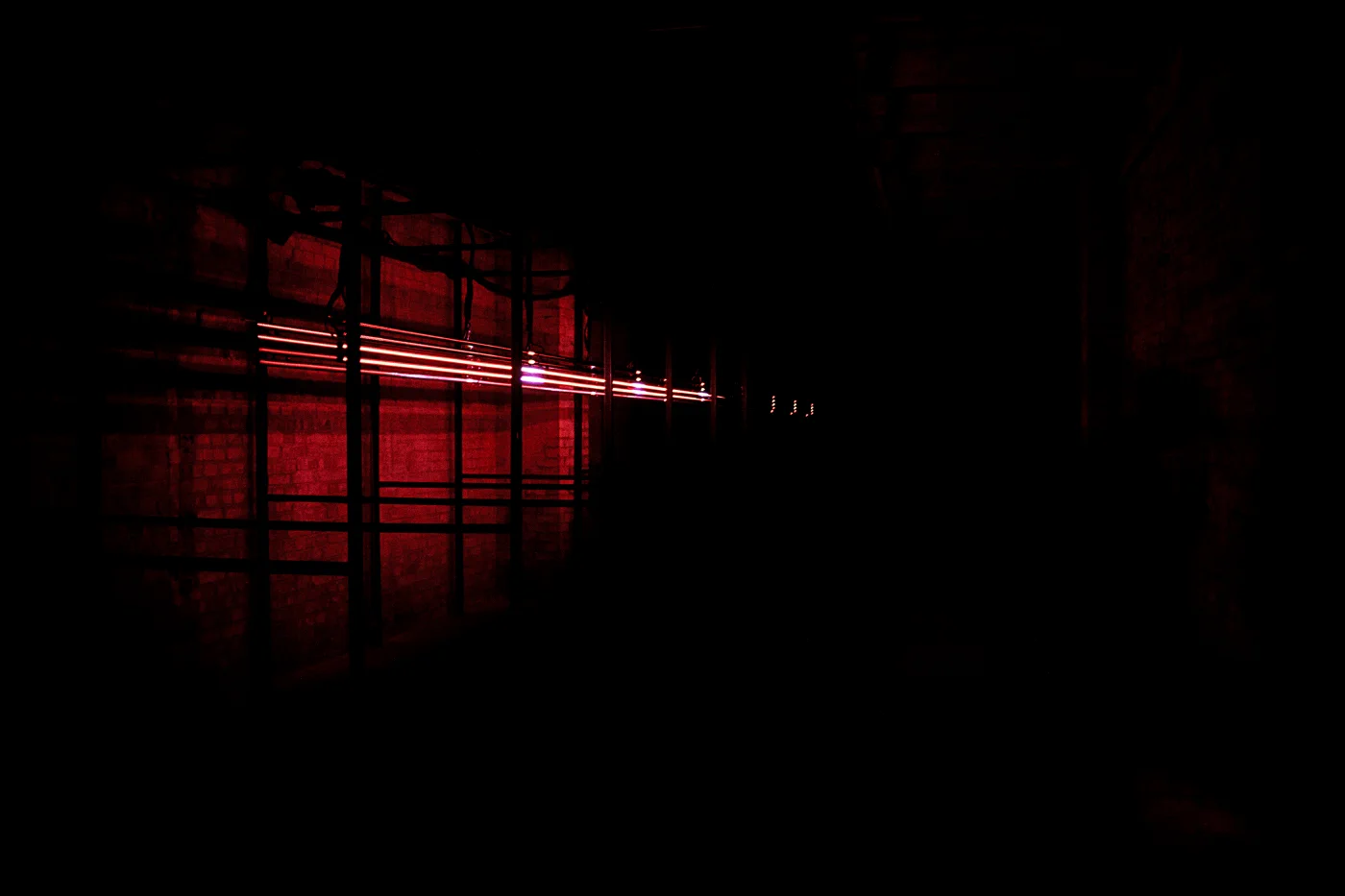 Angekommen in einer in schummrig rotes Licht getauchten, temporär errichteten Bar warten die Besucherinnen und Besucher darauf, dass auf einer digitalen Anzeige die jeweilige Nummer des ausgehändigten Schlüssels aufleuchtet und so der Eintritt signalisiert wird. Die neben dem Display auf einem Banner stehenden Worte „Hello Darkness… my old friend“ – ein Zitat aus dem Lied „The Sound of Silence“ von Simon & Garfunkel – könnte nicht passender gewählt sein. Verschluckt uns doch die Dunkelheit des verstaubten Gemäuers, nachdem wir den Ausstellungsbereich auf ungewöhnlichem Weg – durch einen Kleiderschrank – betreten haben.