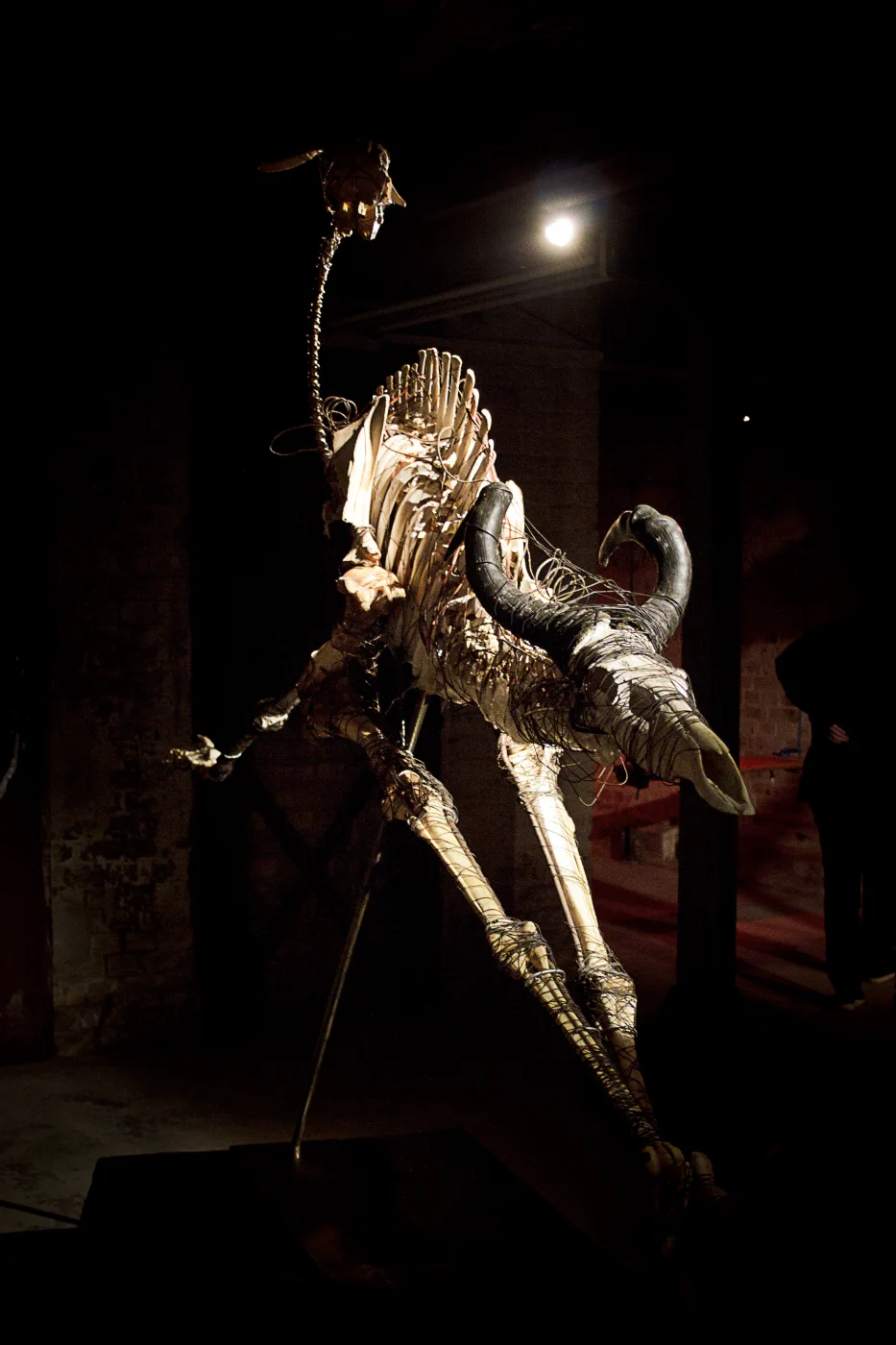 Auf einem Tisch aus Metall liegt eine verkrampft wirkende, mit angewinkelten Beinen zuckende menschliche Gestalt. Im Halbdunkel sind weitere Skulpturen zu erahnen. Eine unheimliche Installation, mit der sich der Steinmetz Matthias Rodach dem Thema „gesellschaftlicher Wandel“ und deren Fragen widmet. In einem hell erleuchteten Raum erwartet uns ein Meer aus weißen Plastiktüten, die zu atmen scheinen. Daneben wurden zwei Skulpturen aus Tierschädeln, Knochen und gesammeltem Plastikmüll aufgestellt. Einen Raum weiter erweckt wechselndes Licht tropfsteinartige Gebilde aus geschmolzenem Plastik zum Leben. Auf mehrere Wände projizierte Videosequenzen zeigen Gewaltexzesse in (demokratisch) gewählten Parlamenten – augenscheinlich ausnahmslos von Männern.