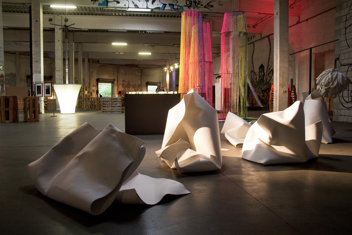 Mit einem abwechslungsreichen Angebot – Fotografie, Malerei, Kunsthandwerk, Holzschnitzereien, Installationen, Tanz und und und – haben es die Veranstalter geschafft, unterschiedlichste Menschen anzusprechen, die neugierig die beiden Hallen durchstreiften. Oder sich im urgemütlichen „Gesellschaftsraum“ in eines der alten Sofas oder einen Sessel niederließen. Ebenso fand die sich daneben befindliche „Palettenlounge“ Gefallen. Einwegpaletten zogen sich wie ein roter Faden durch die Gestaltung und waren in vielfältiger Verwendung überall anzutreffen: als Sitzgelegenheit, Tisch, Absperrung, oder auch als „Wand“ für die Kunstobjekte.