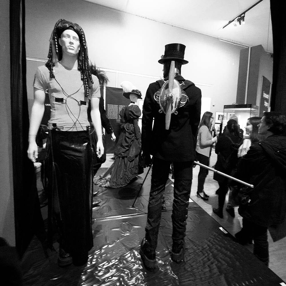 Zugegebenermaßen haben wir die Ausstellung nur oberflächlich in Augenschein nehmen können. Die Menschenfülle und die vielen Gespräche ließen eine eingehendere Betrachtung, für die man sich die nötige Zeit nehmen sollte, nicht zu. In erster Linie ist „Leipzig in Schwarz“ wohl für den interessierten „Normalbürger“ konzipiert. Eine Art „Aufklärung“. Wohltuend unaufgeregt und vielschichtig. Kein Vergleich zu einem Gros der reißerischen und verfälschenden Machwerke vieler Medienvertreter. Sicherlich werden wir die Ausstellung – eine Hommage der Stadt Leipzig an das Wave-Gotik-Treffen, welches in diesem Jahr bereits zum 25. Mal stattfindet – spätestens an den Pfingsttagen noch einmal mit kritischen Augen inspizieren, die einzelnen Schwerpunkte (siehe unten) begutachten und uns auf eine Reise von dem Vorläufer zu DDR-Zeiten, über das Schicksalsjahr 2000 bis in die Gegenwart begeben.