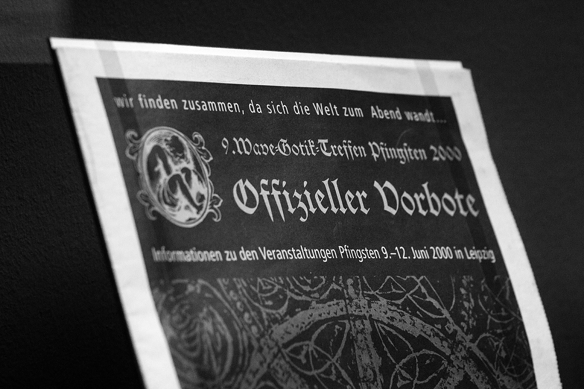 Bei langjährigen Besuchern des Treffens weckten die Ausstellungsstücke manche schöne Erinnerung und so betrachten wir die Exponate lächelnd und mit einem wissenden Kopfnicken. Treffenbecher, Tickets, Programmbücher. Bühnenkleidung von JU Age („Age Of Heaven“) und Oswald Henke („Goethes Erben“) einschließlich der Holzskulptur von Remo Sorge (Kreuzmühle), welche als Bühnendekorationen diente. Einige Leihgaben vom „Schemenkabinett“, die in einer sehenswerten Ausstellung vor einigen Jahren im „Schwarz 10“ gezeigt wurden. Komplette Outfits von Besuchern, wie beispielsweise Karlsson vom Dach mit seinem auffälligen Propeller auf dem Rücken. Videomitschnitte von WGT-Konzerten (u. a. von „Hekate“ und „Front 242“) bringen die für die Szene essentielle Musik näher und rufen ebenso Vergangenes ins Gedächtnis. In Vitrinen fanden wir Bücher, Filme, Schallplatten. Besonders freute uns selbstverständlich ein Stapel des von uns herausgegebenen „Pfingstgeflüster“.