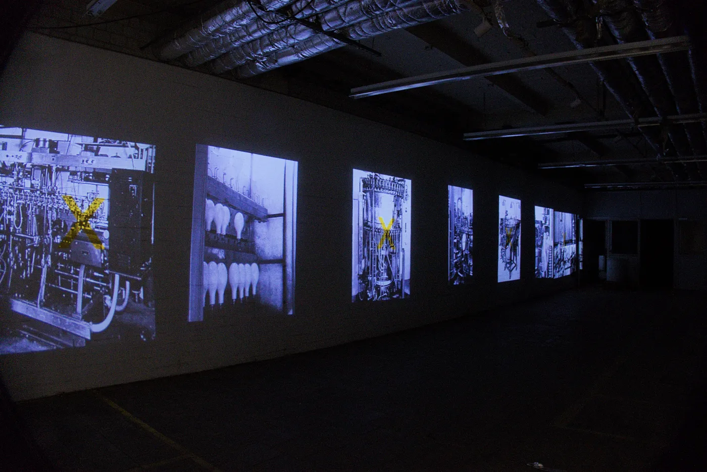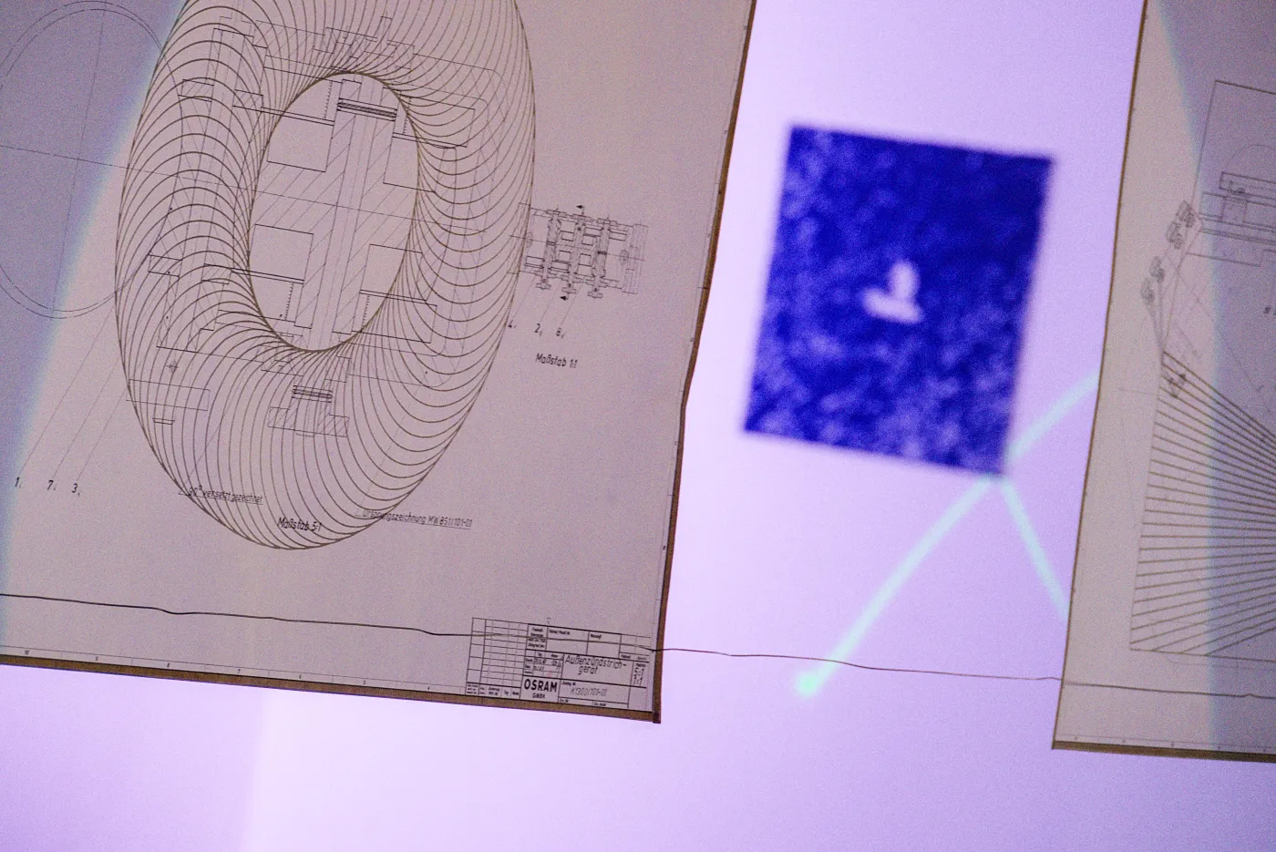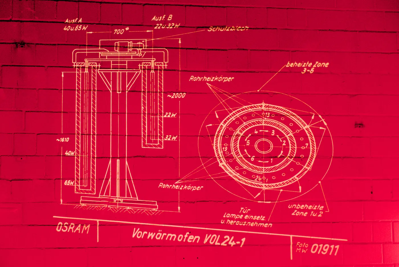 Je tiefer man in das Gebäude vordrang, desto stärker vermischte sich die Geschichte des Ortes mit der Gegenwart. Die Erinnerung an das alte OSRAM-Glaswerk war nicht in einem Block präsentiert, sondern wie Fundstücke über das Gelände verteilt: Dias in Projektoren warfen Gesichter und Maschinen vergangener Jahrzehnte über Wände. Alte Fensterrahmen, gefüllt mit zahllosen Fotografien, ergaben in einem kleinen, fast versteckten Raum ein wildes, faszinierendes Bild. Konstruktionszeichnungen wurden an die Wände einer rot erleuchteten Bar projiziert. So verwoben sich fast hundert Jahre Industriegeschichte mit der temporären Kunstlandschaft des Festivals.