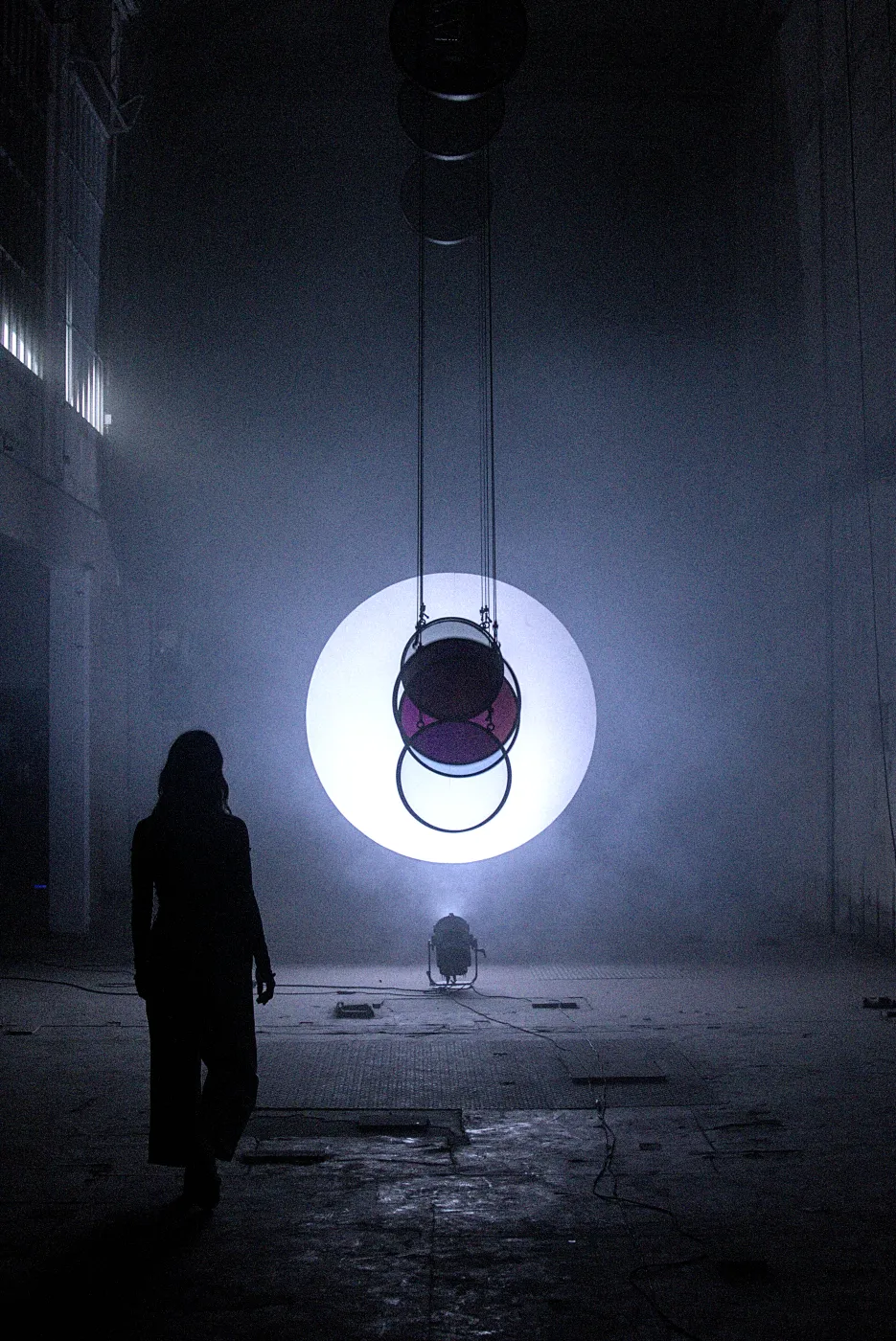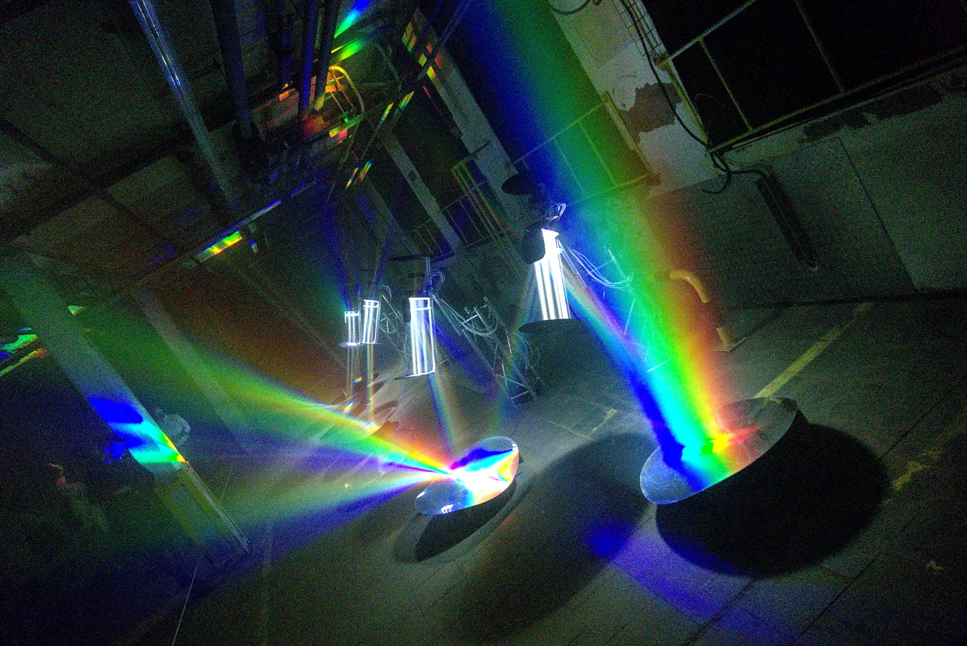 Neben diesen persönlichen Highlights eröffneten weitere Arbeiten immer wieder neue Perspektiven auf Raum, Licht, Klang und die Ideen der Künstlerinnen und Künstler. Einige Werke spielten mit Farbe und Licht: Solis vom Studio Sven Sauer etwa ließ bewegliche Filter überlagern, sodass laufend neue Farbnuancen entstanden – ein subtiler, fließender Farbkosmos, der fast meditative Momente schuf. Implausible Rainbows von Lukas Truniger und Bruce Yoder erzeugte mit Licht, Nebel und Optiken greifbare Regenbögen. Adsum in Situ vom Encor Studio arbeitete mit Lichtstreifen auf quadratischen Plexiglasplatten, mal durchsichtig, mal erleuchtet, wodurch kurze, flüchtige Momente aufleuchteten und wieder verschwanden.