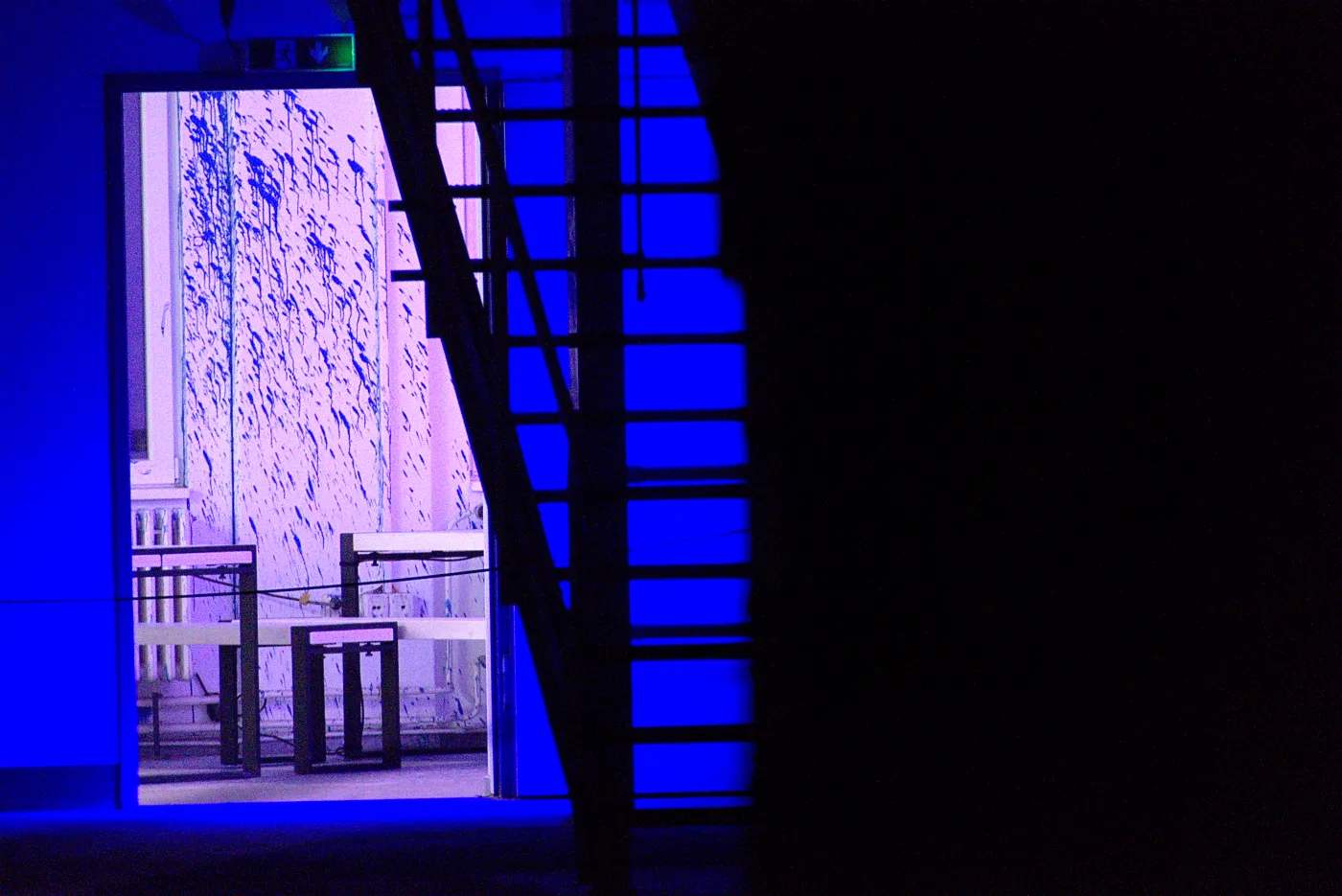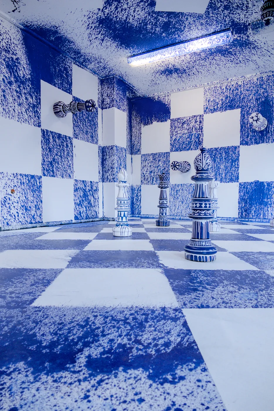 Auf eine ganz andere Art und Weise beeindruckte No Kings in Our Castle von Sven Uwe Kaiser. Teile des Fußbodens, der Wände und der Decke waren mit einem blau-weißen Schachbrett versehen, einige Spielfiguren verteilt – doch die Könige fehlten. Keine Hierarchie, keine Krone. Politisch ein Kommentar auf Machtfantasien und den fragilen Zustand der Demokratie, wirkte die Arbeit für mich vor allem ästhetisch: das klare Raster, die subtilen Farbspritzer, die das Muster im Raum fortführten, erzeugten eine überraschende Irritation und Schönheit zugleich.