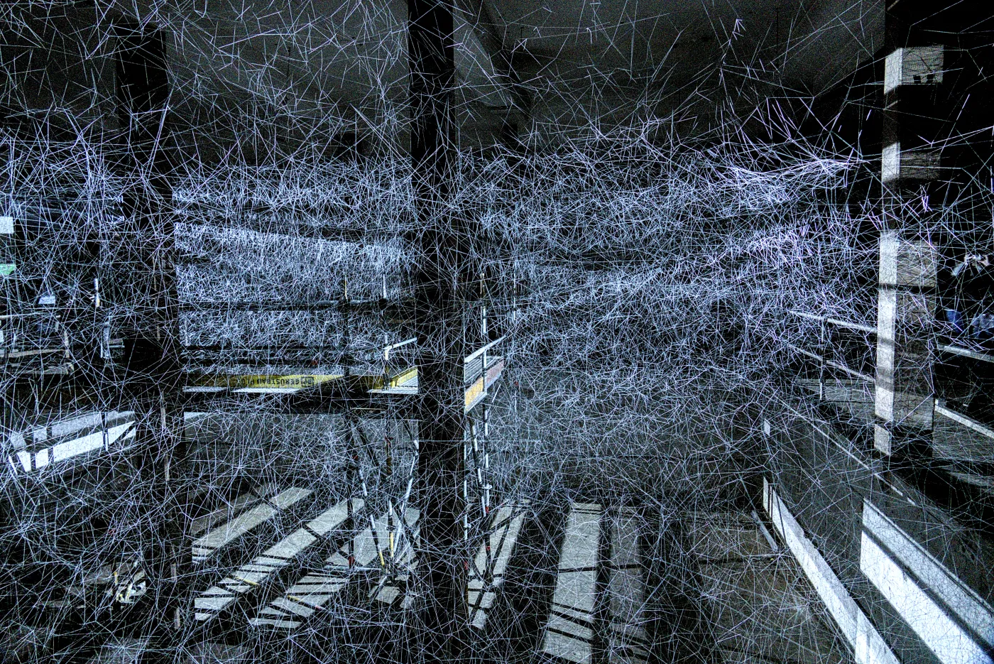 Für einen besonders einprägsamen Moment sorgte Yasuhiro Chidas Analemma. Kilometerweise Garn war zu einem polygonalen Geflecht gespannt, das anfangs nur erahnt werden konnte. Licht „tanzte“ über die Fäden. Mal wirkten es wie Glühwürmchen, mal wie Datenströme, die durch das Netz jagten. Klang und Licht erzeugten eine mitreißende Dynamik, bis plötzlich eine alles durchdringende Helligkeit das gesamte Netz für einen Wimpernschlag komplett enthüllte – ein Moment, der Staunen und die Frage hinterließ, wie viele Stunden Arbeit in dieser faszinierenden Installation stecken.