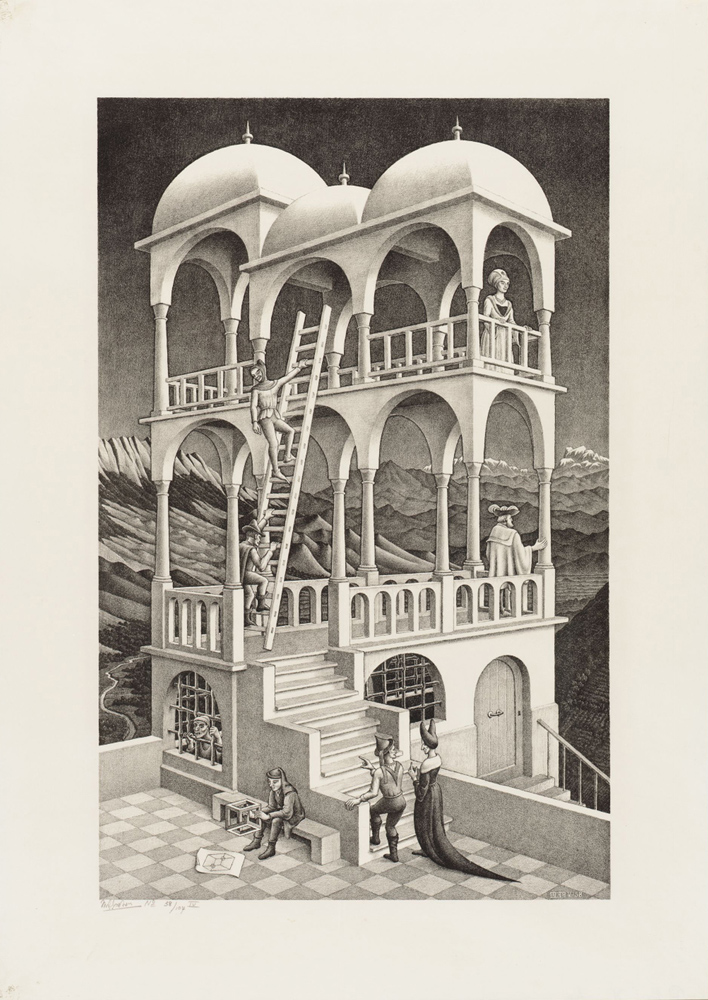 „Escher bekannte 1965 in seiner Rede anlässlich der Verleihung des Hilversumer Kulturpreises: ‚Ich kann es nicht lassen, ich muss mich einfach über all unsere unerschütterlichen Überzeugungen lustig machen. Es ist zum Beispiel ein großer Spaß, die Zwei- und die Dreidimensionalität, das Flache und das Räumliche miteinander zu vermischen oder mit der Schwerkraft Schabernack zu treiben.‘“