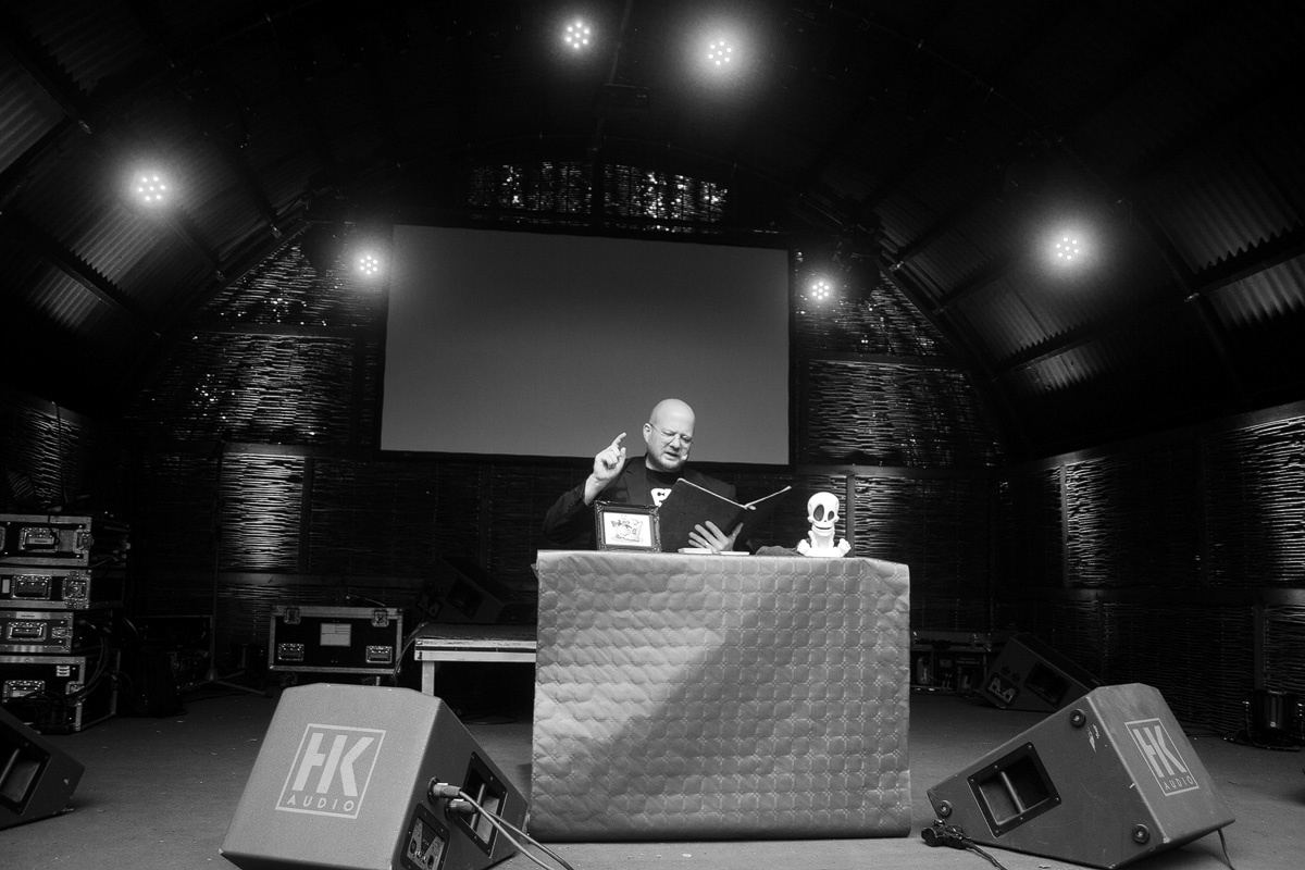 Neben den zahlreichen Konzerten standen jeweils zur Mittagszeit zwei Lesungen auf dem Programmplan. Kurz bevor Christian von Asters Lesung beginnen sollte, hatten sich gerade einmal sechs Personen vor die Kulturbühne eingefunden. Eigenartig. Erfreuen sich astersche Texte und Lesungen doch für gewöhnlich großer Beliebtheit. Nach und nach erschienen aber weitere Interessierte, so dass Herr von Aster seine hervorragenden Texte über die Beobachtungen und Erlebnisse einer Elfe, eine Liebesbrieftaube auf Arbeitssuche und die dramatischen Geschehnisse rund um die Mitternachtshüpfburg einer in Anbetracht der frühen Zeit respektablen Anzahl Lauschwilliger vortragen konnte. Ein perfekter Einstieg in einen langen Festivaltag.