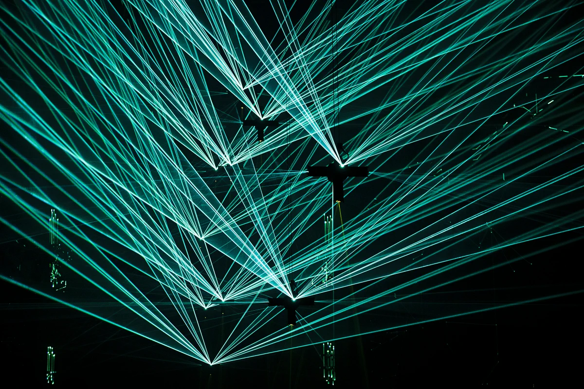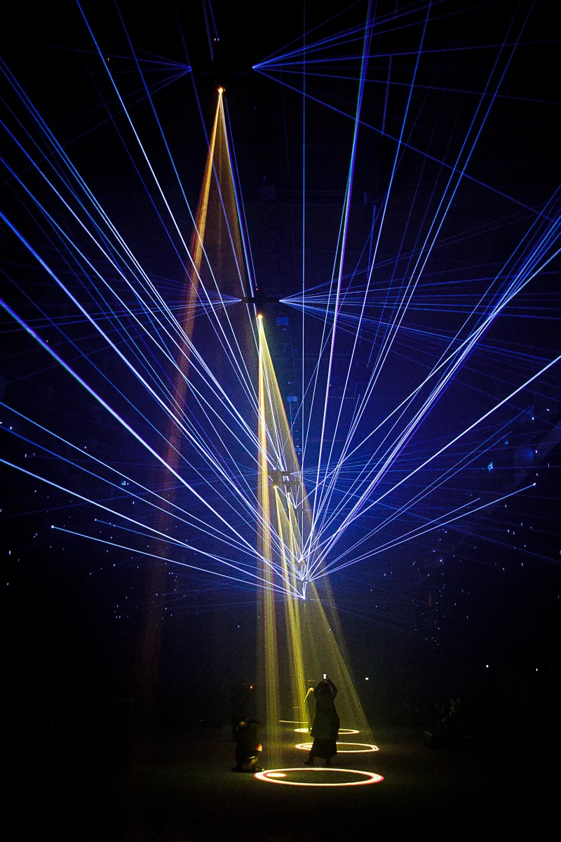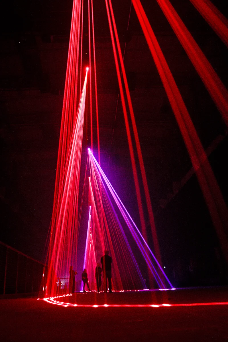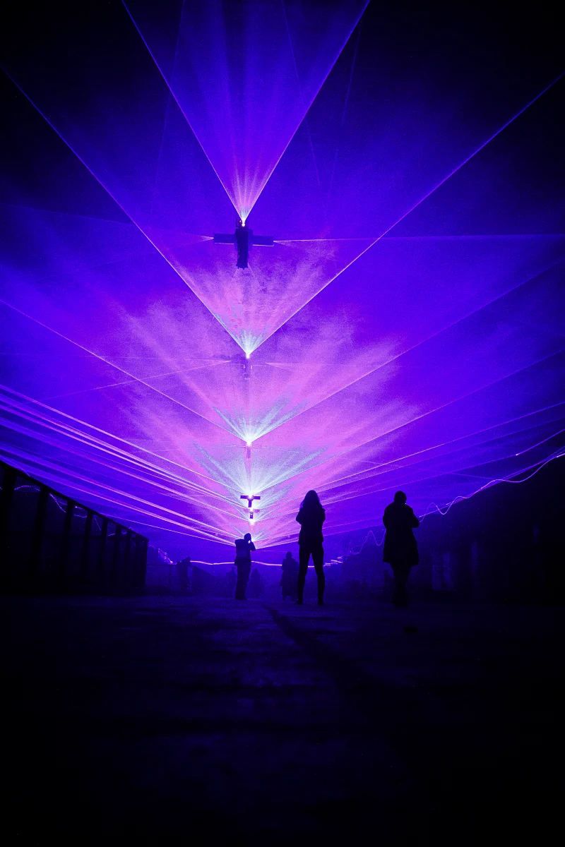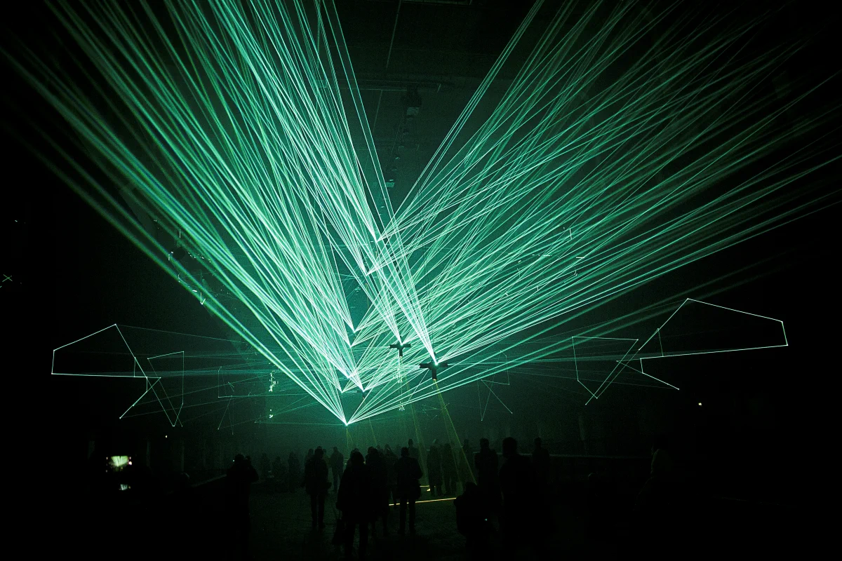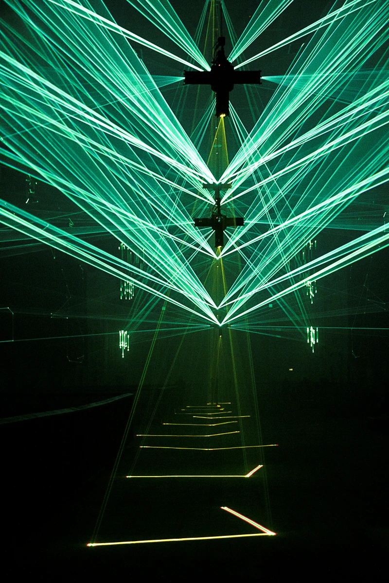 Der Lichtkünstler Christopher Bauder lädt die Besucherinnen und Besucher des ehemaligen Berliner Heizkraftwerks Mitte auf eine Reise durch seine persönliche Vergangenheit ein. 50 bewegliche, mittels eines Präzisionsmotorwindensystems gesteuerte Laser sorgen für irisierendes Licht, farbige Spots und Projektionen. Die großformatige kinetische Lichtinstallation verschmilzt mit einem von Bauder selbst erstellten Soundtrack. Die sich bietenden technischen Möglichkeiten wusste Bauder hierbei hervorragend zu nutzen: Obwohl er kein Instrument beherrscht oder Noten lesen kann, sind es gerade die Klanglandschaften, die „Vektor“ zum Leben erwecken. Abstrakt und doch immer wieder mit konkreten Anspielungen und Hinweisen: „So entführen die fernen Kirchenglocken in Bauders Kindheit auf dem Land, das Rauschen des Meeres auf seine Insel der Sehnsucht und die Anleihen an frühe Techno-Tracks illustrieren die durchtanzten Nächte im Berliner Underground der späten 90er Jahre.“ 1 Diese Klangcollagen erfüllen den riesigen Raum des Kraftwerks eindrucksvoll. In dem an eine Kathedrale mit Mittel- und Seitenschiffen erinnernden und vollkommen vom Tageslicht abgeschirmten Raum sorgen zahlreiche Boxen für einen großartigen Klang. Es waren insbesondere diese voluminösen Sounds, die mich erfassten und unterschiedliche Stimmungen auslösten.